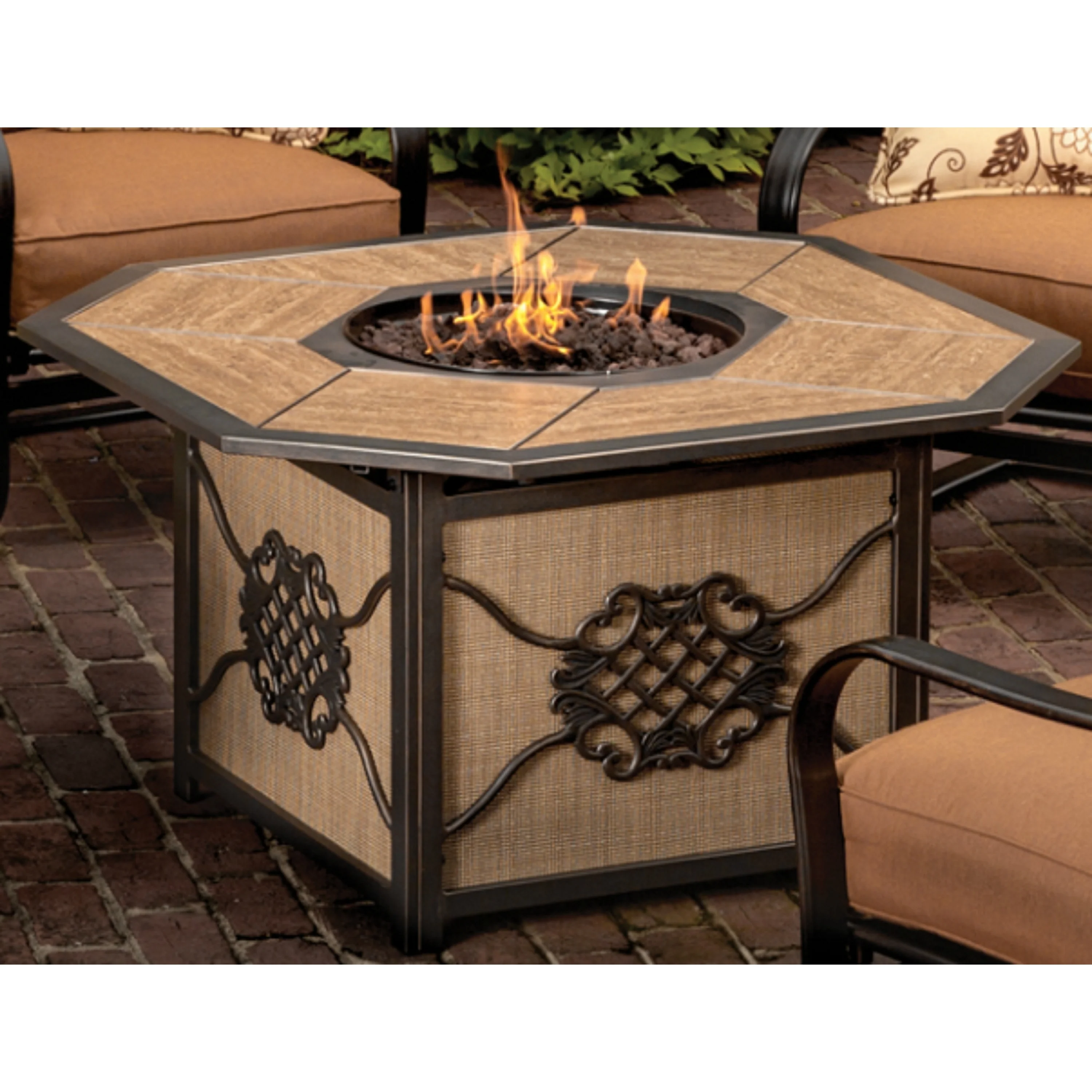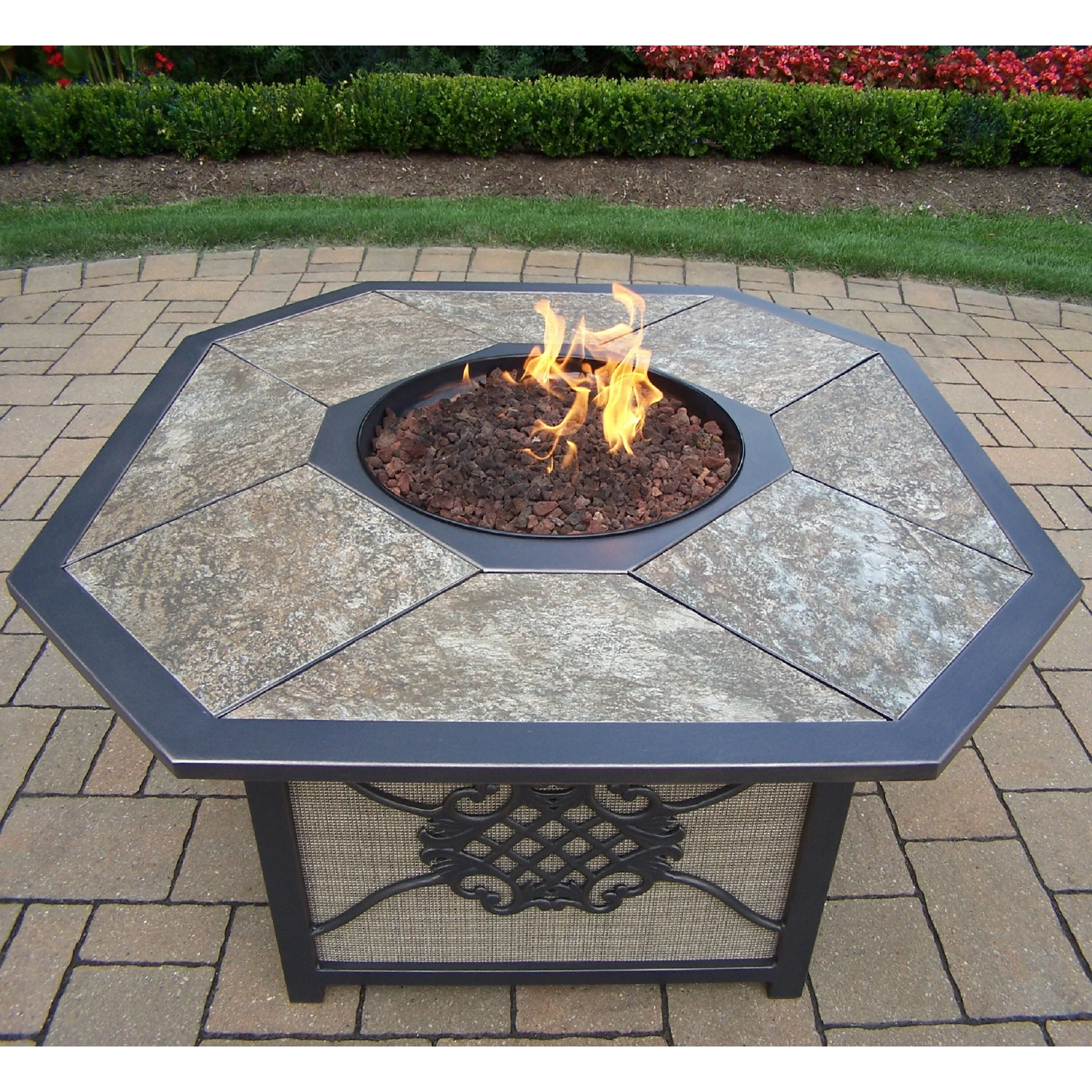 Premium Classic Octagon Gas Fire Pit Table with Porcelain top, Aluminum Frame, and Red Lava Rocks in Grey