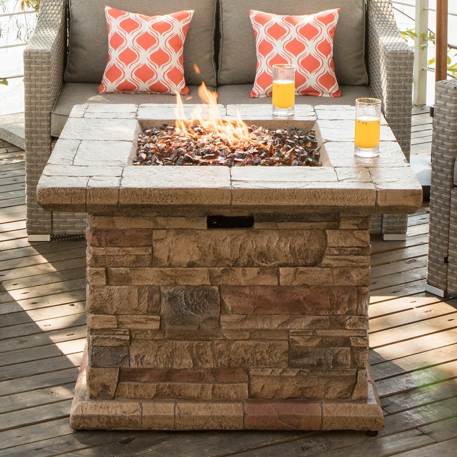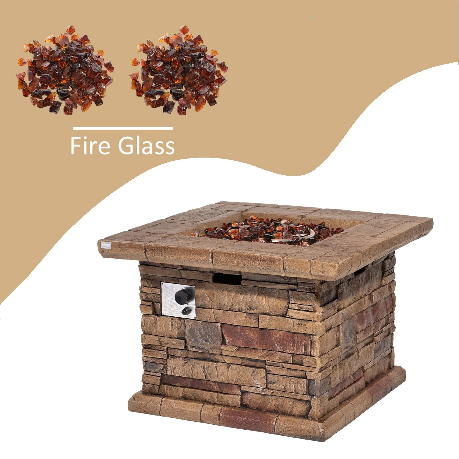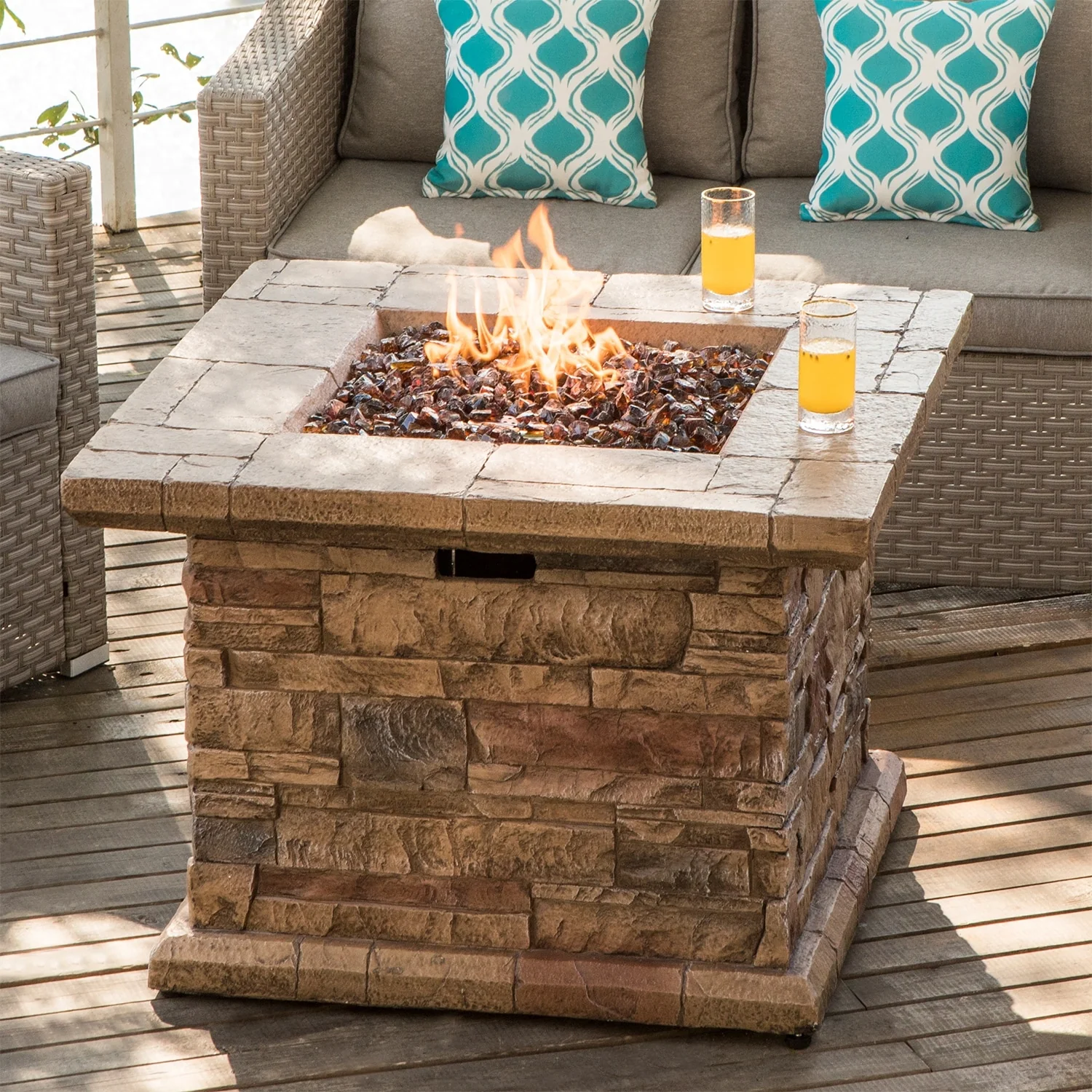 COSIEST Outdoor Square Propane Fire Pit Table w Faux Brown Ledgestone - 32" W x 32" D x 25" H