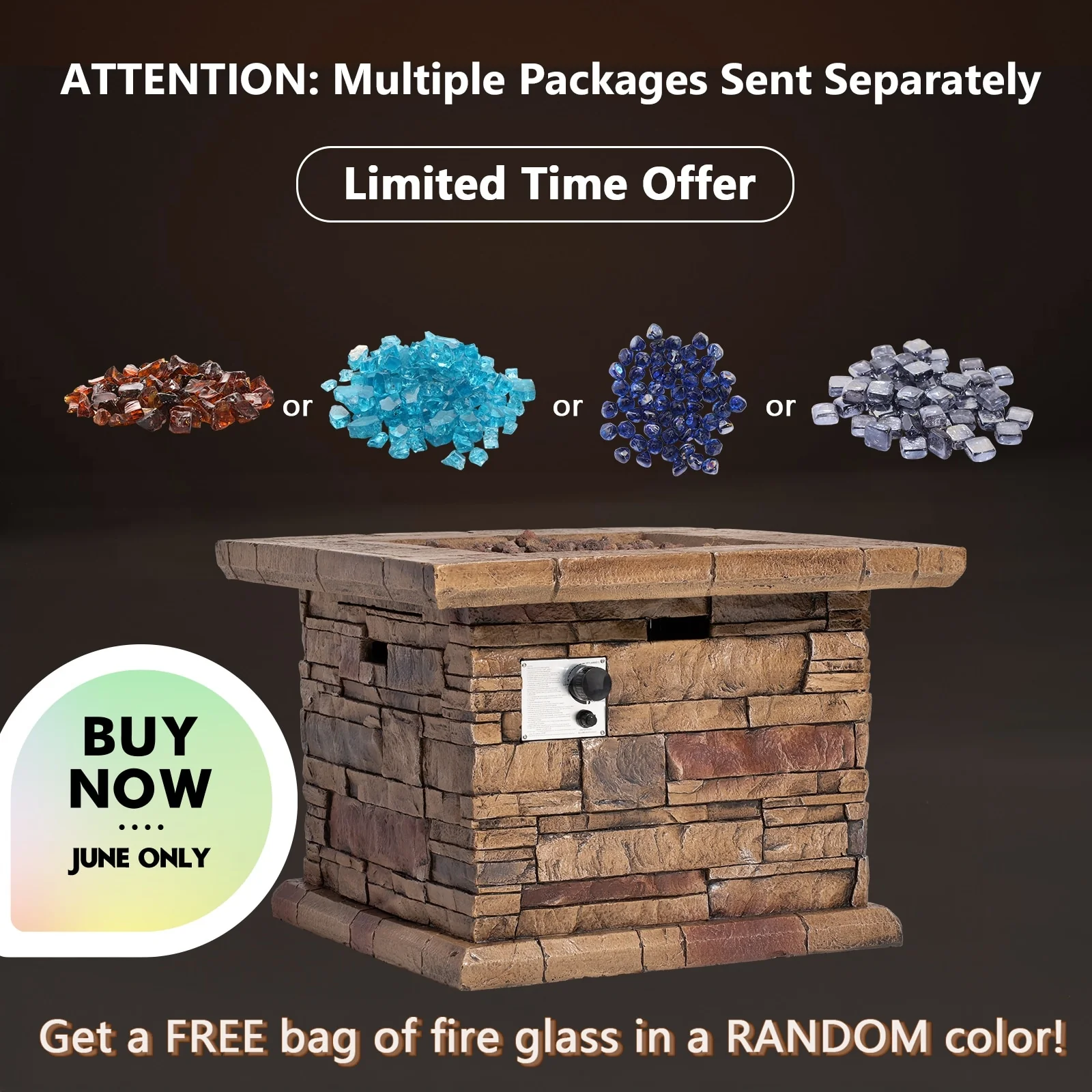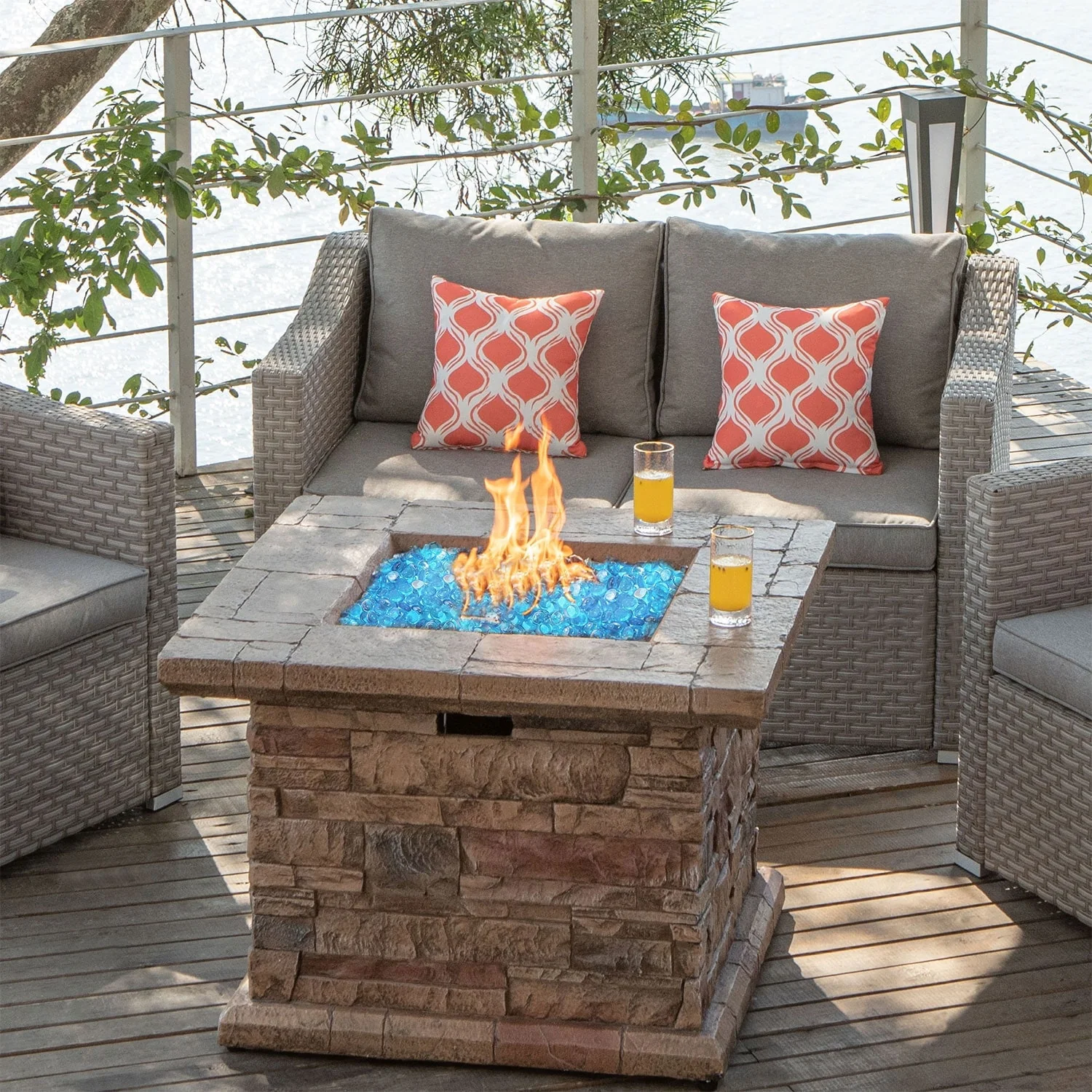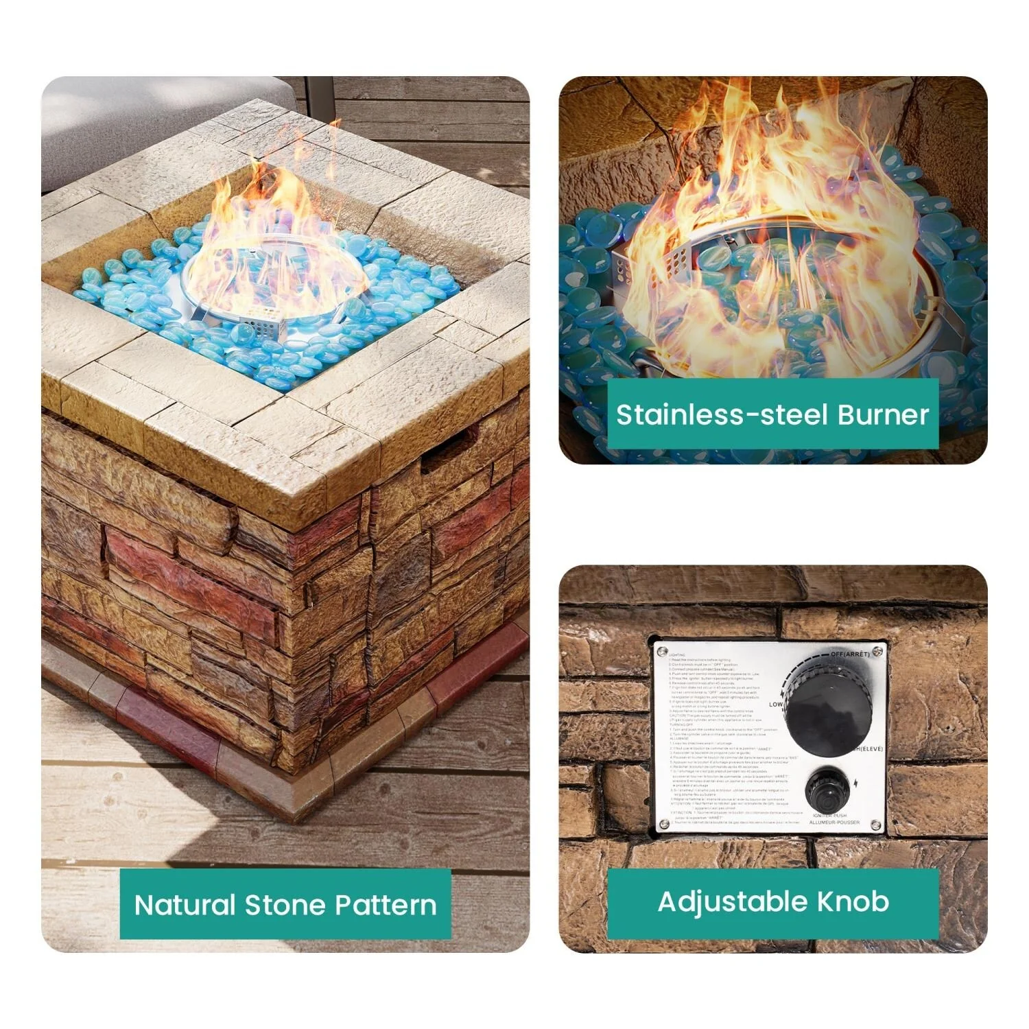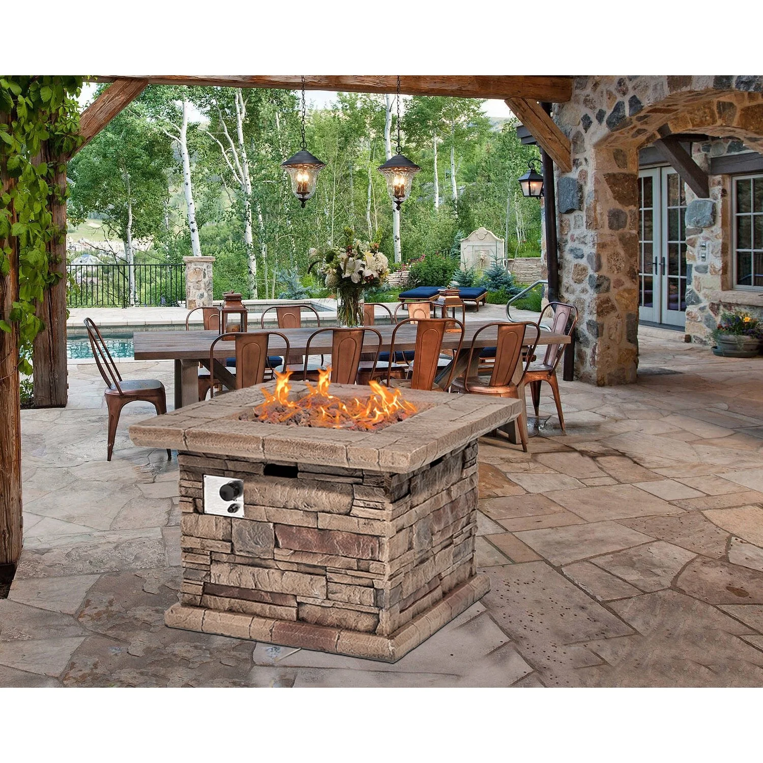COSIEST Outdoor Square Propane Fire Pit Table w Faux Brown Ledgestone - 32" W x 32" D x 25" H