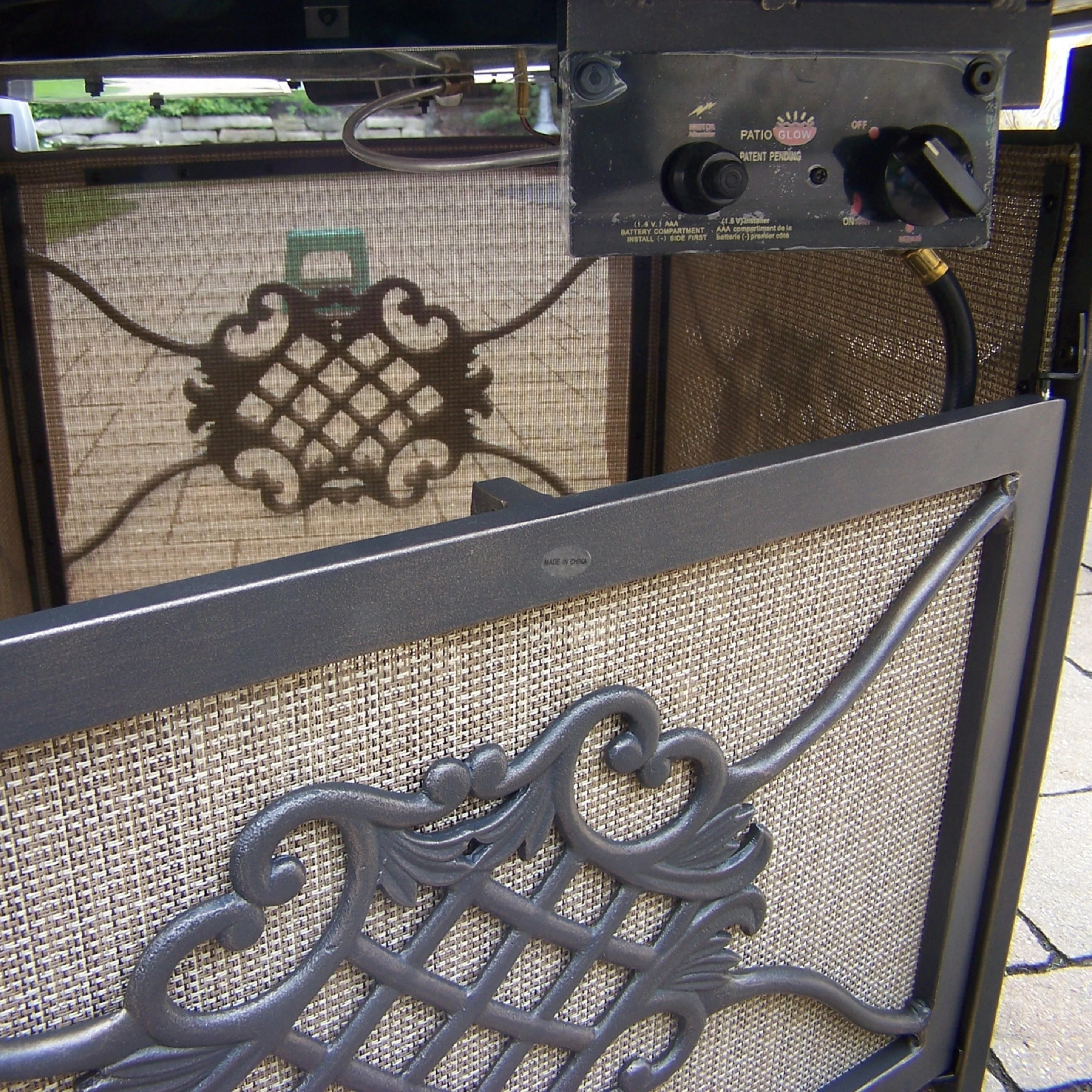 Patio Watcher Outdoor 42in. Iron Fire Pit Table with Propane Tank Cover and Glass Wind Guard