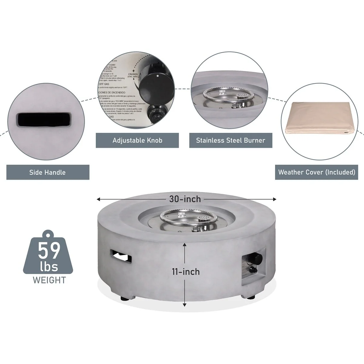 Round Propane Fire Pit Table With Assemblable Tank Cover, Concrete Fireplace 25" W, Cover Gray - 25" W x 25" L x 13.4" H