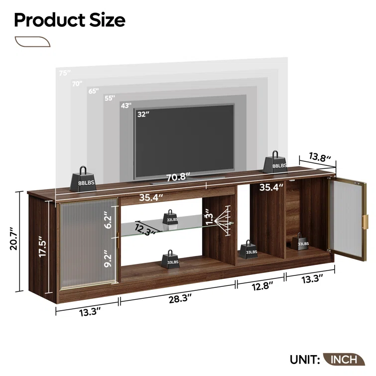 Carlei 70Inch LED TV Stand for 75inch TVs, TV Console with Storage, Media Console with Adjustable Shelf