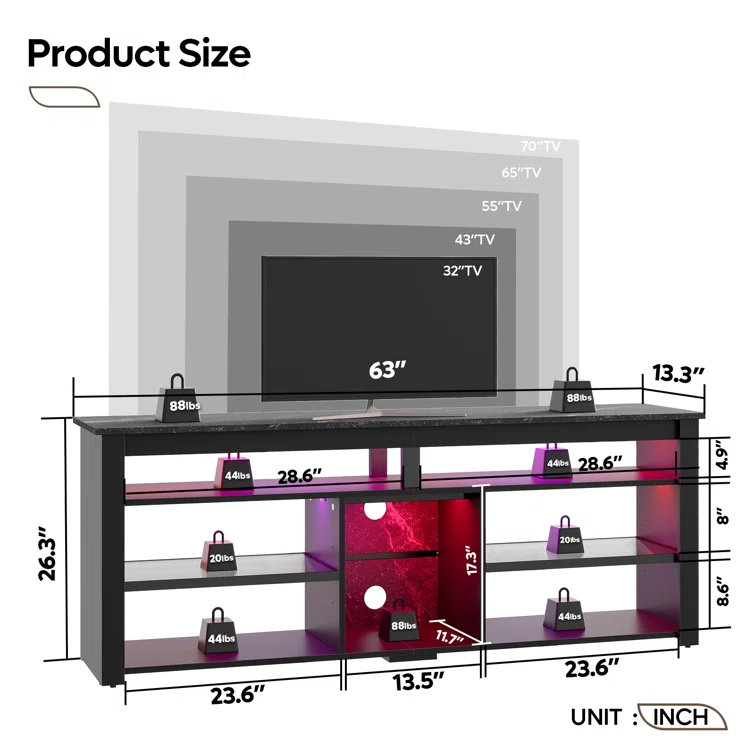 Benigno TV Console for 65/70 inch TV, Tall TV Stand with 2 Led Lights,63" Media Console with Adjustable Acrylic Shelves