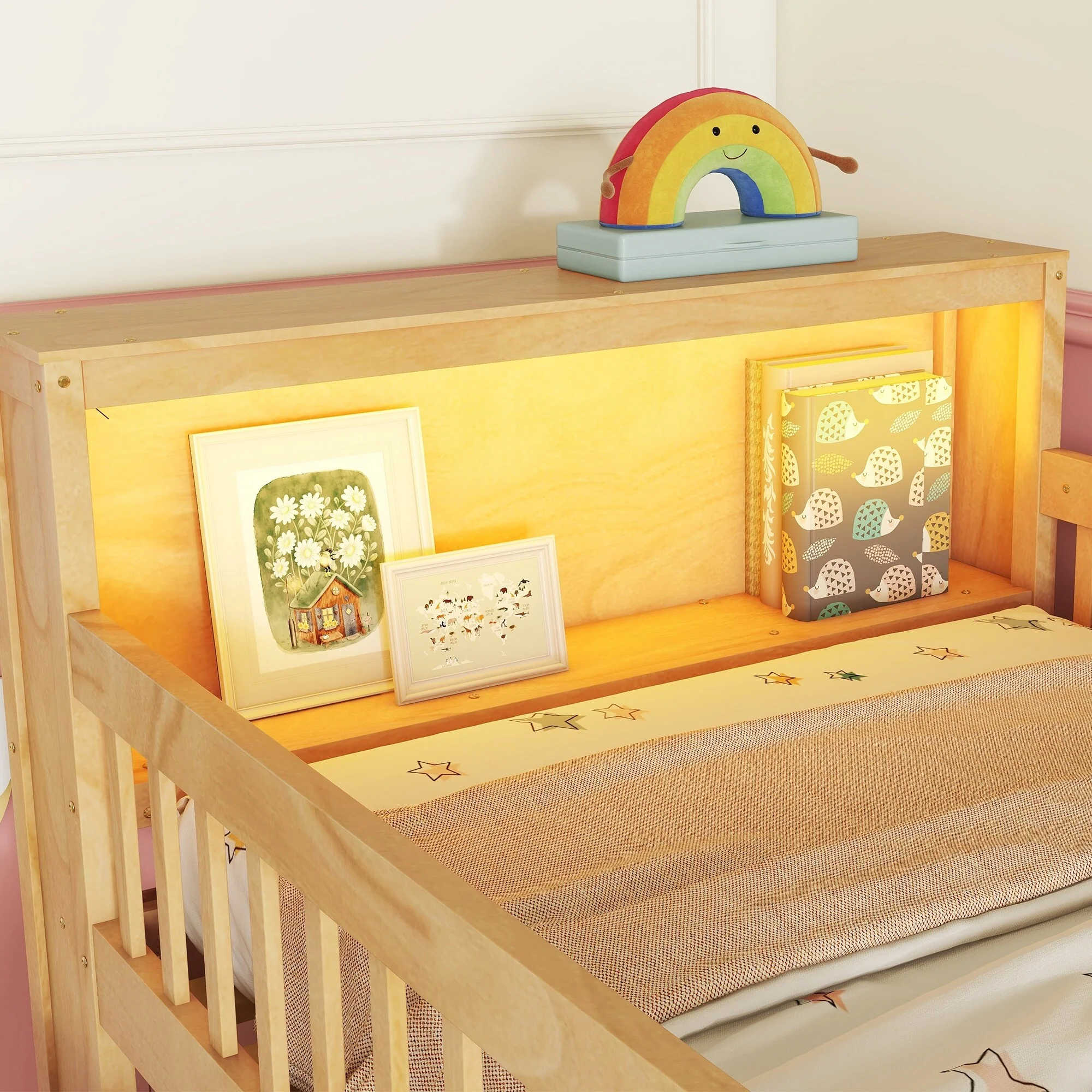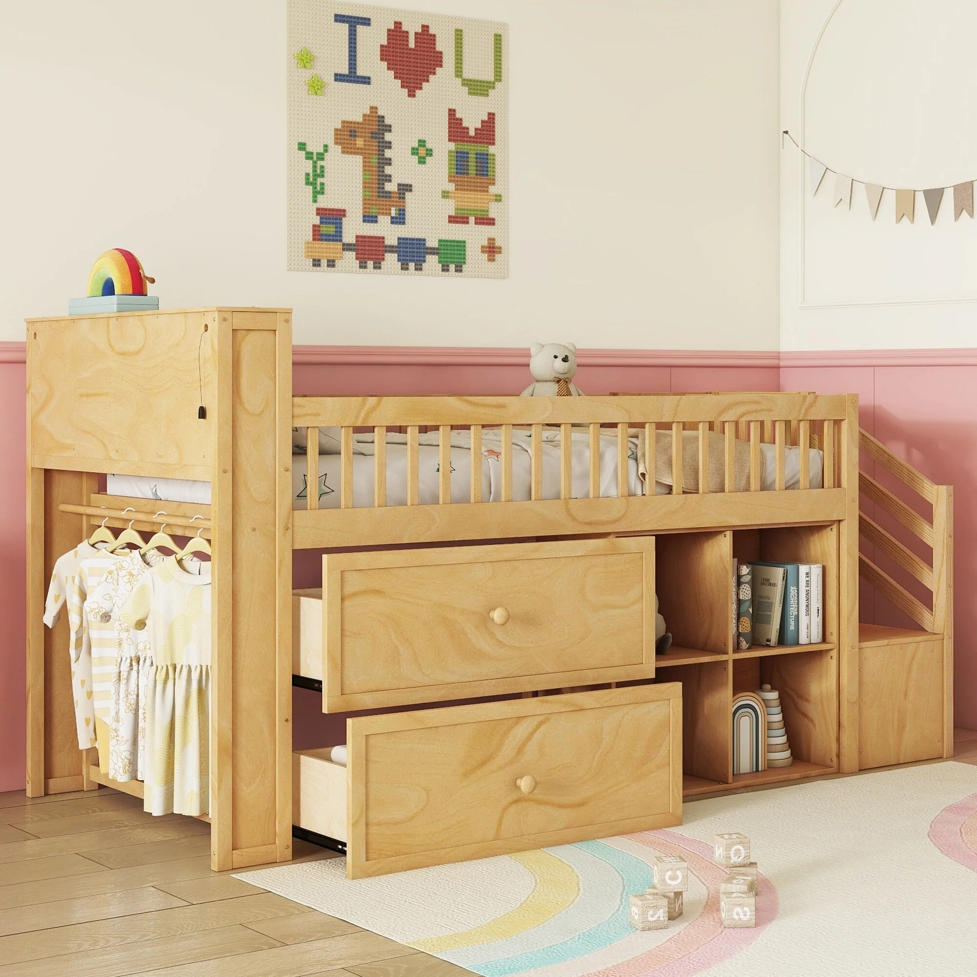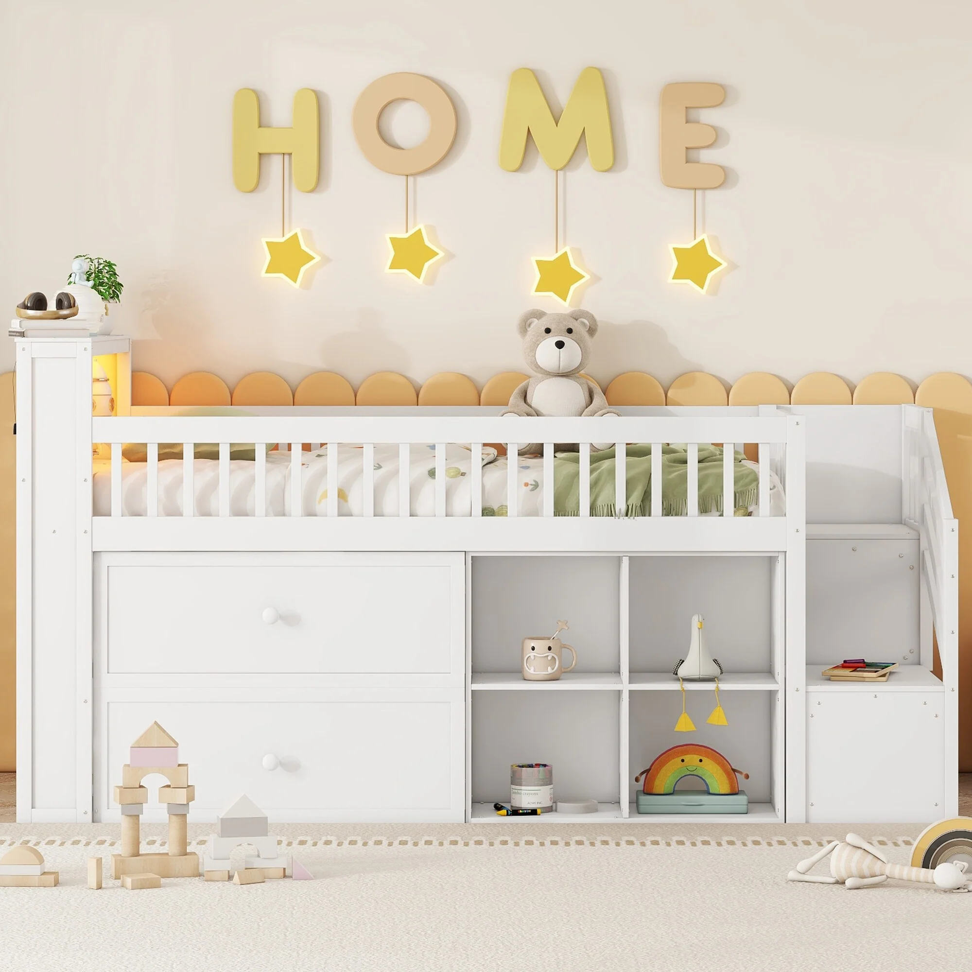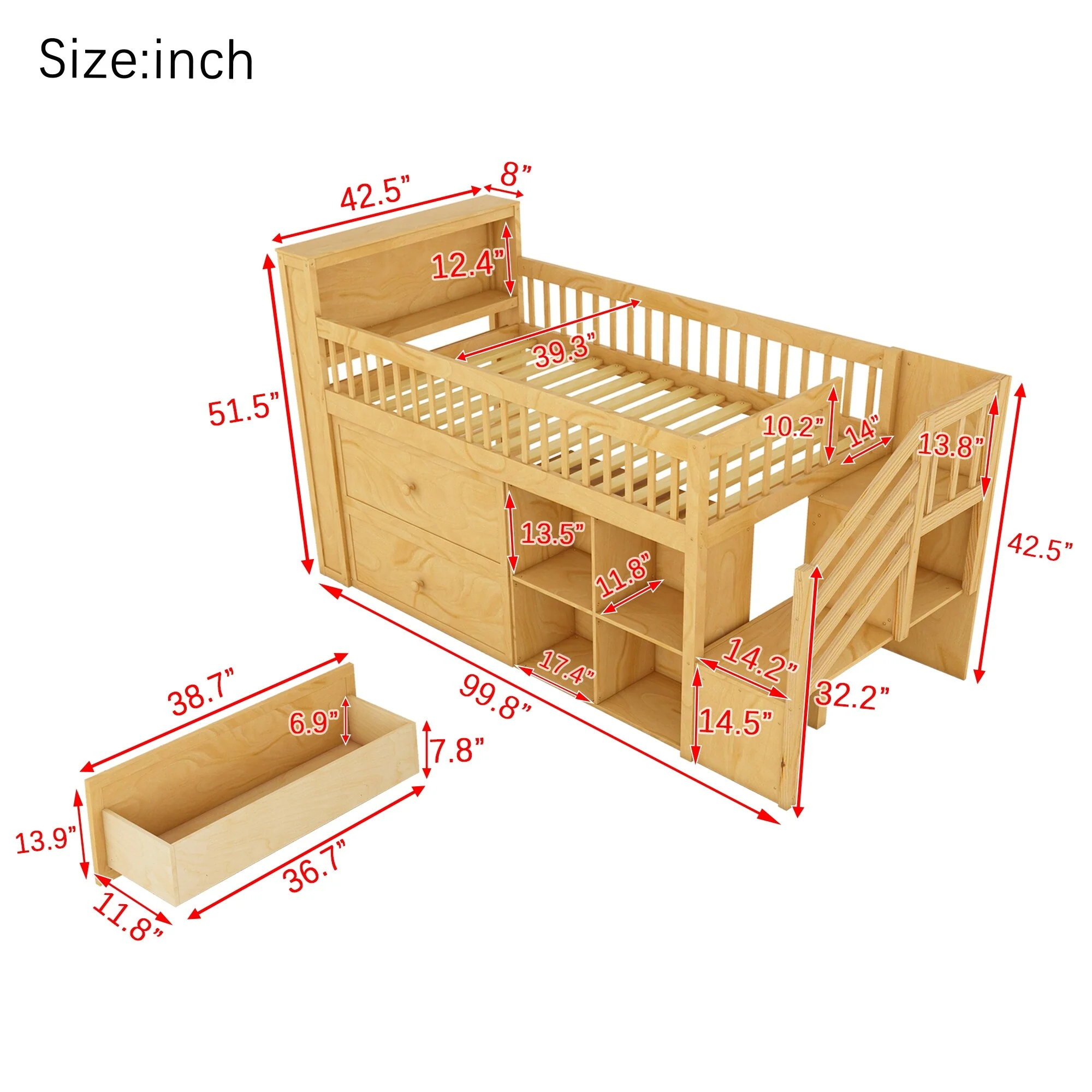 Wood Twin Loft Bed with LED Bookshelf, Storage Stairs, Drawers & Shelves, Guardrails and Hanging Rod