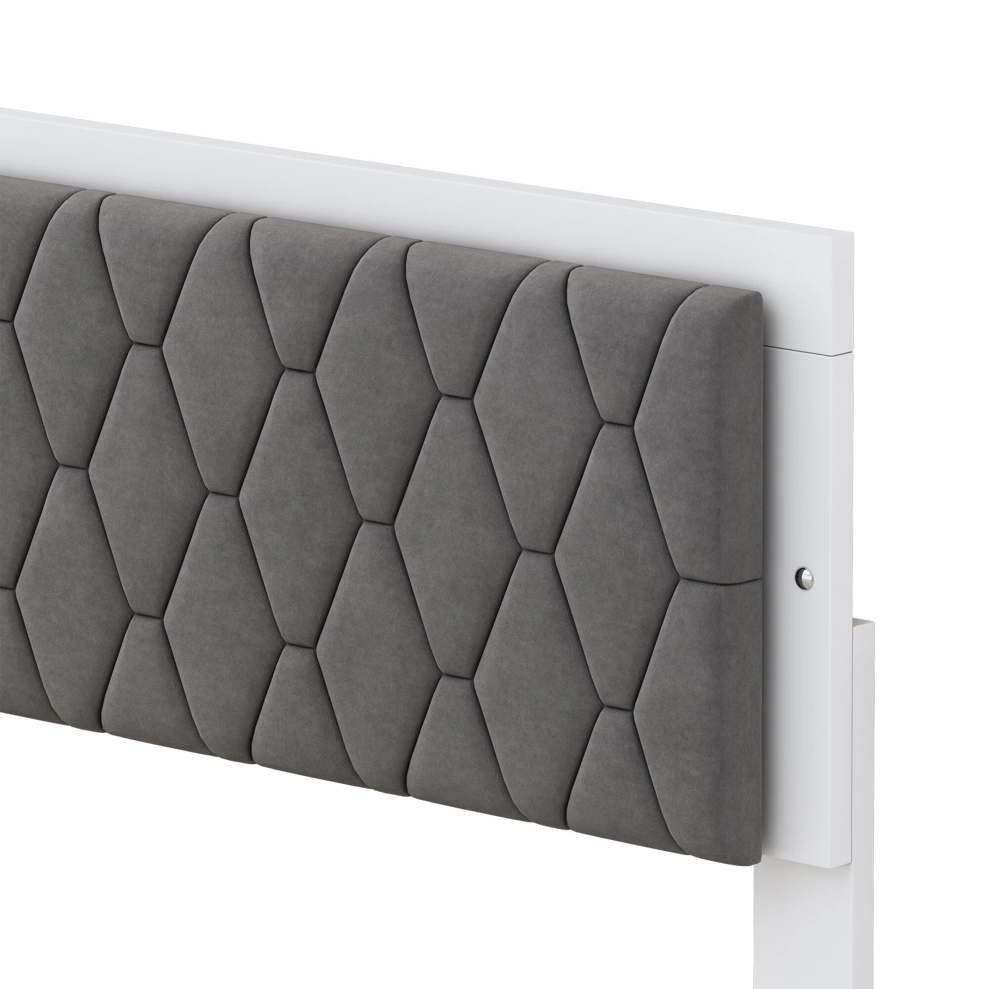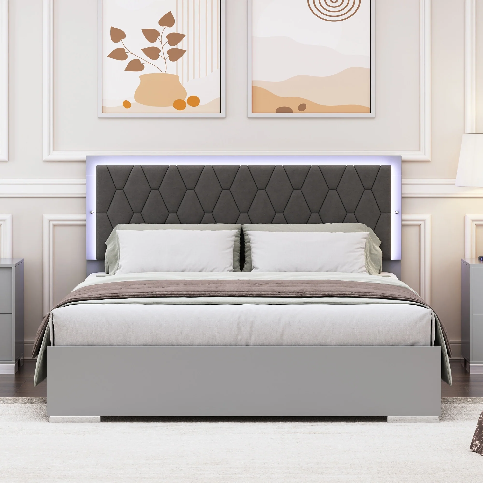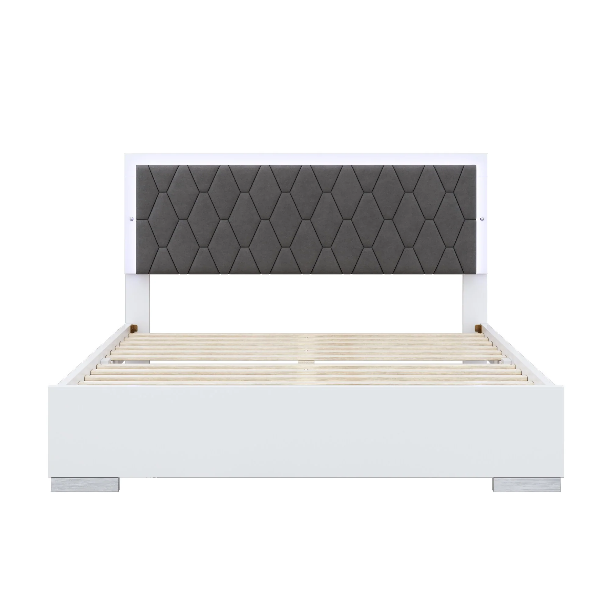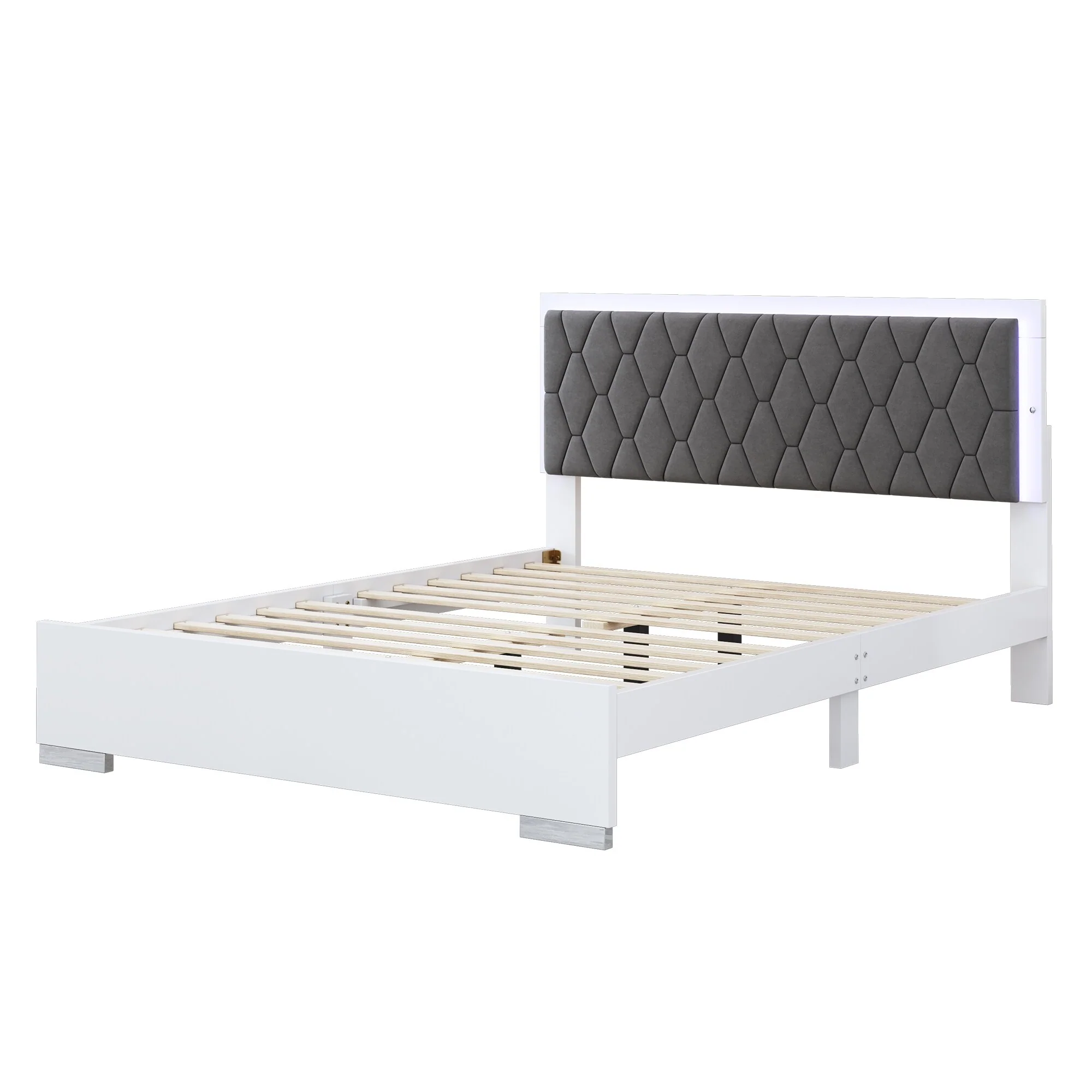 Queen Size Upholstered Bed with LED Lights and Velvet Headboard, White