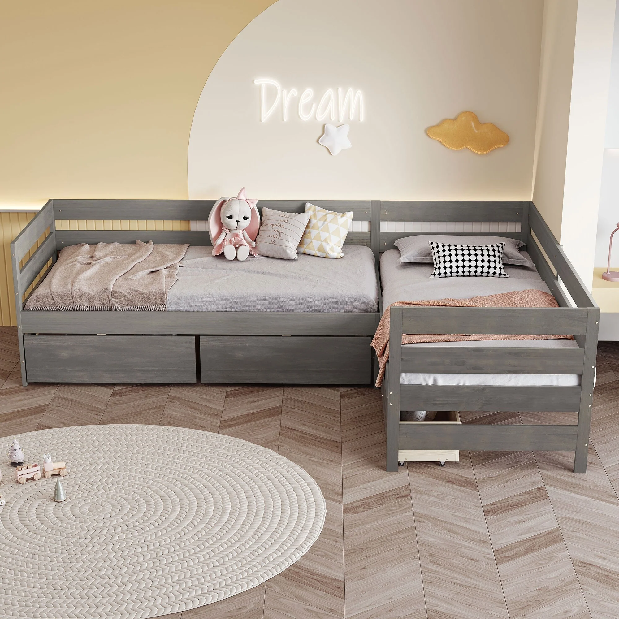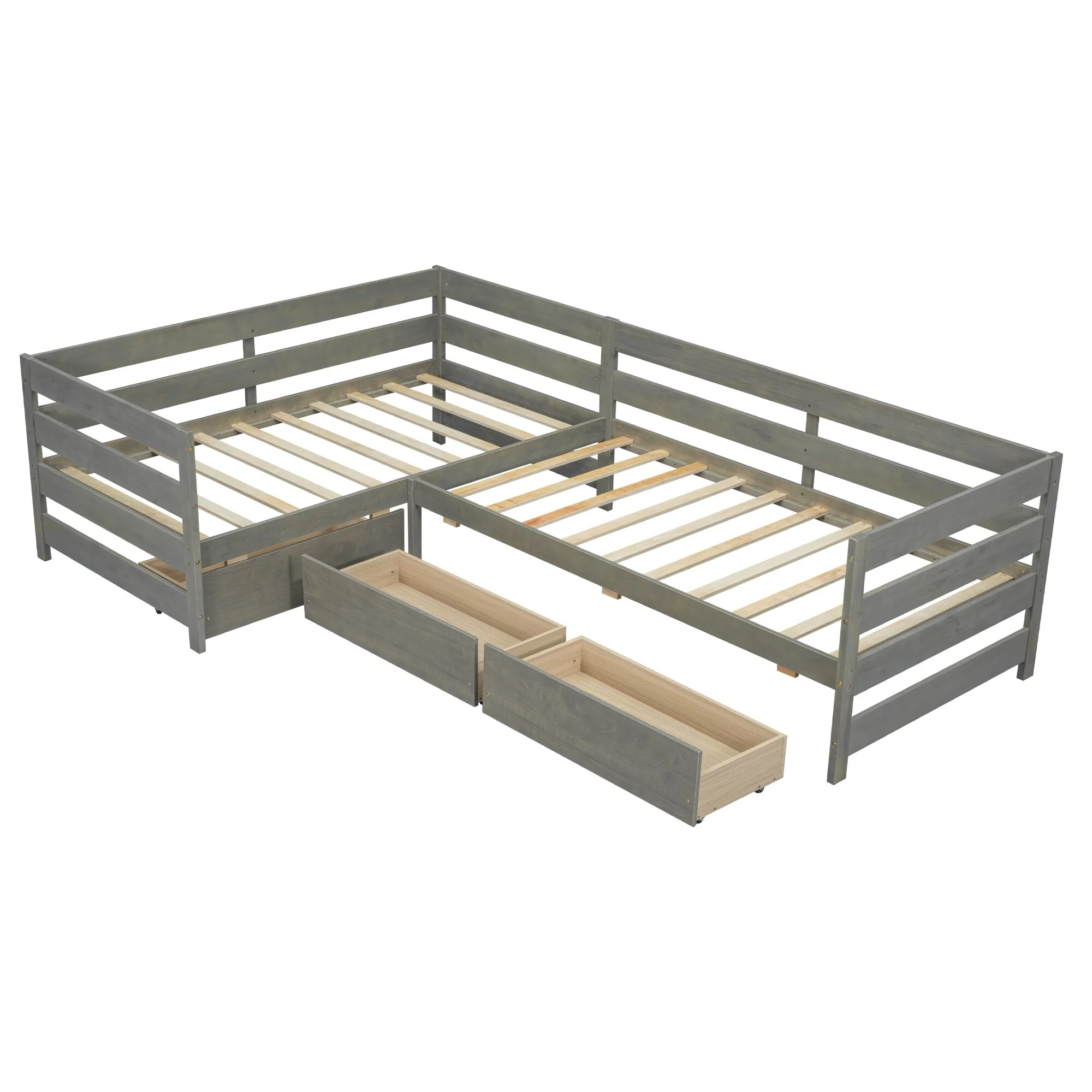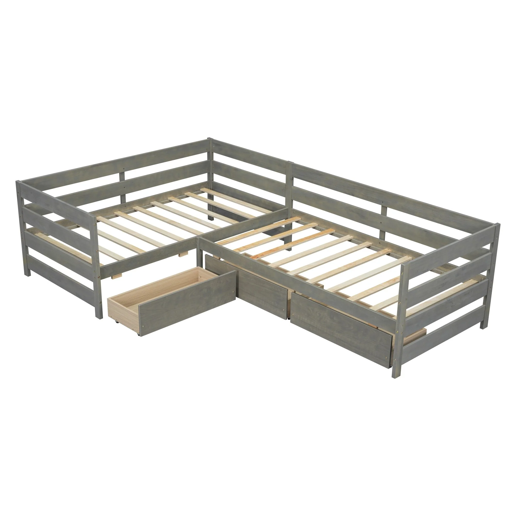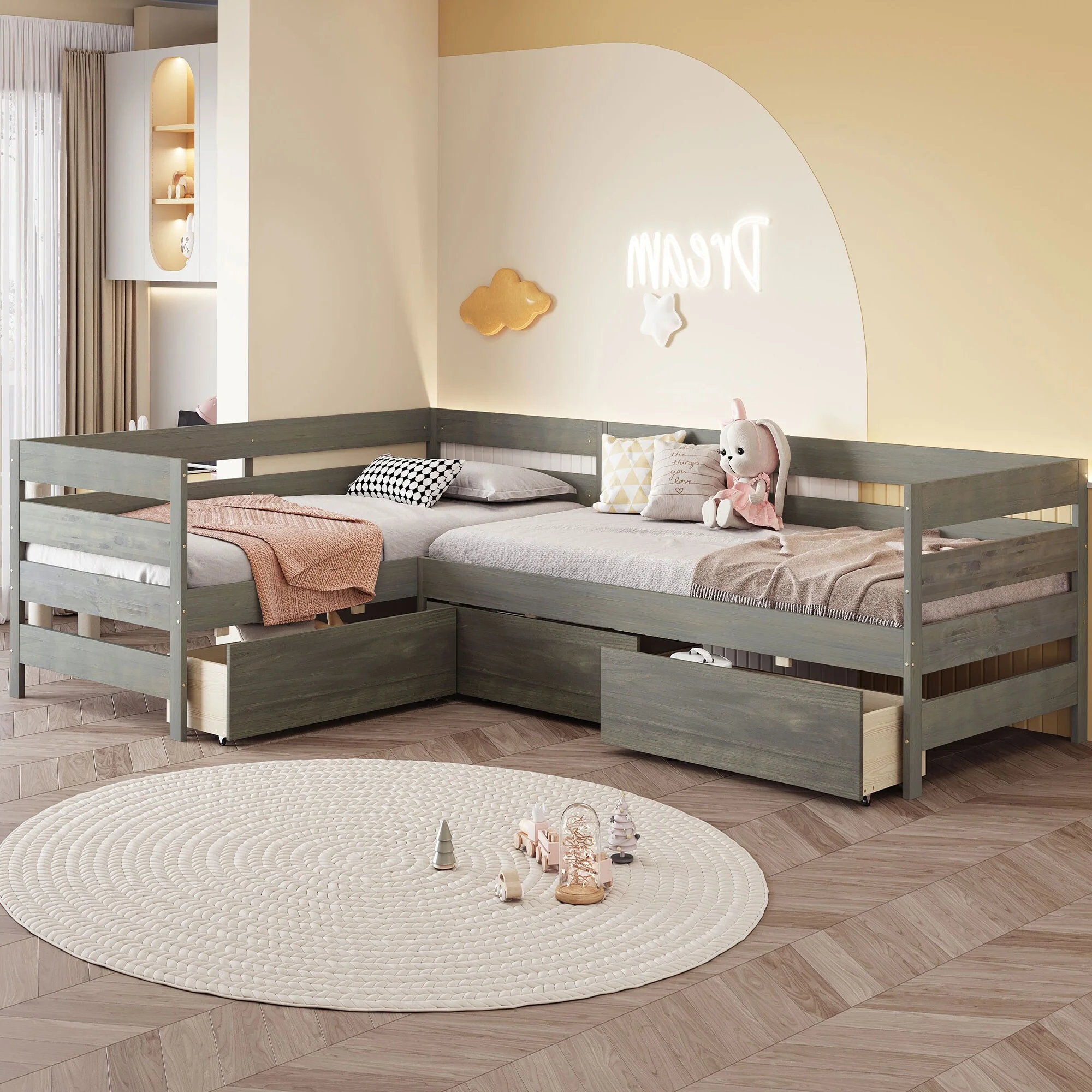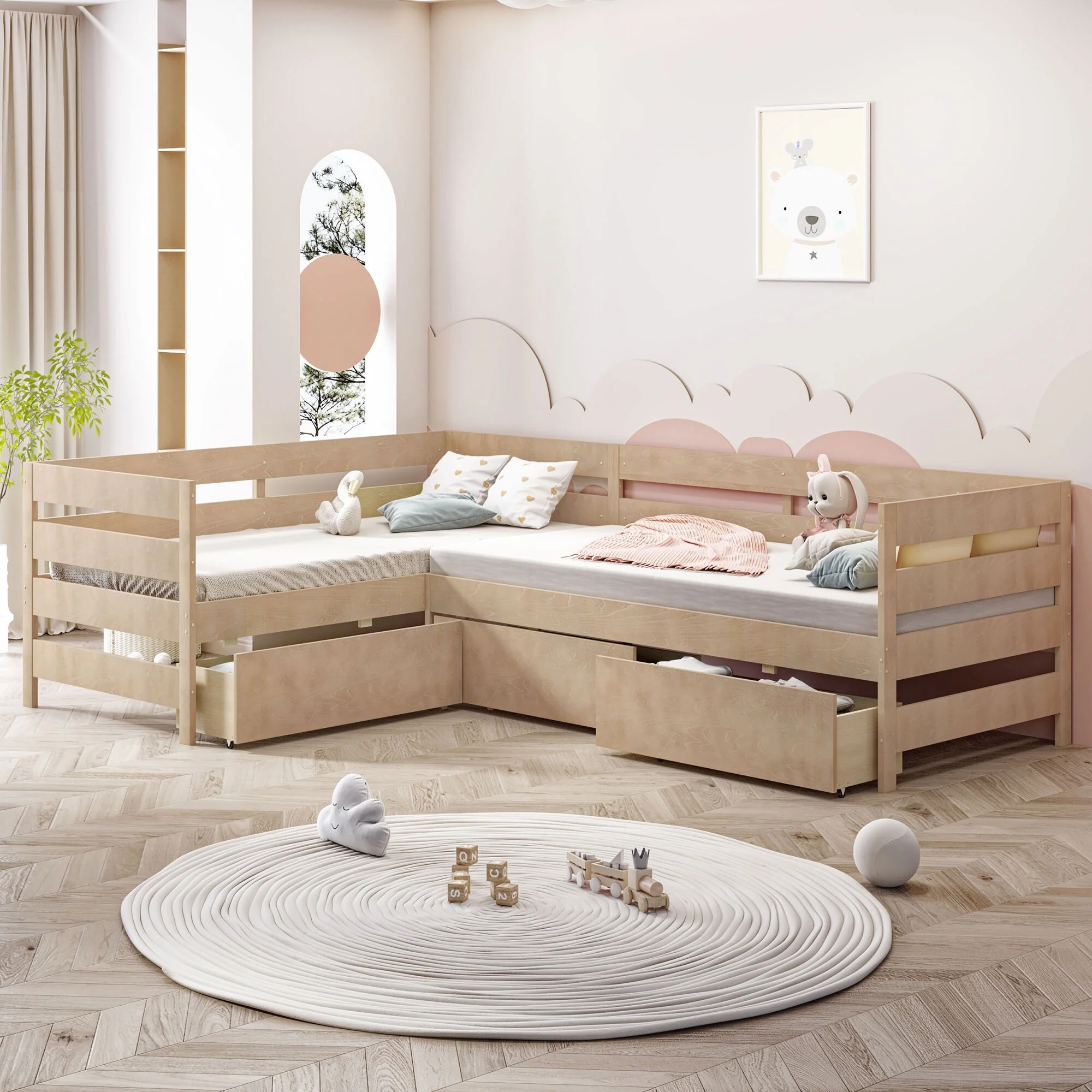 Solid Wood Twin L-Shaped Platform Bed with 3 Storage Drawers, Space-Saving Design