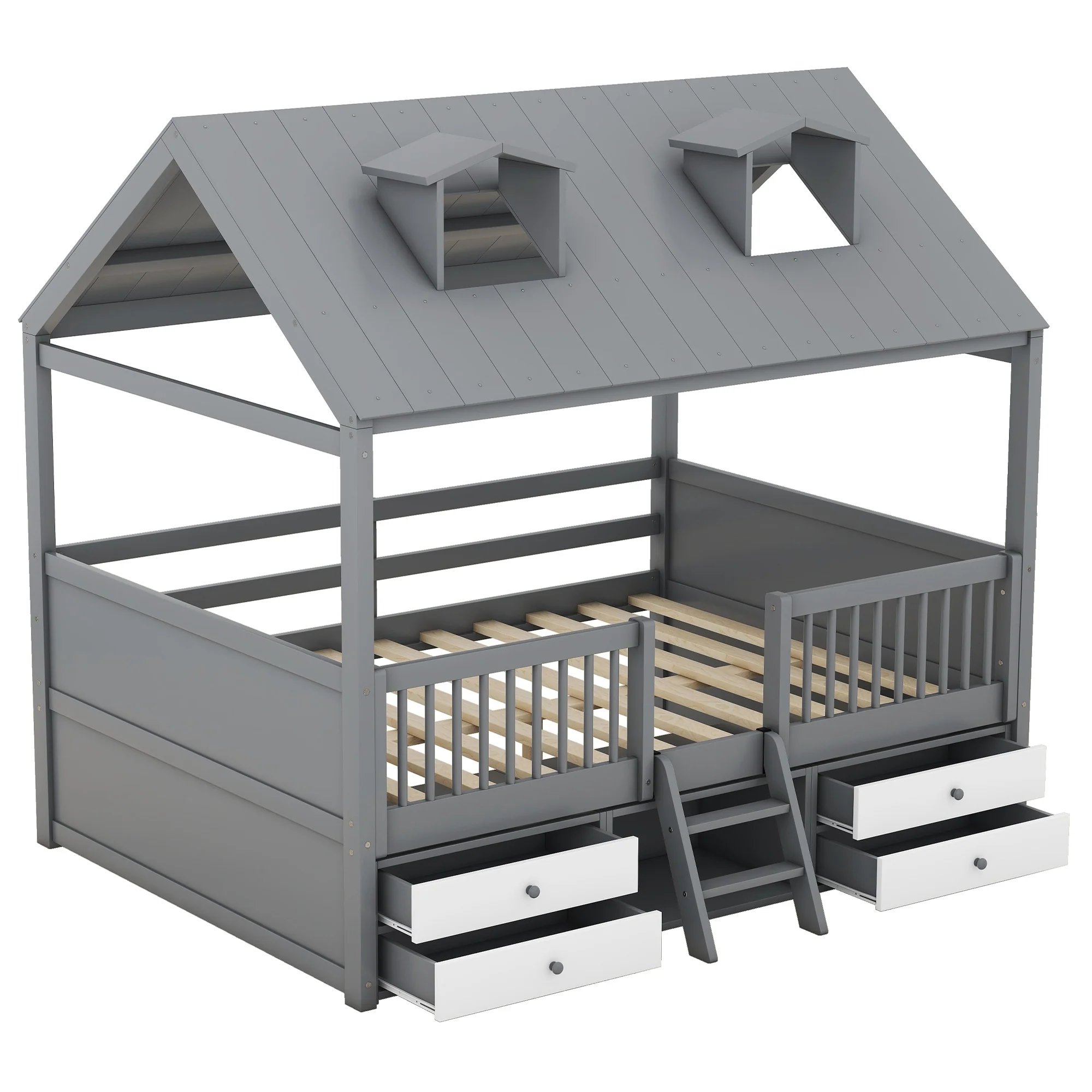 Twin Size Wood House Bed Frame with Skylights and Storage, Playful Design for Kids