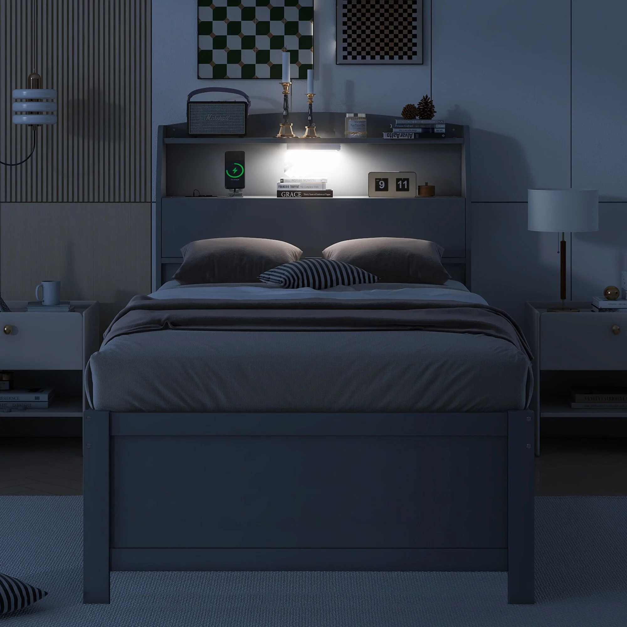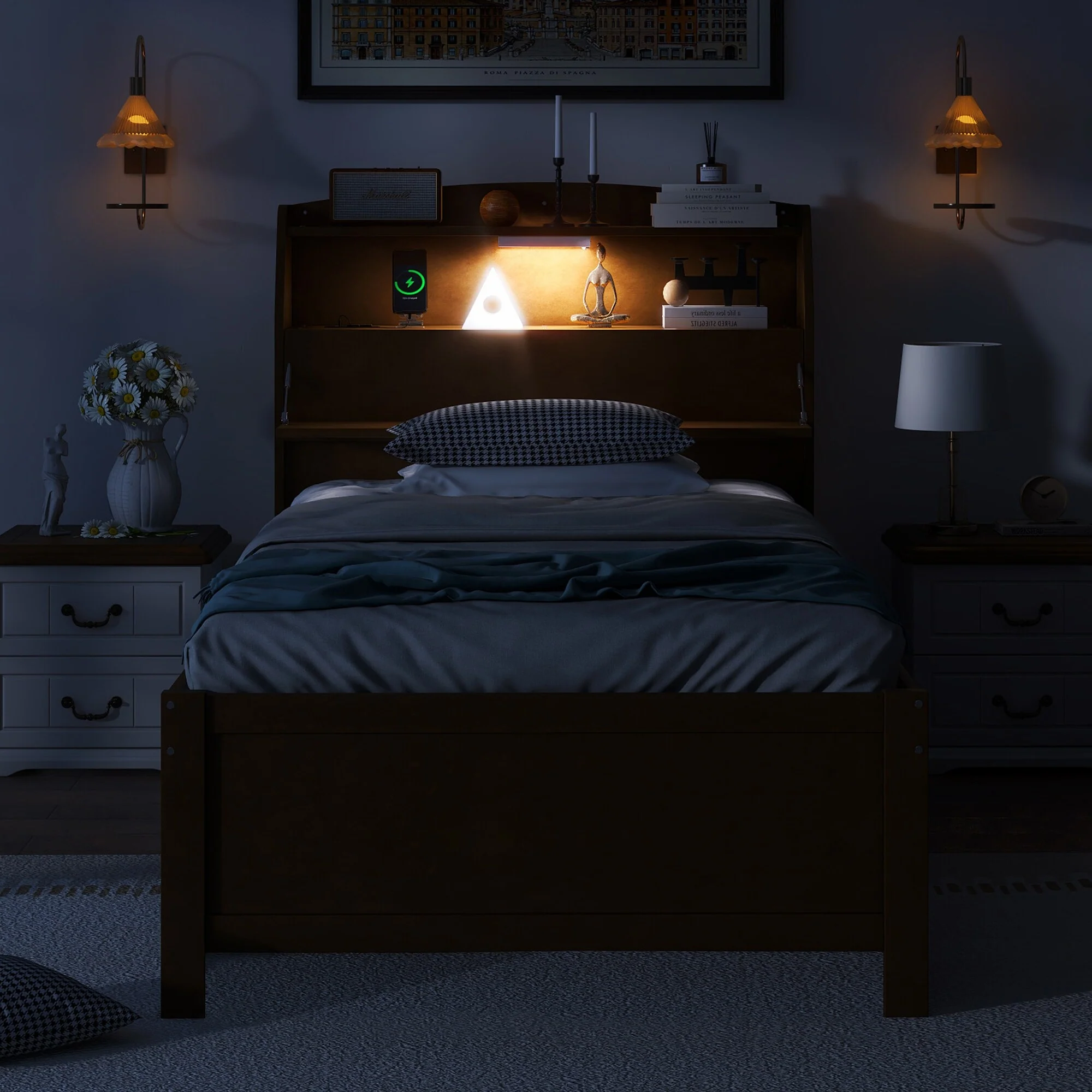 Twin Size Wooden LED Platform Bed with Trundle & Storage Headboard with Drawers, Espresso