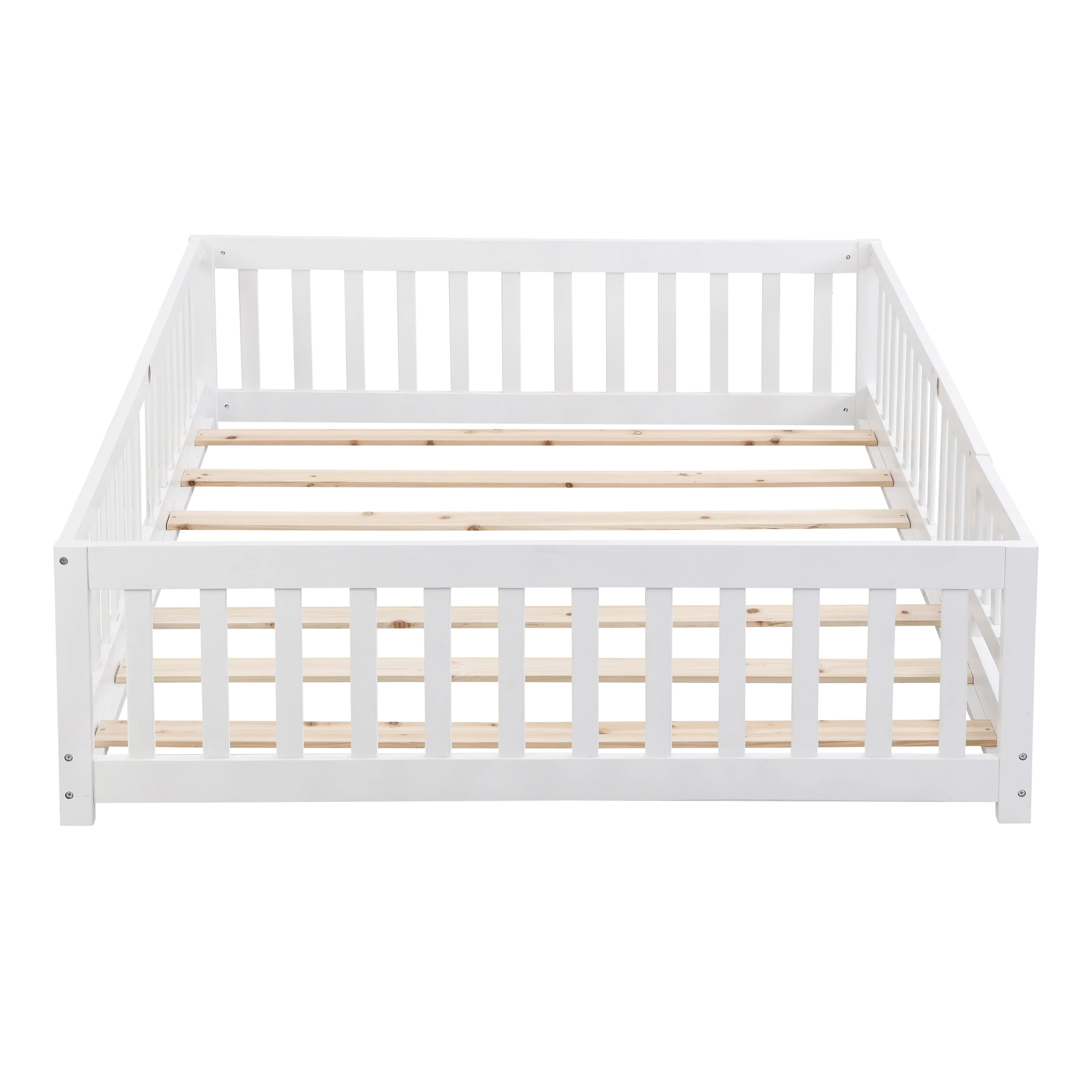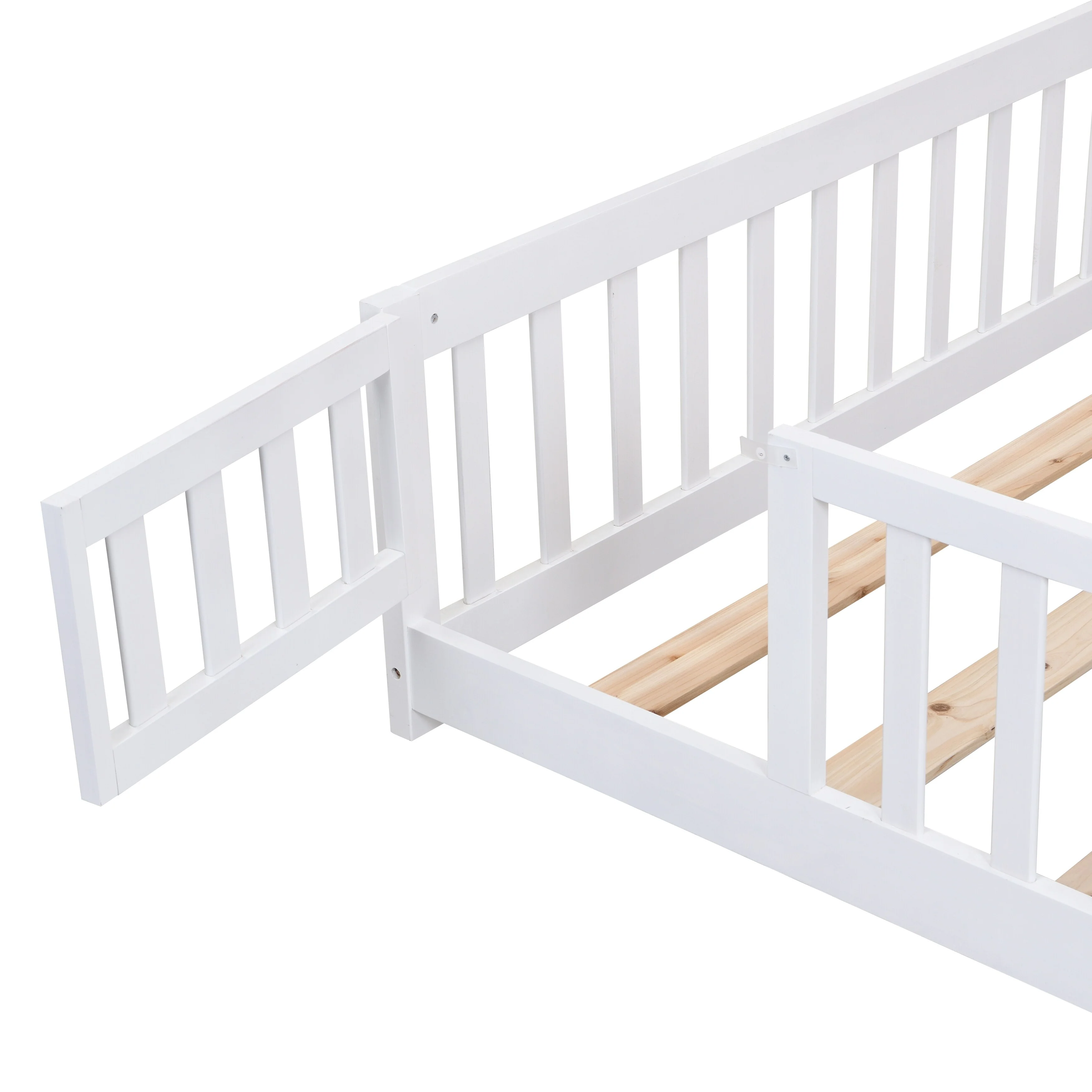 Full Size Floor Bed with Safety Guardrails & Door, Solid Pine Wood Platform Frame for Children, Low Profile Design