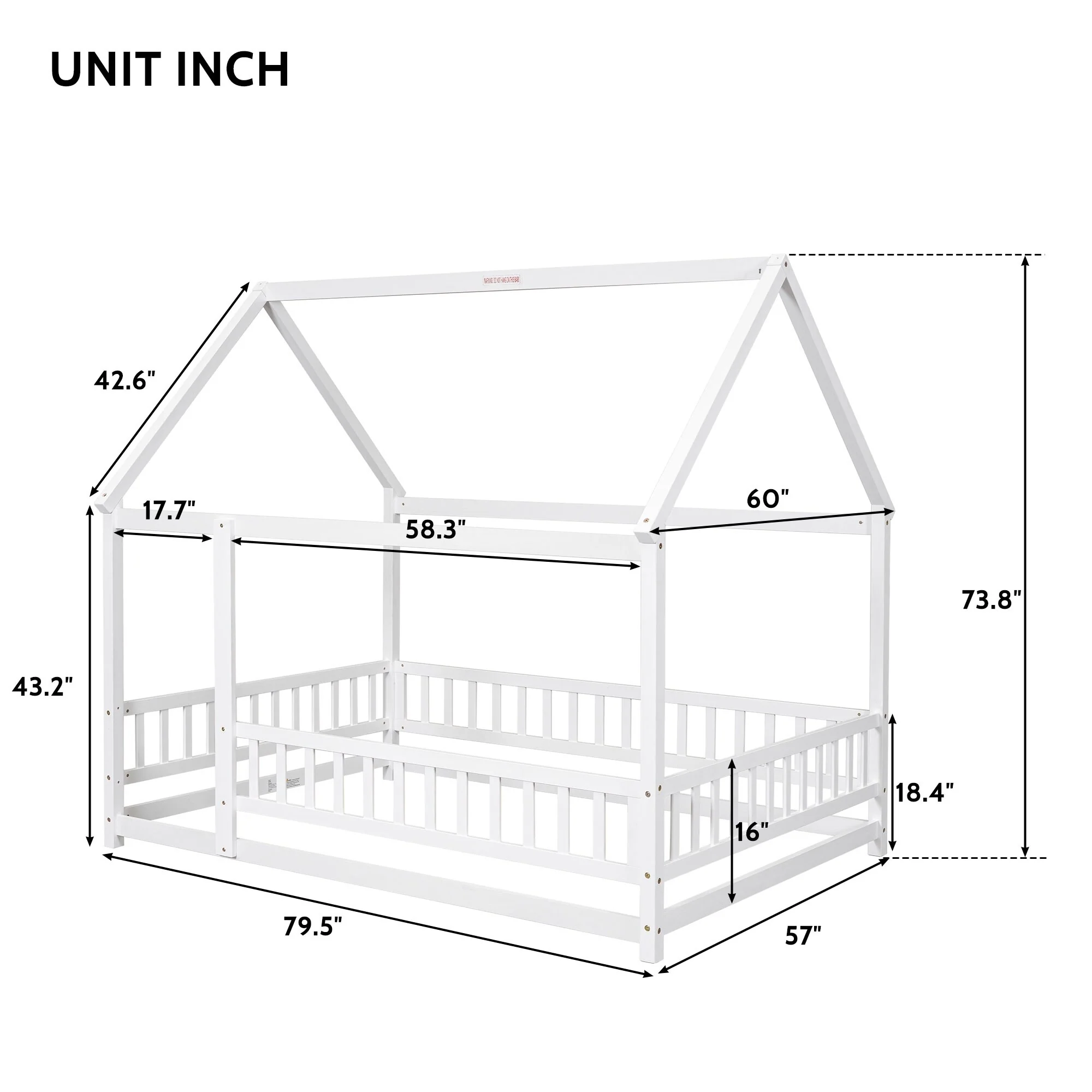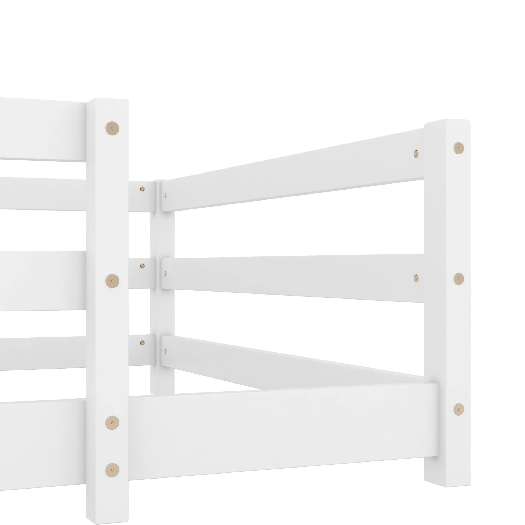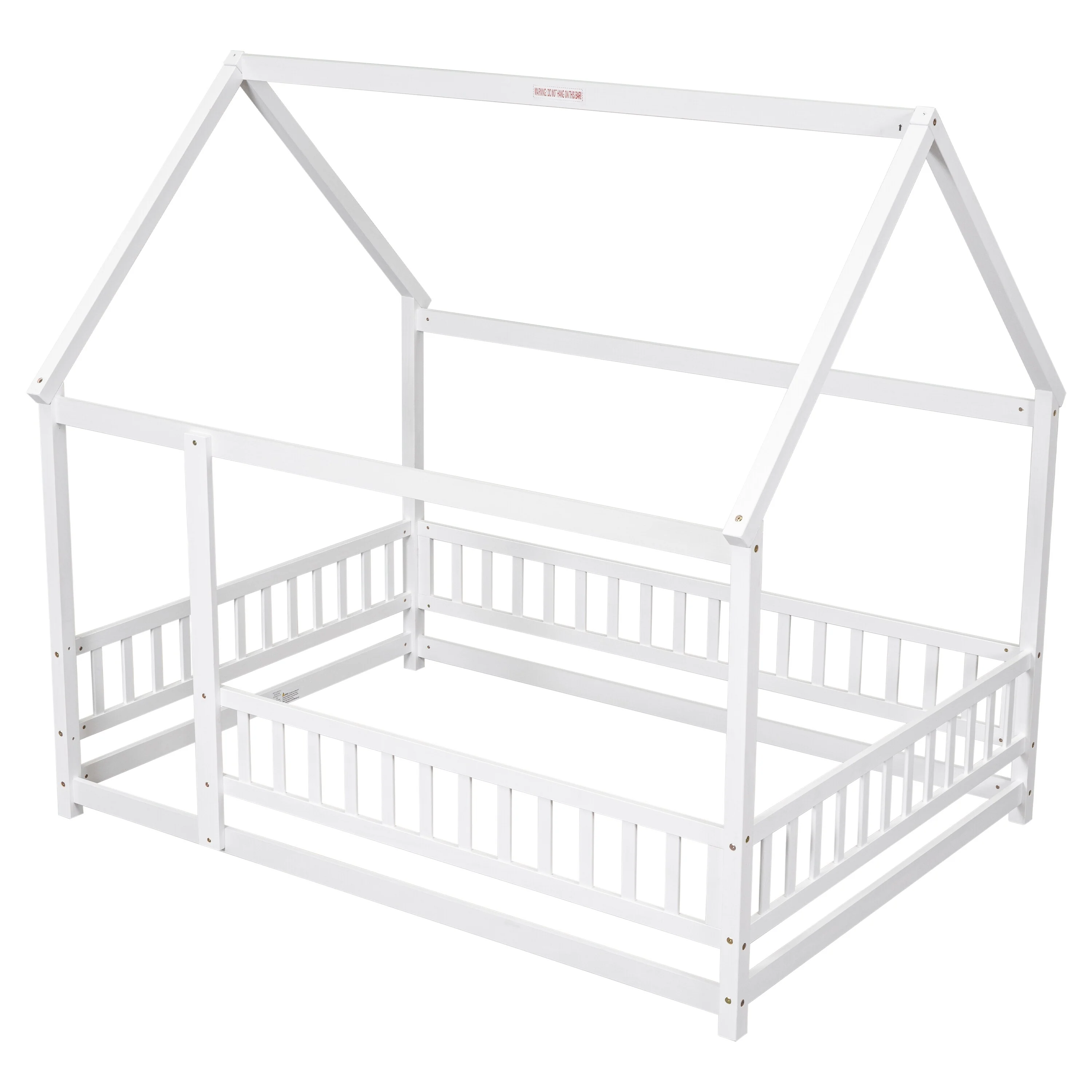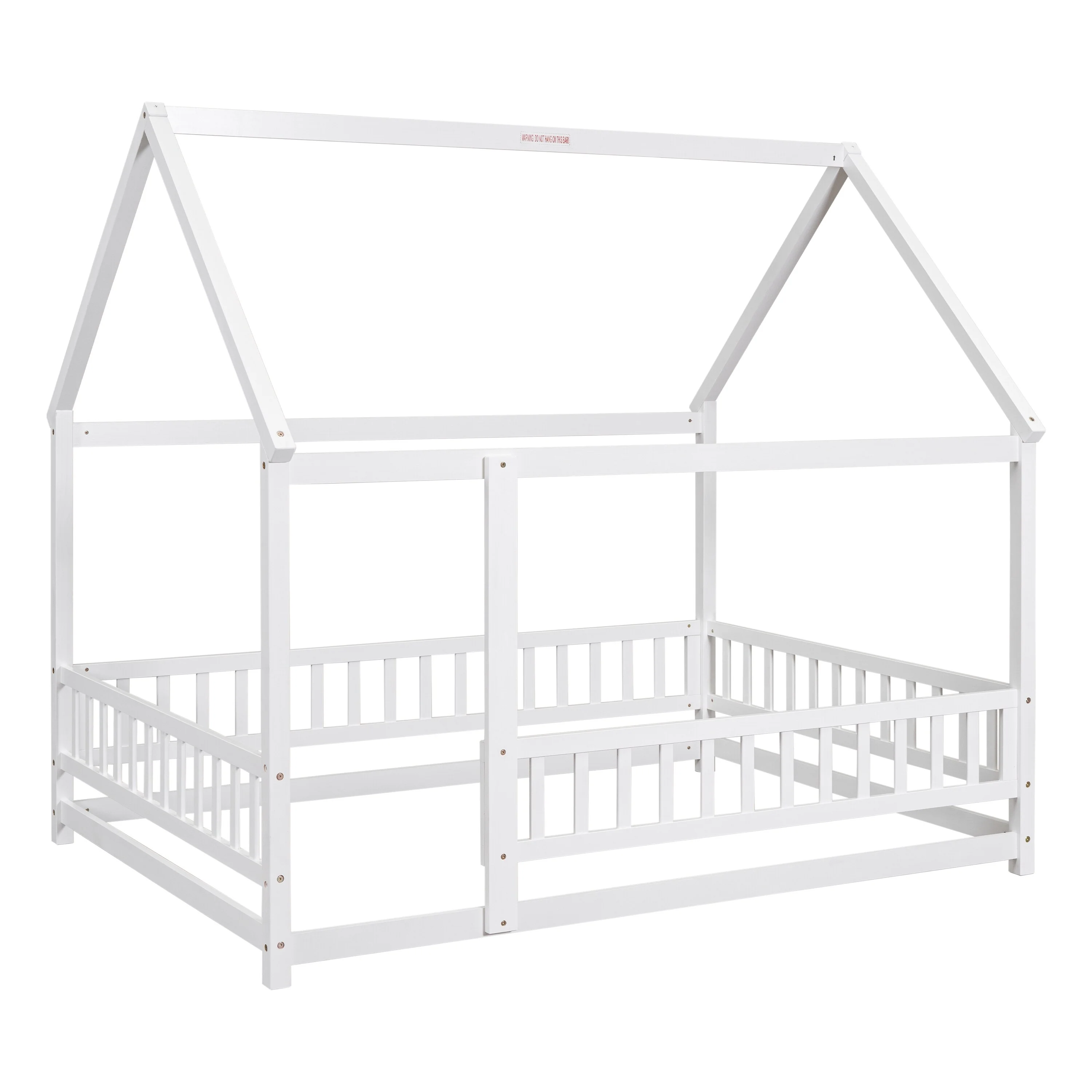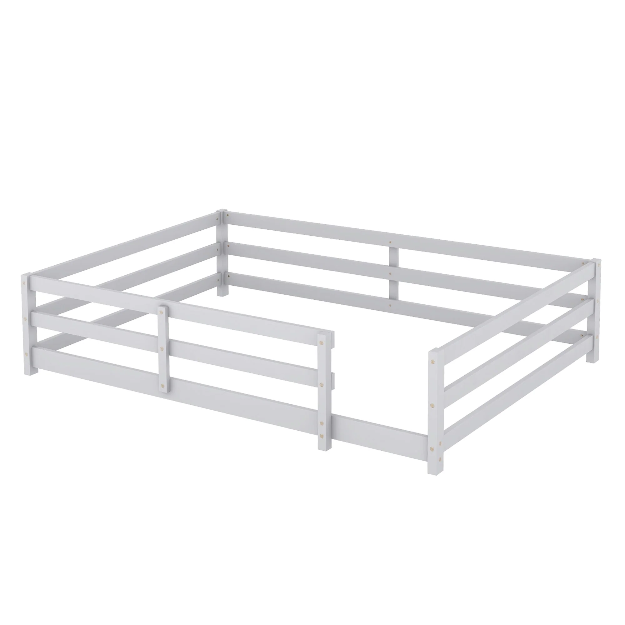 Elegant Queen Size Floor Bed with Fence and Door, Pine Wood Frame for Kids or Play Space