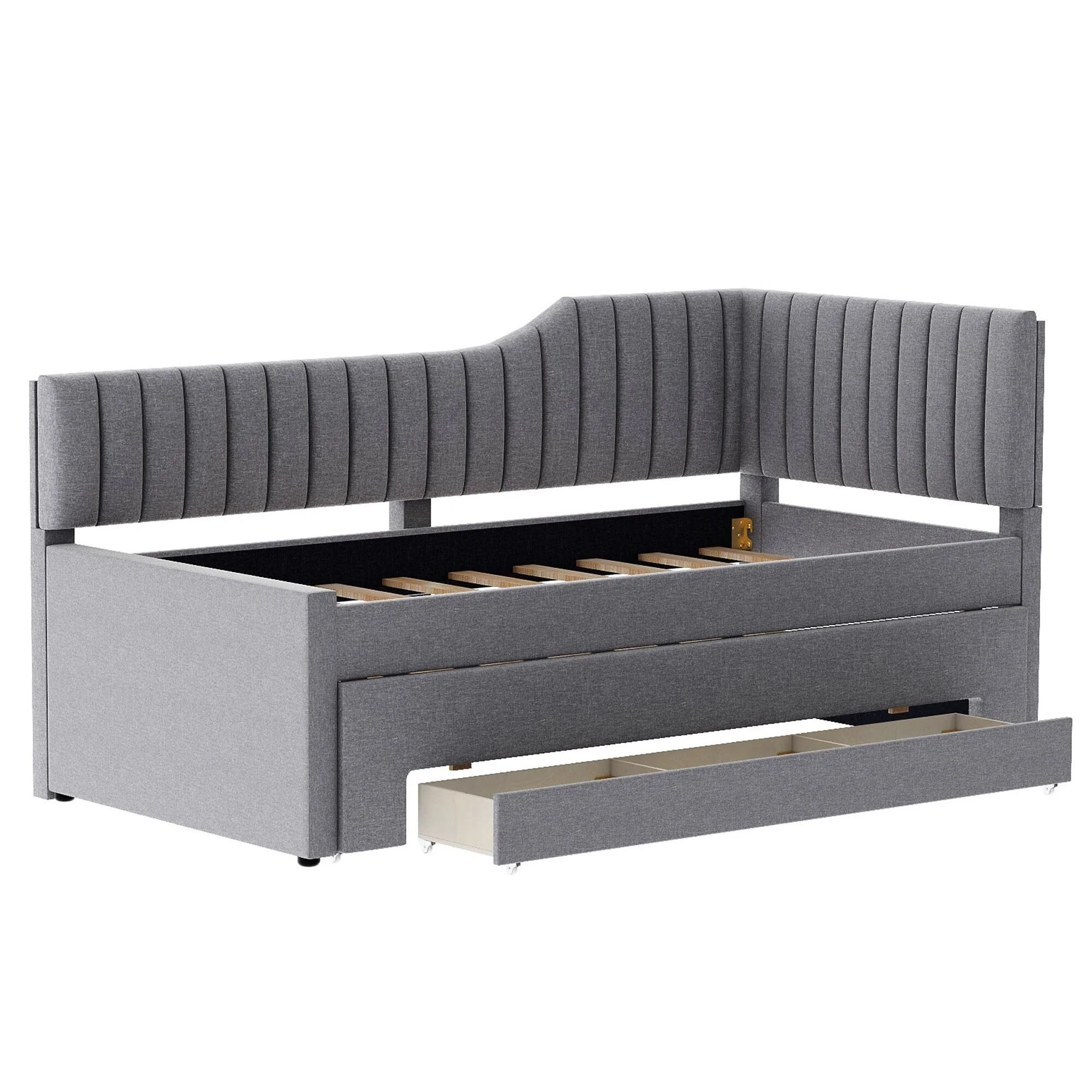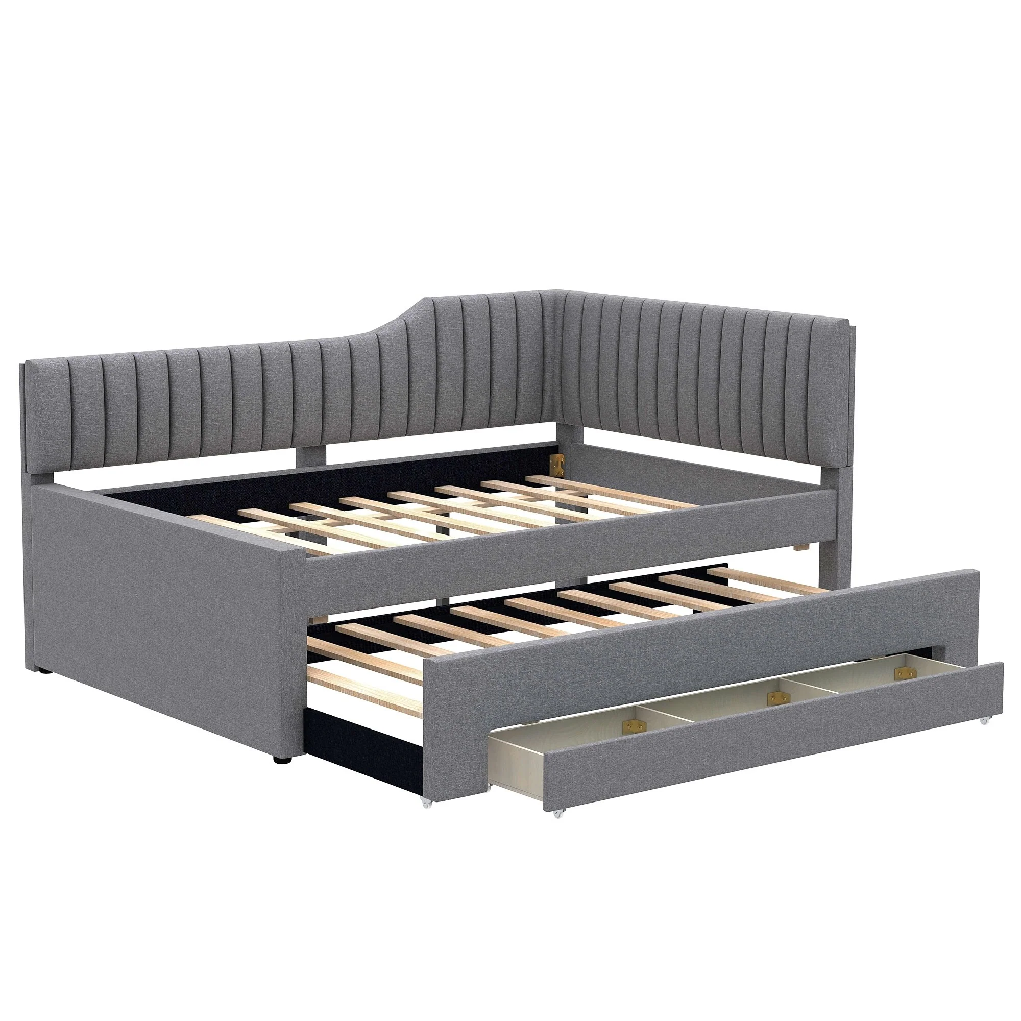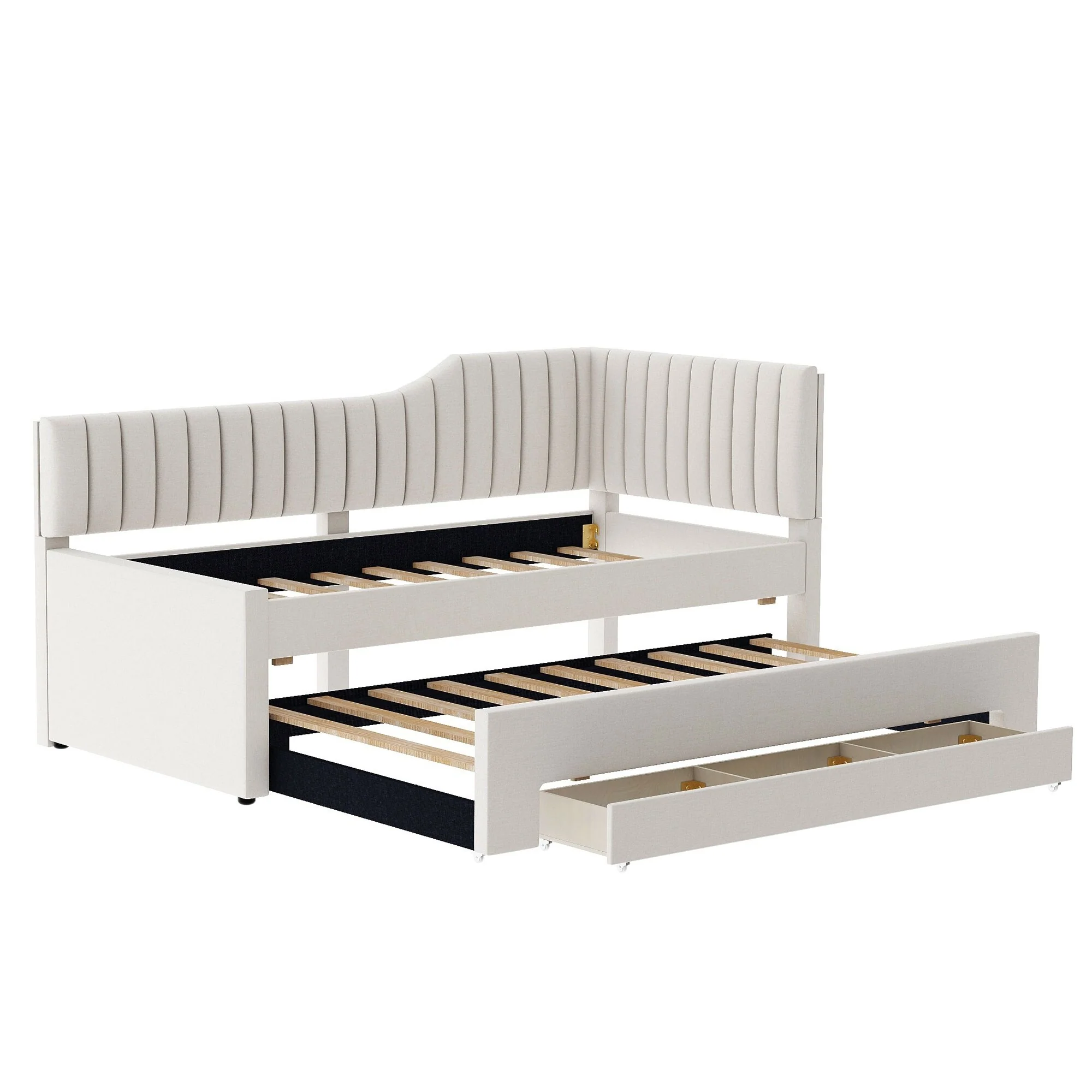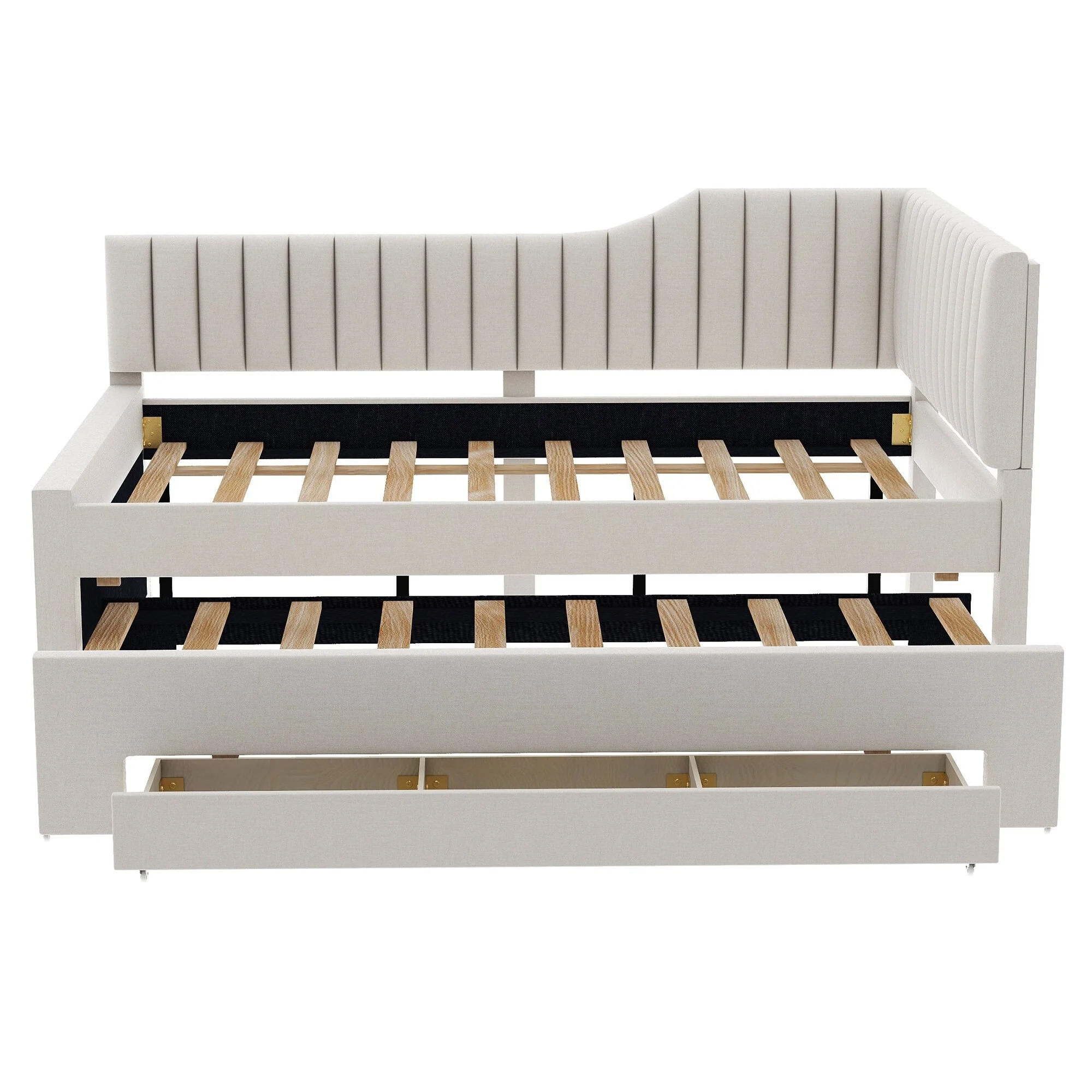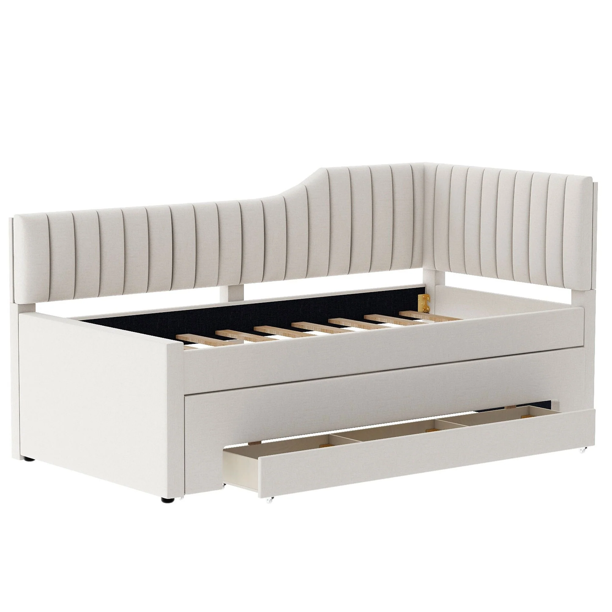 Daybed Captain Bed Upholstered Bed with Trundle and 3 Drawers, Elegance Stripe Design L-Shaped Upholstered Daybed Platform Bed