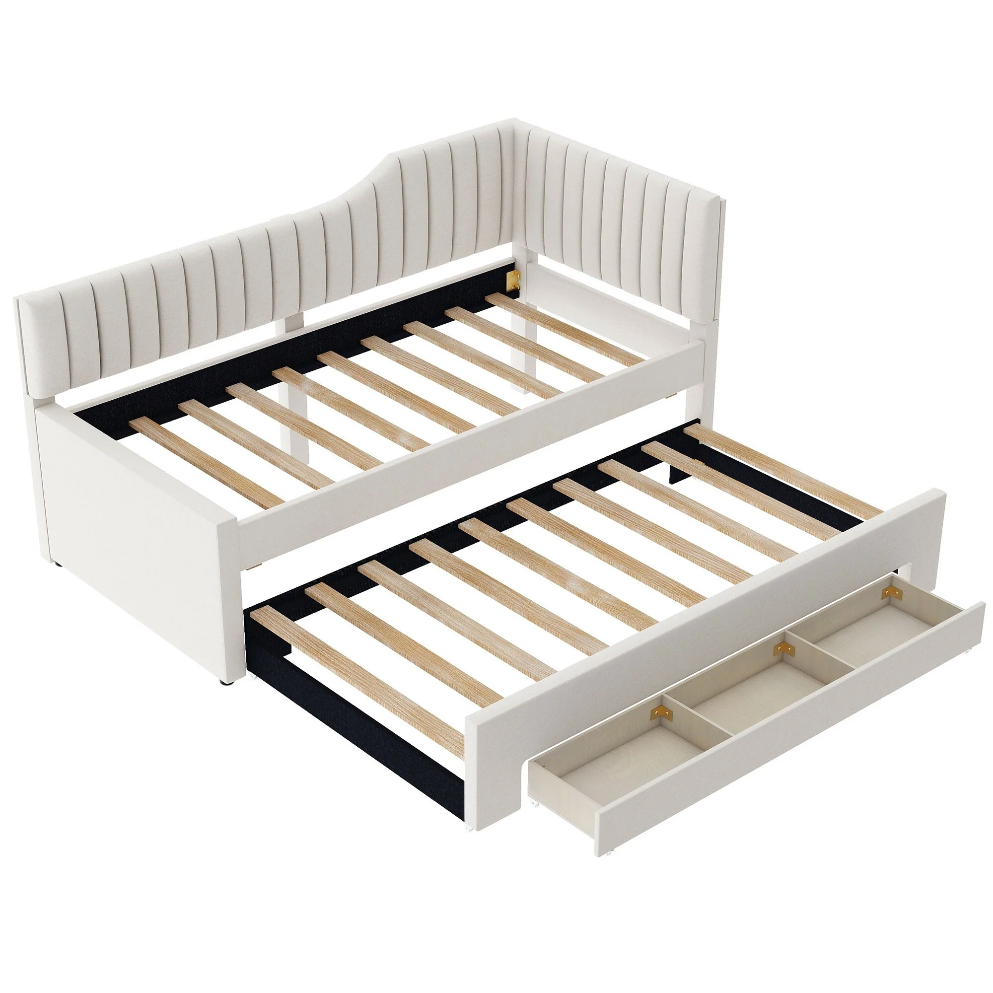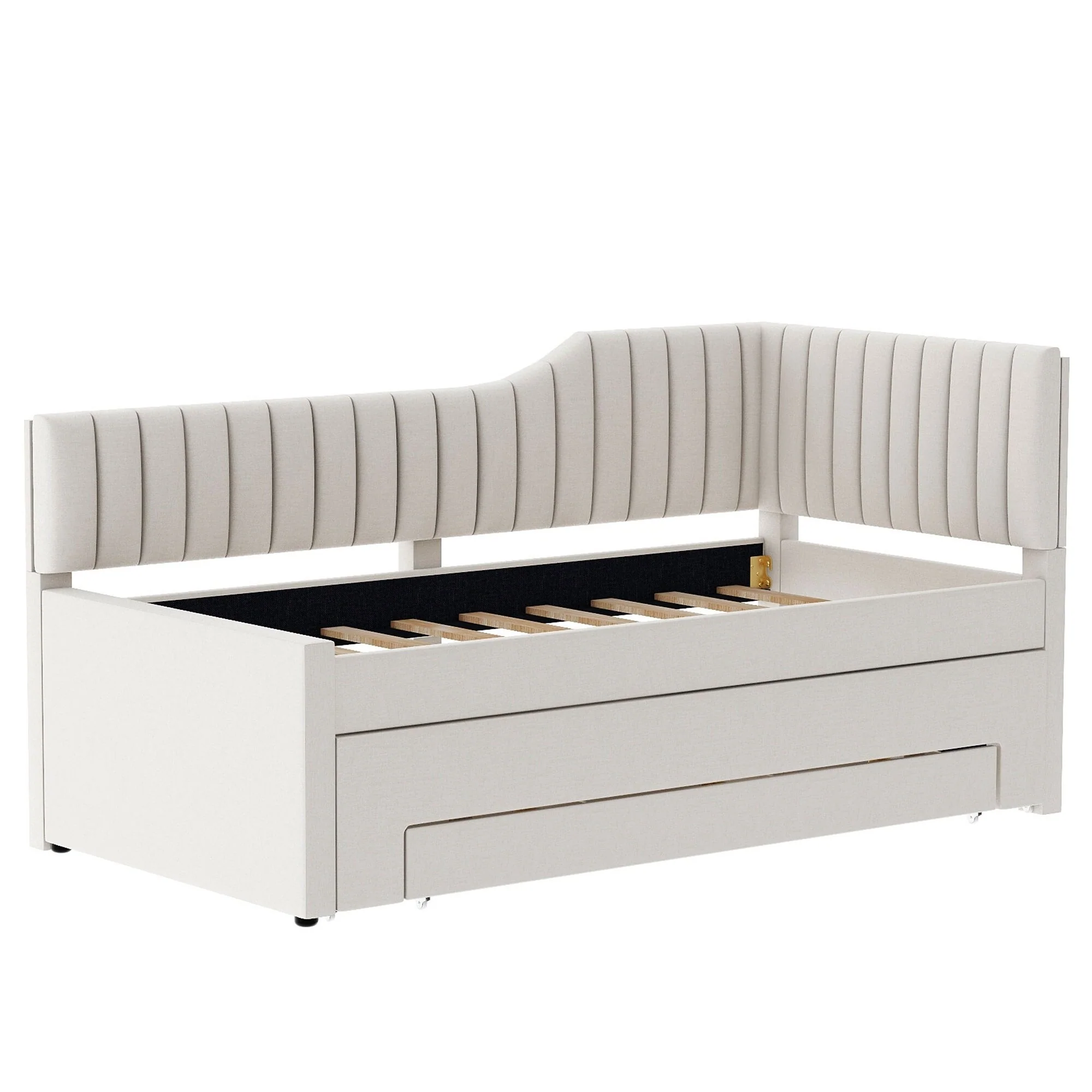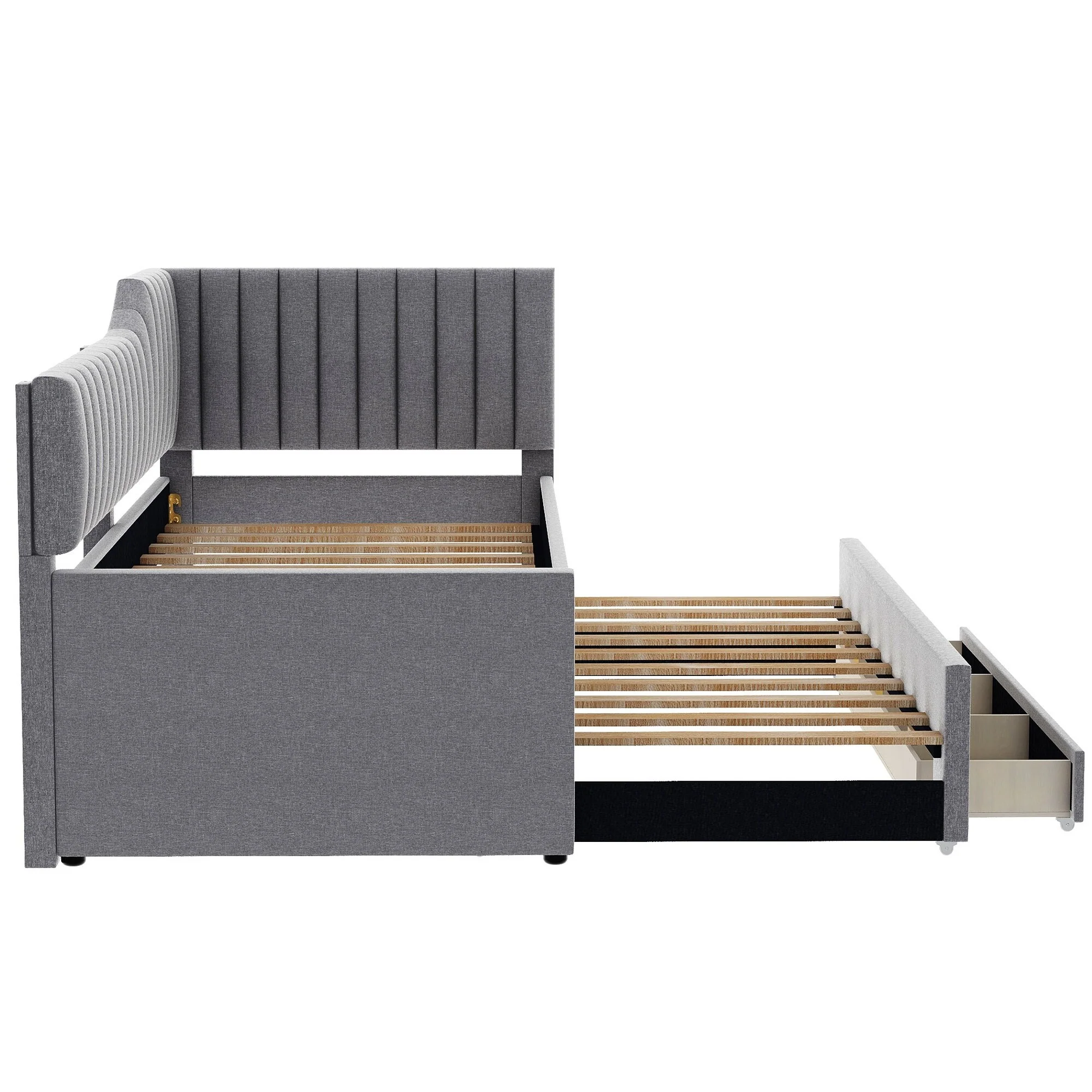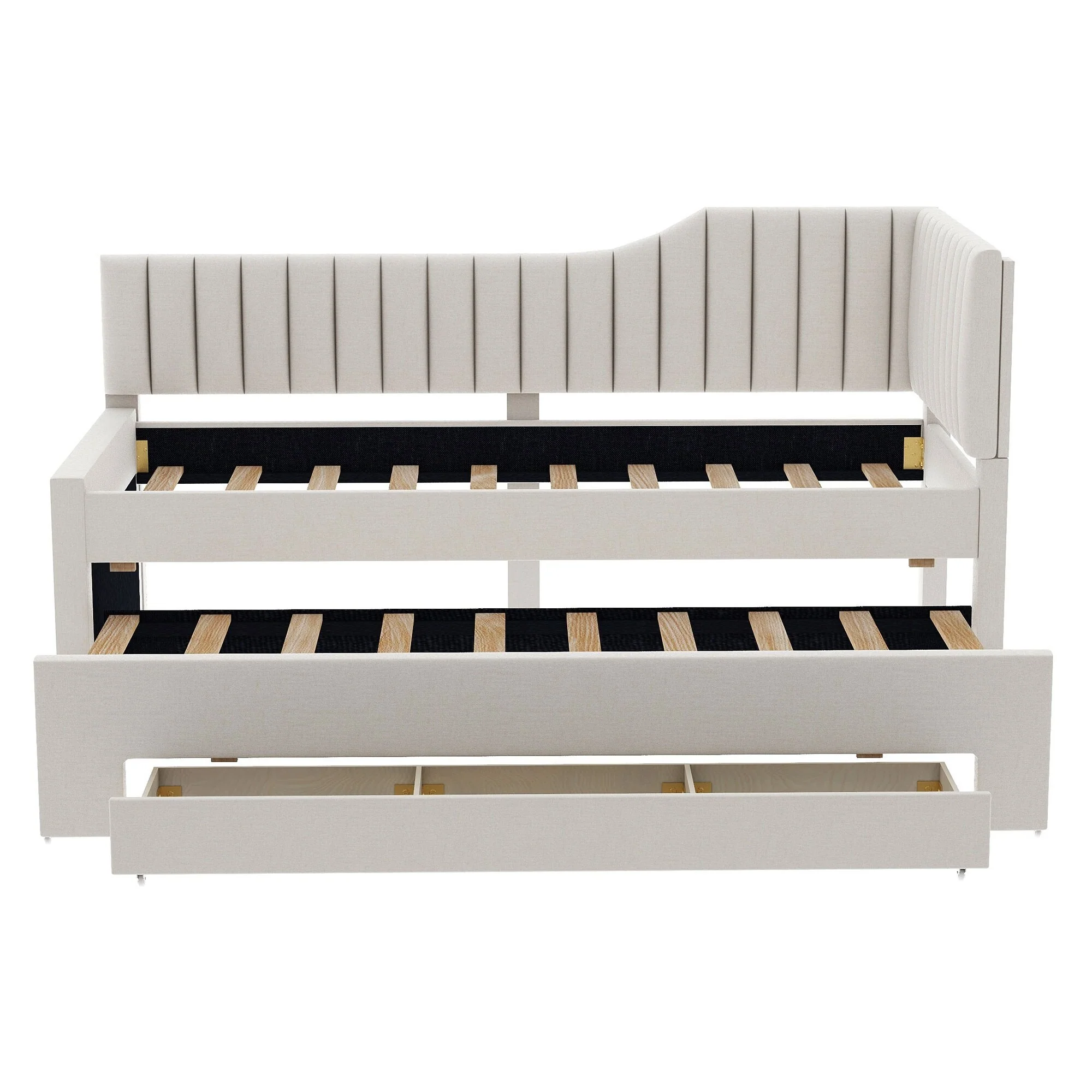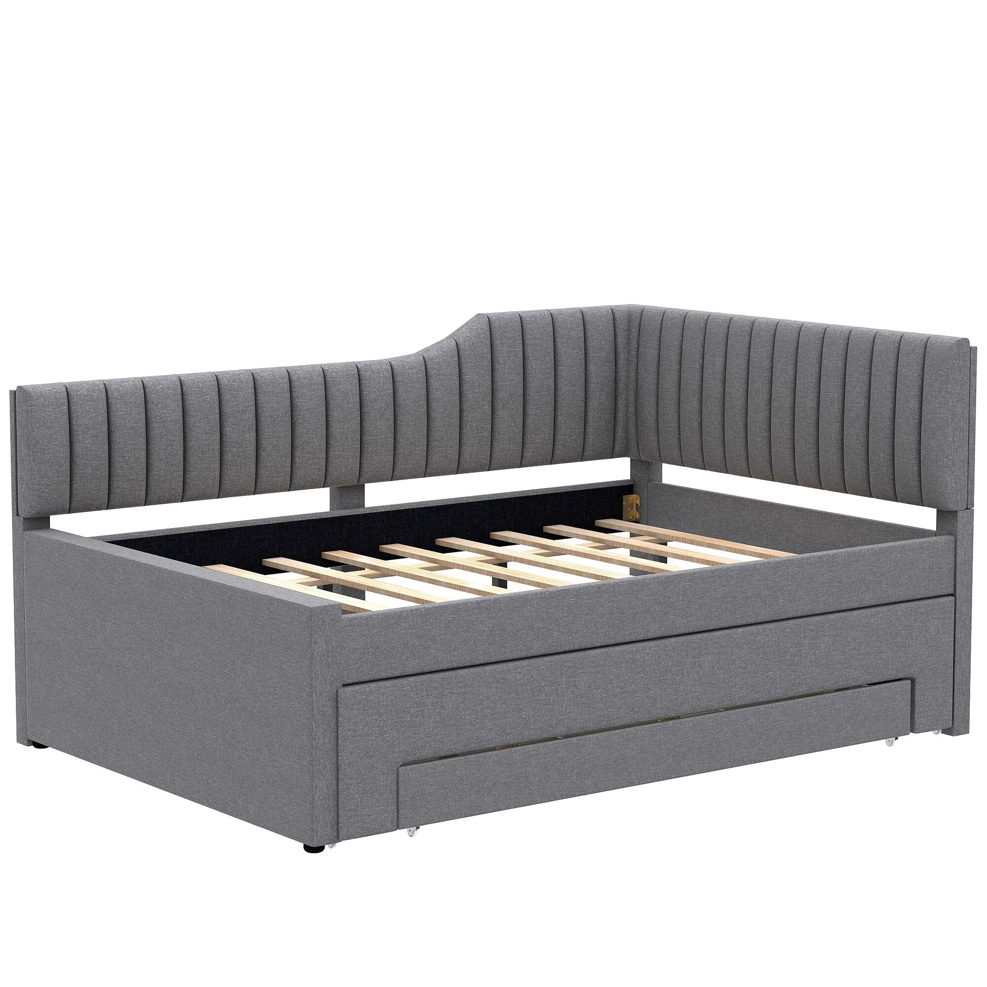 Daybed Captain Bed Upholstered Bed with Trundle and 3 Drawers, Elegance Stripe Design L-Shaped Upholstered Daybed Platform Bed