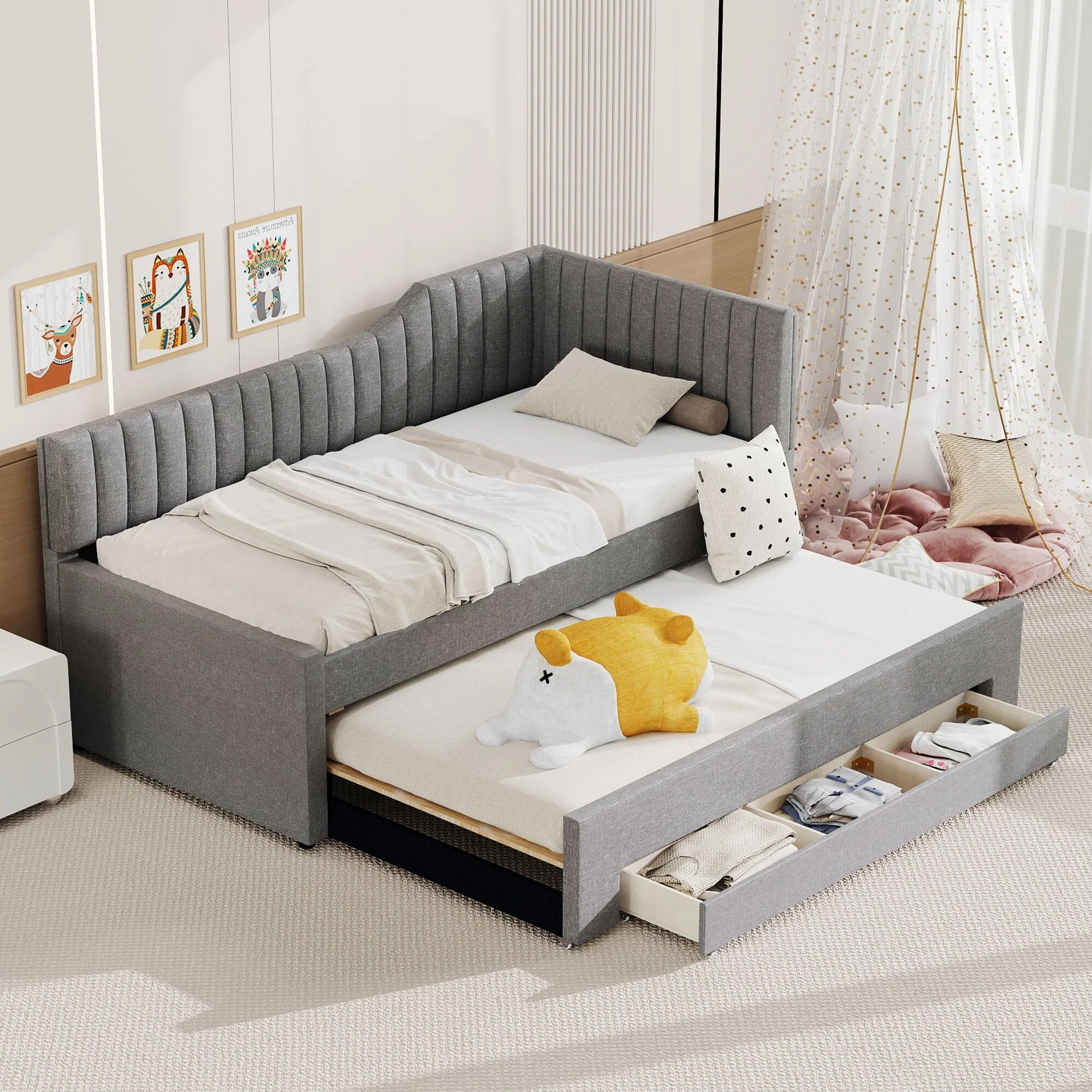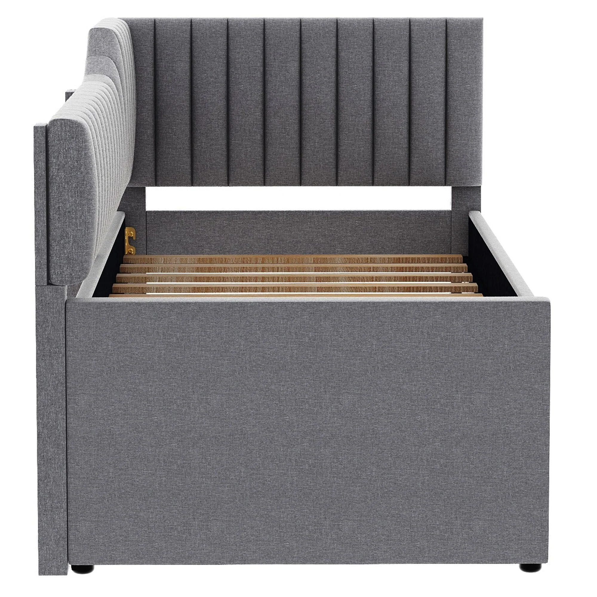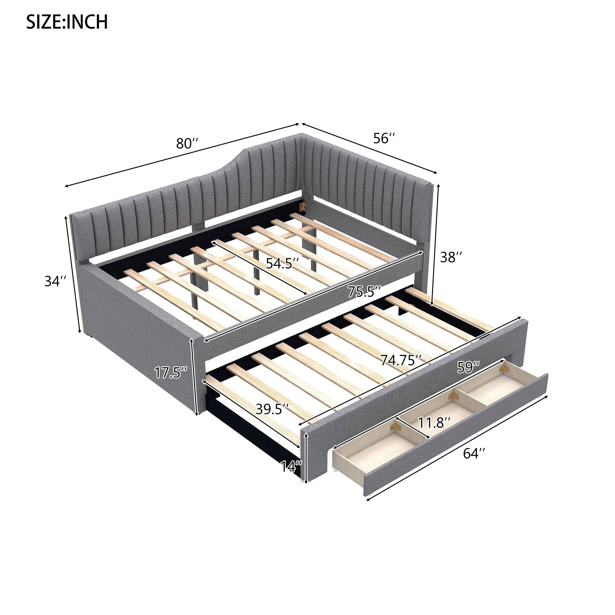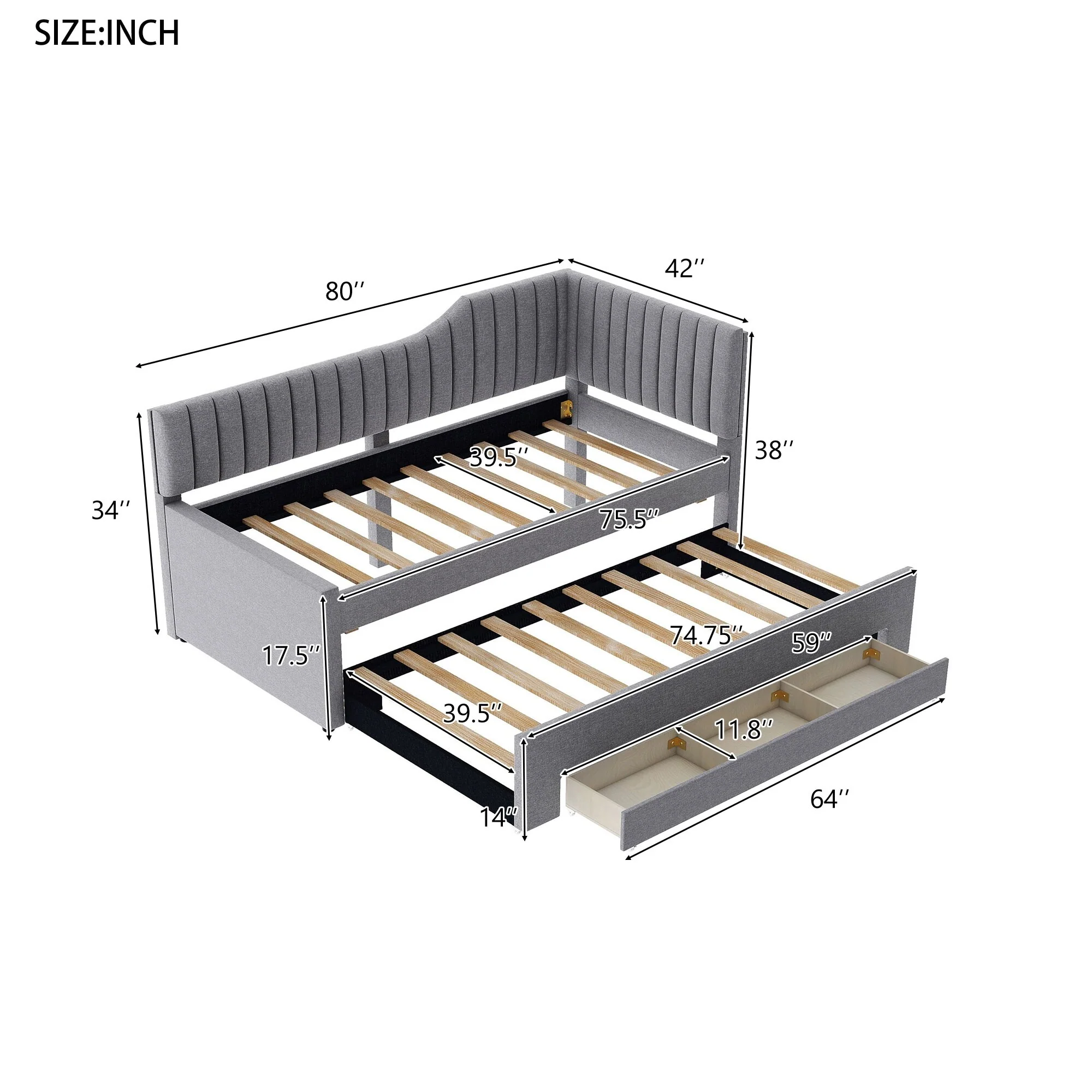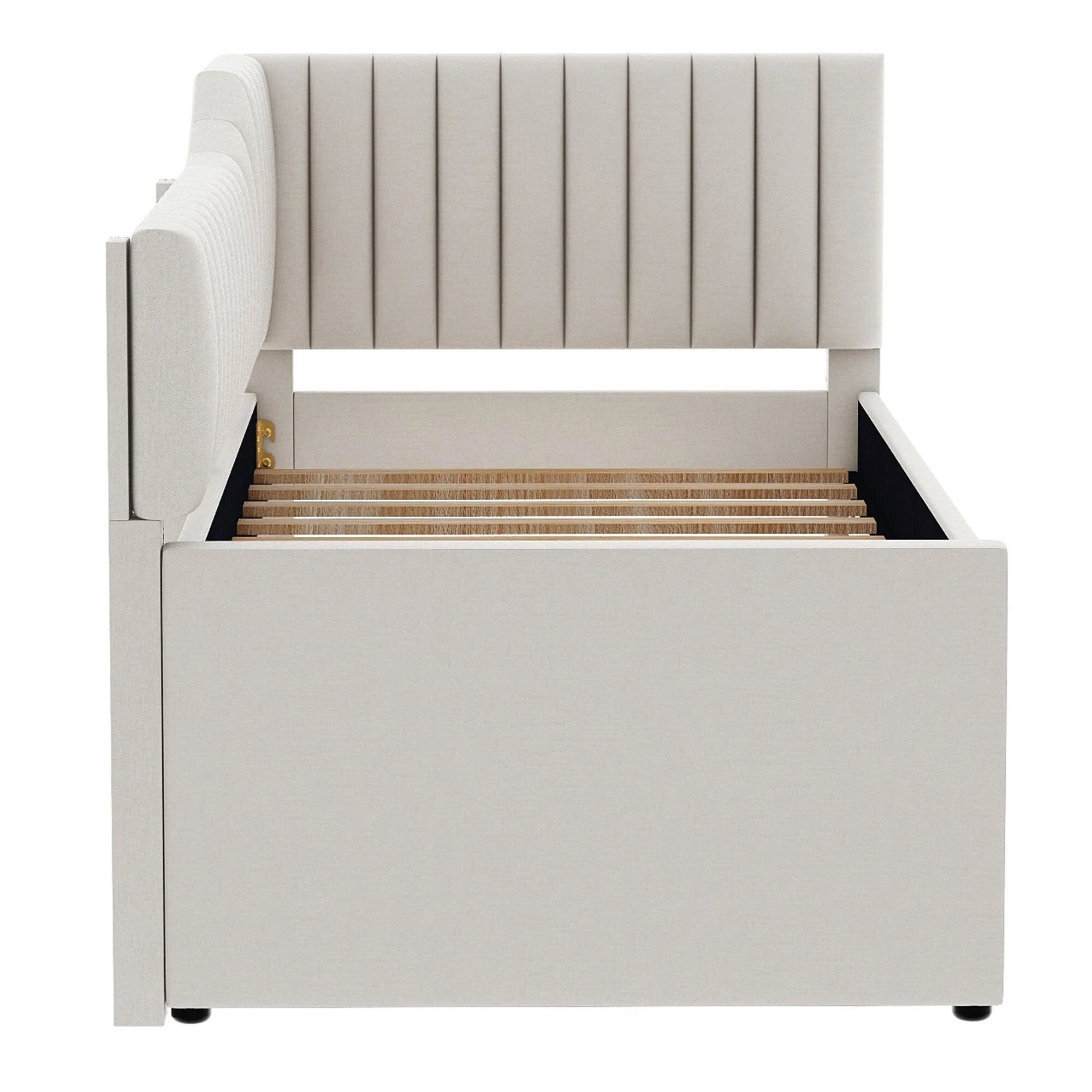 Daybed Captain Bed Upholstered Bed with Trundle and 3 Drawers, Elegance Stripe Design L-Shaped Upholstered Daybed Platform Bed