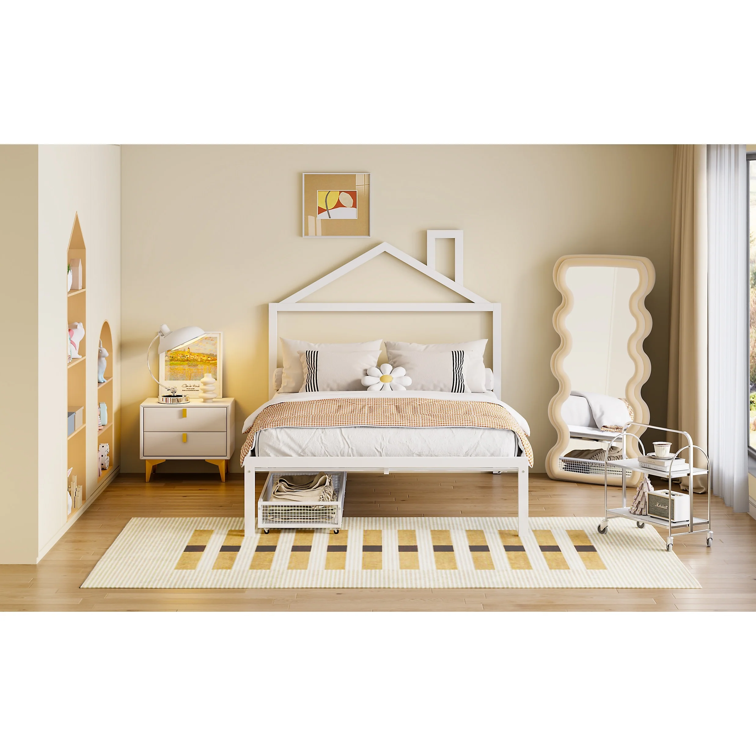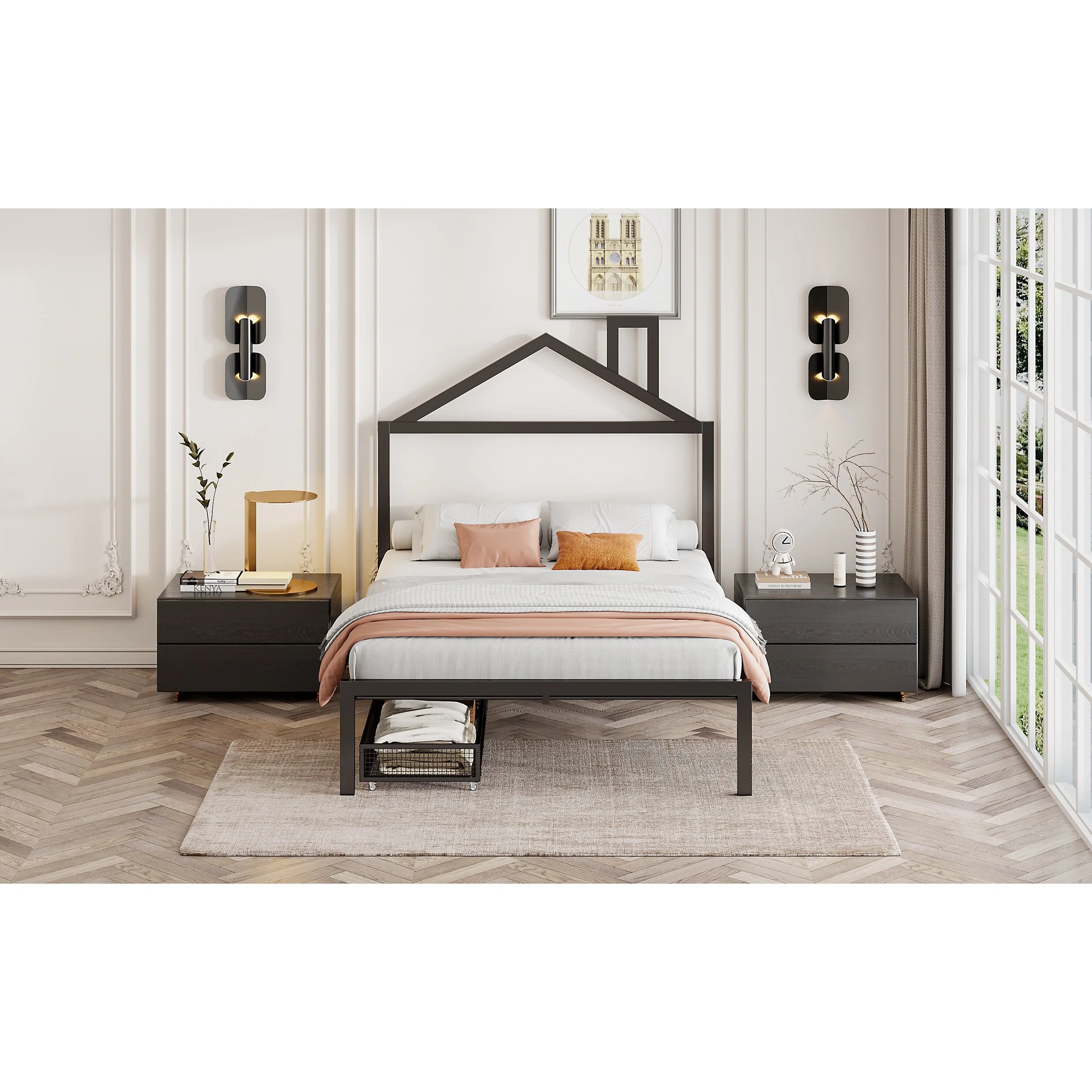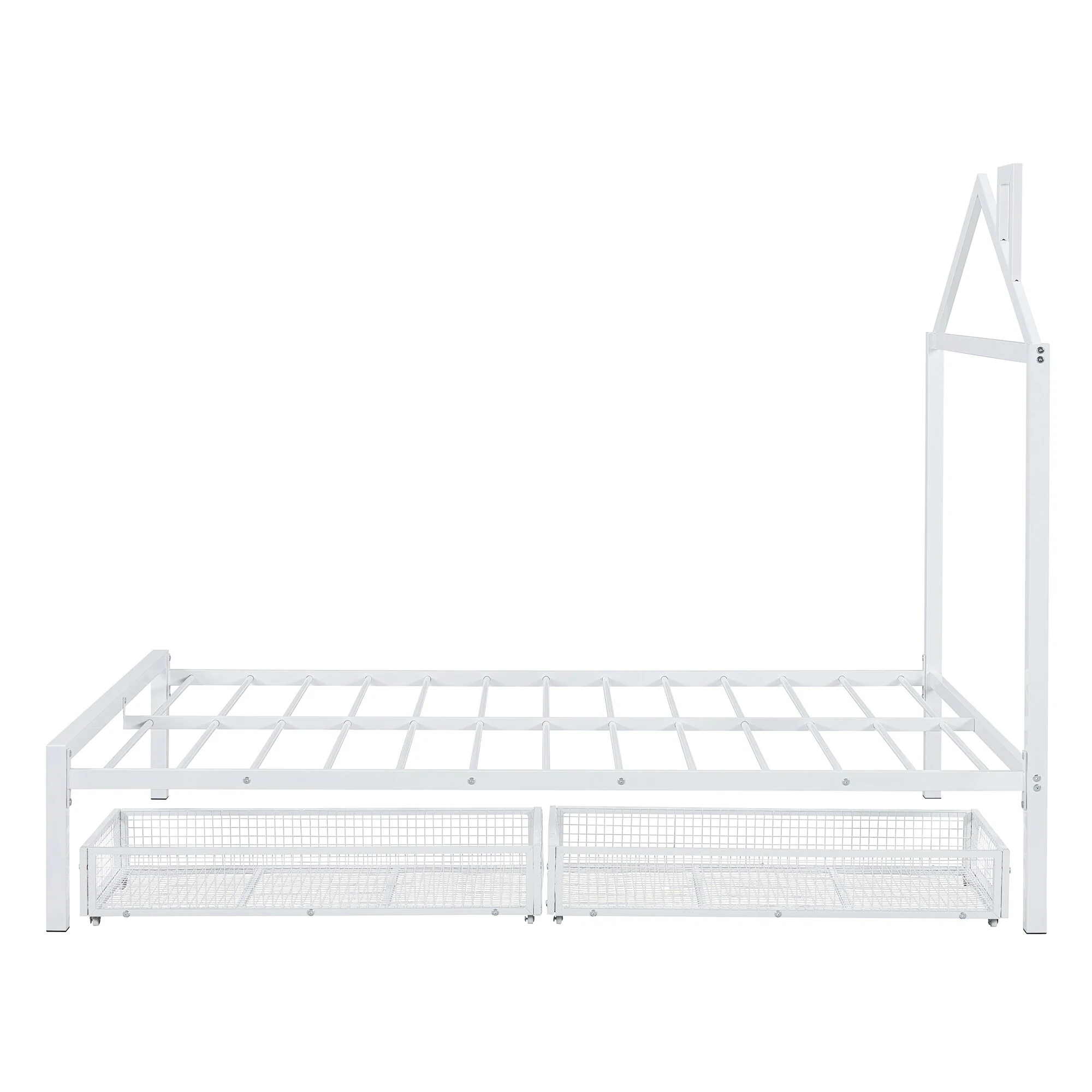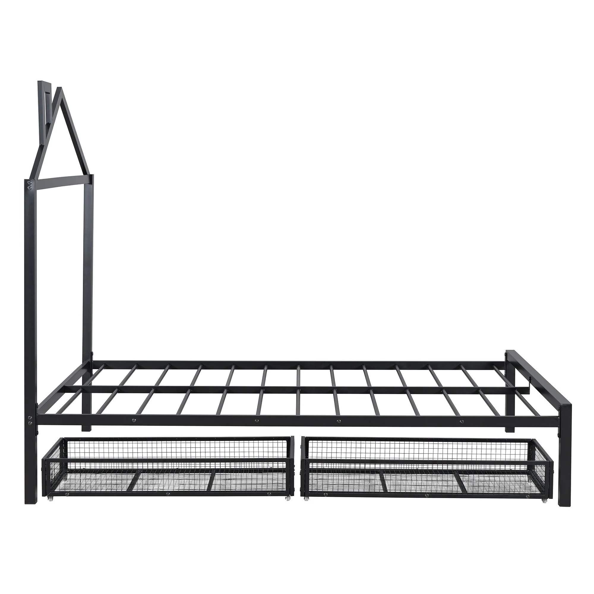 Full Size Metal House Bed with Drawers and Chimney Design, No Box Spring Needed