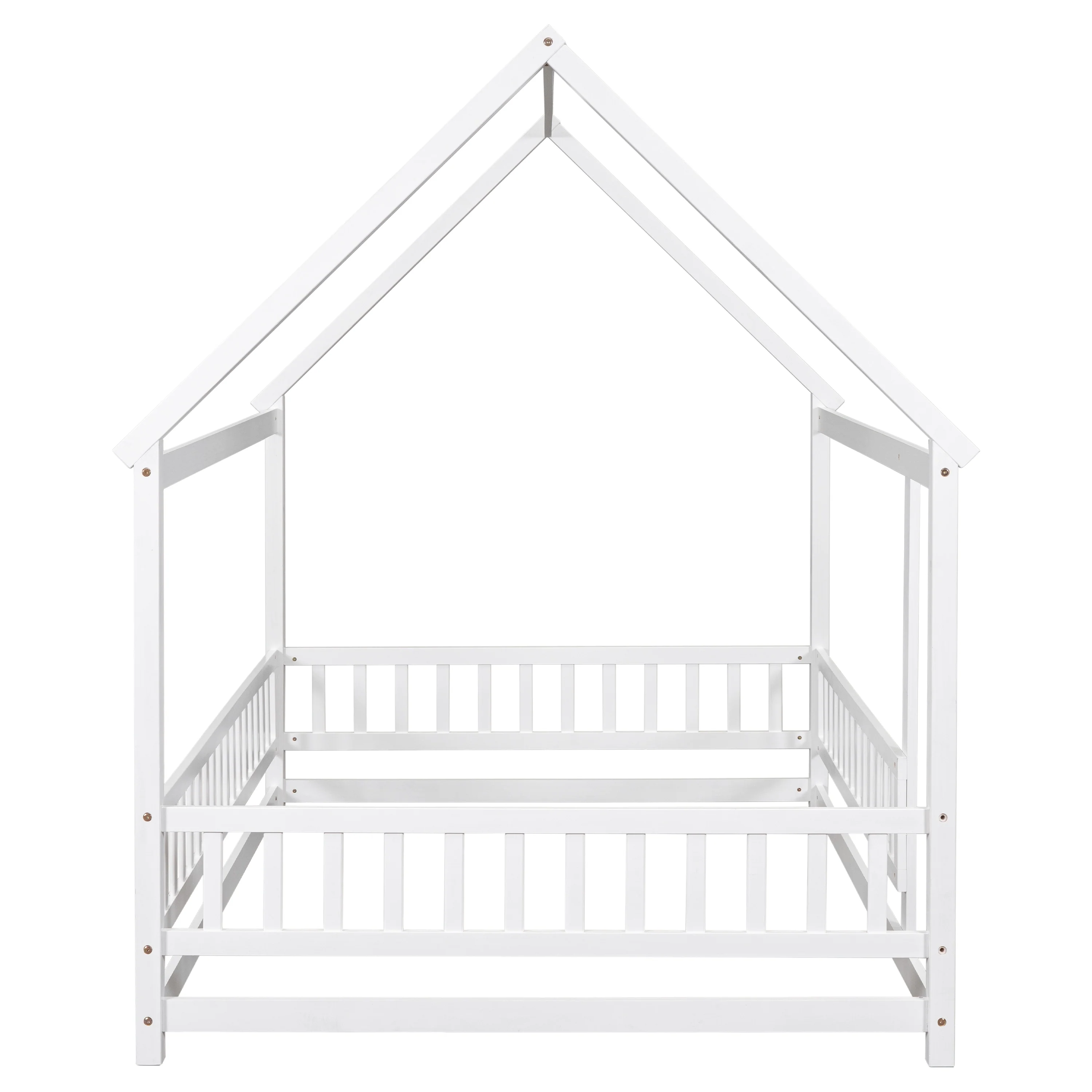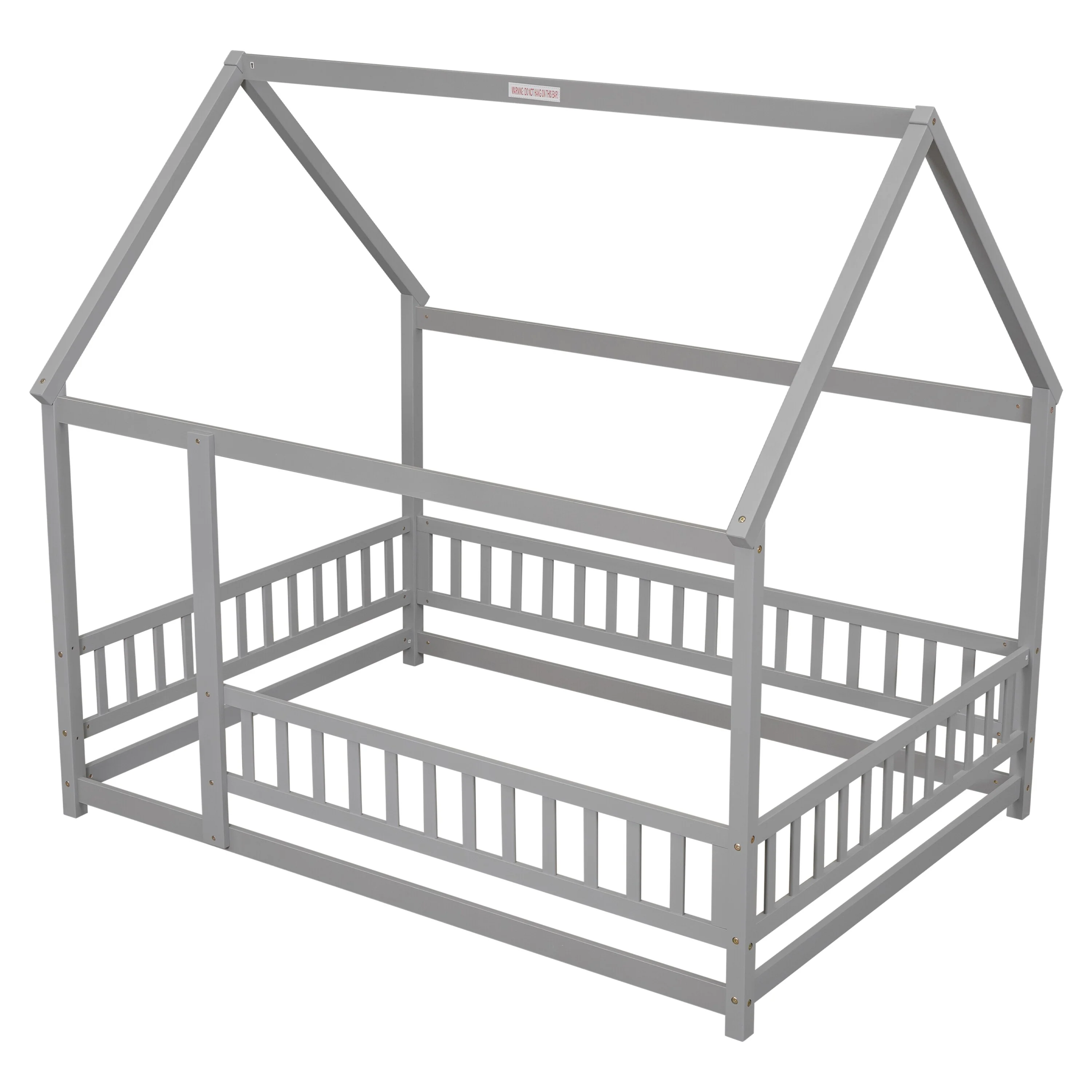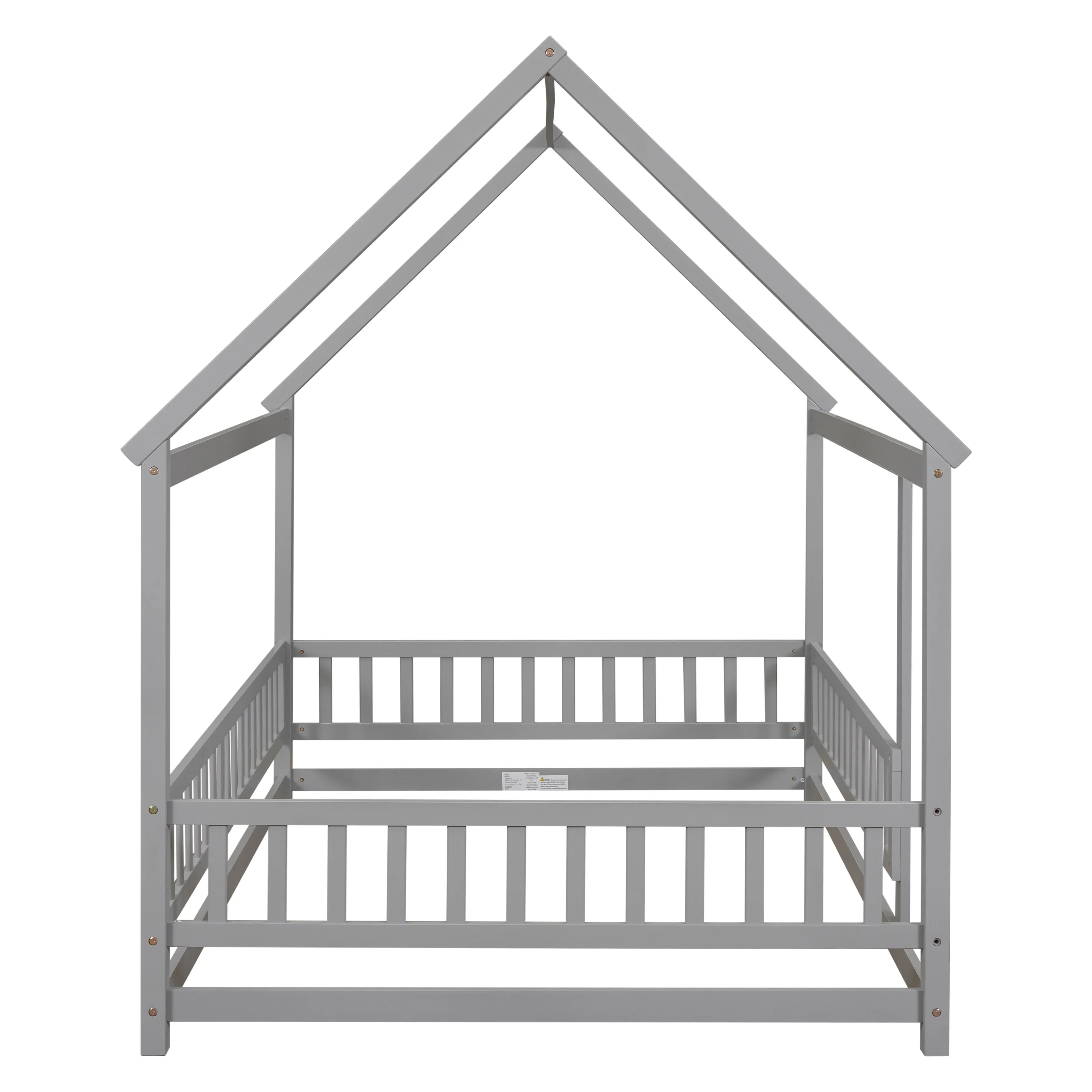 Grey Full Size House Frame Floor Bed with Safety Fence Design