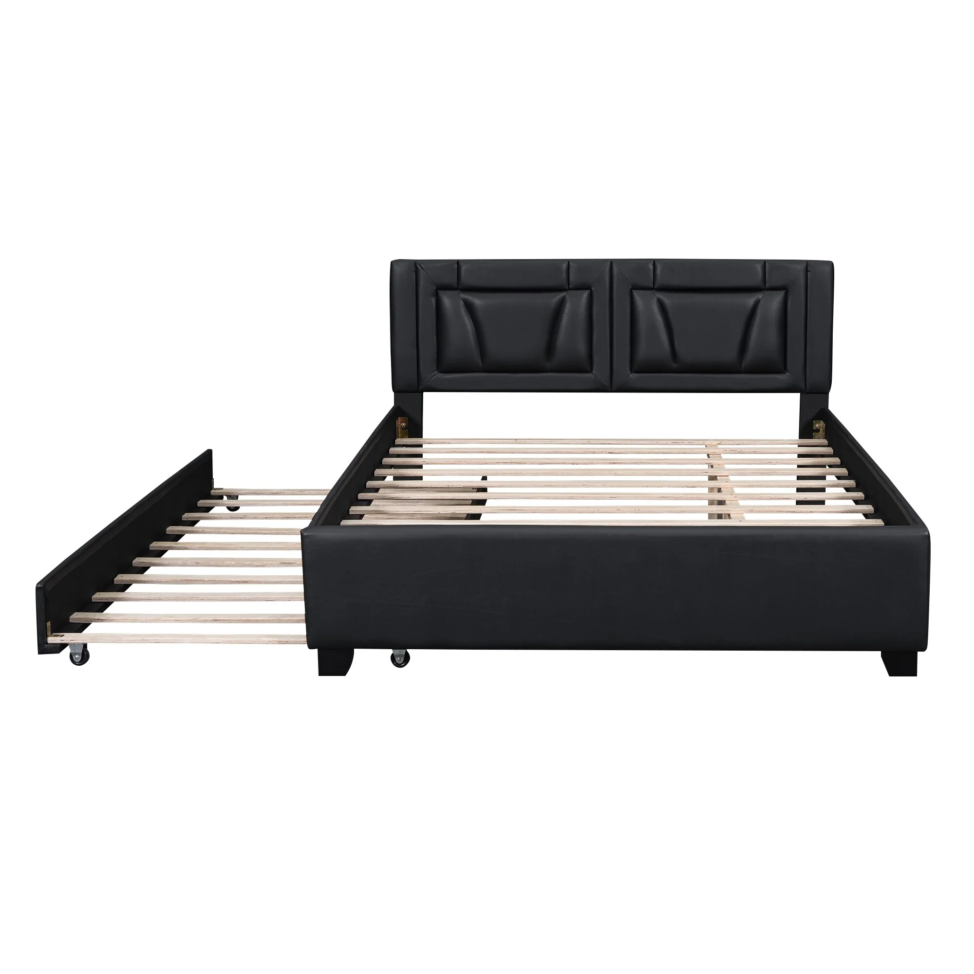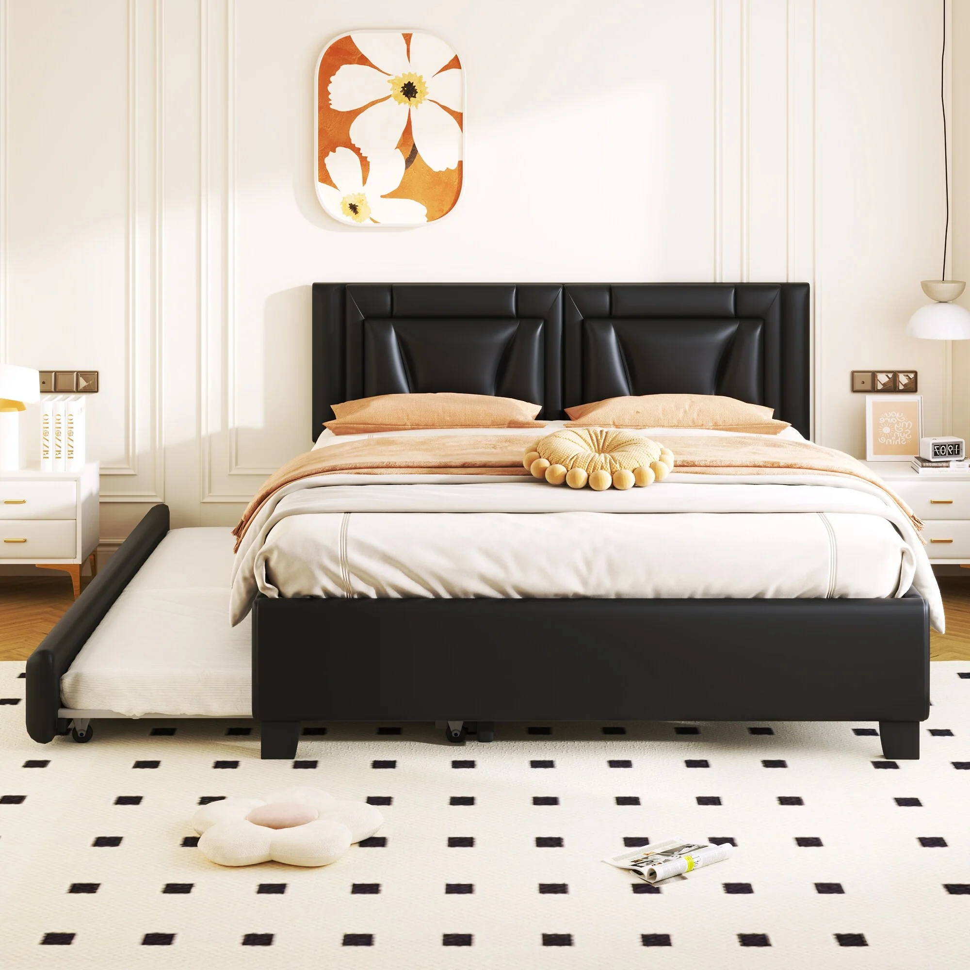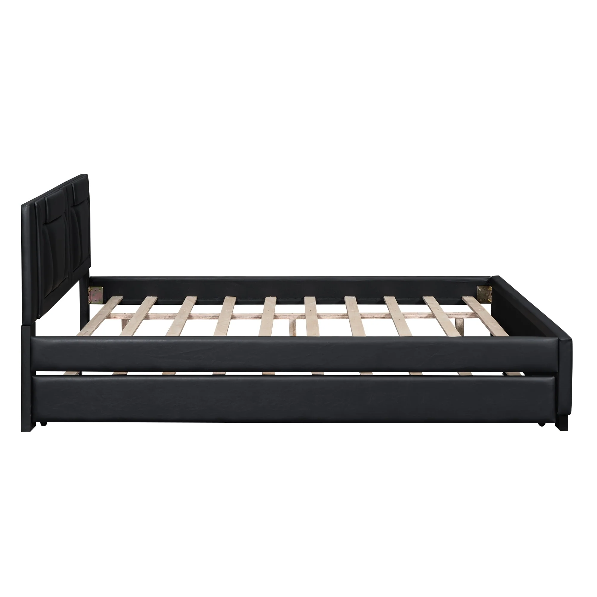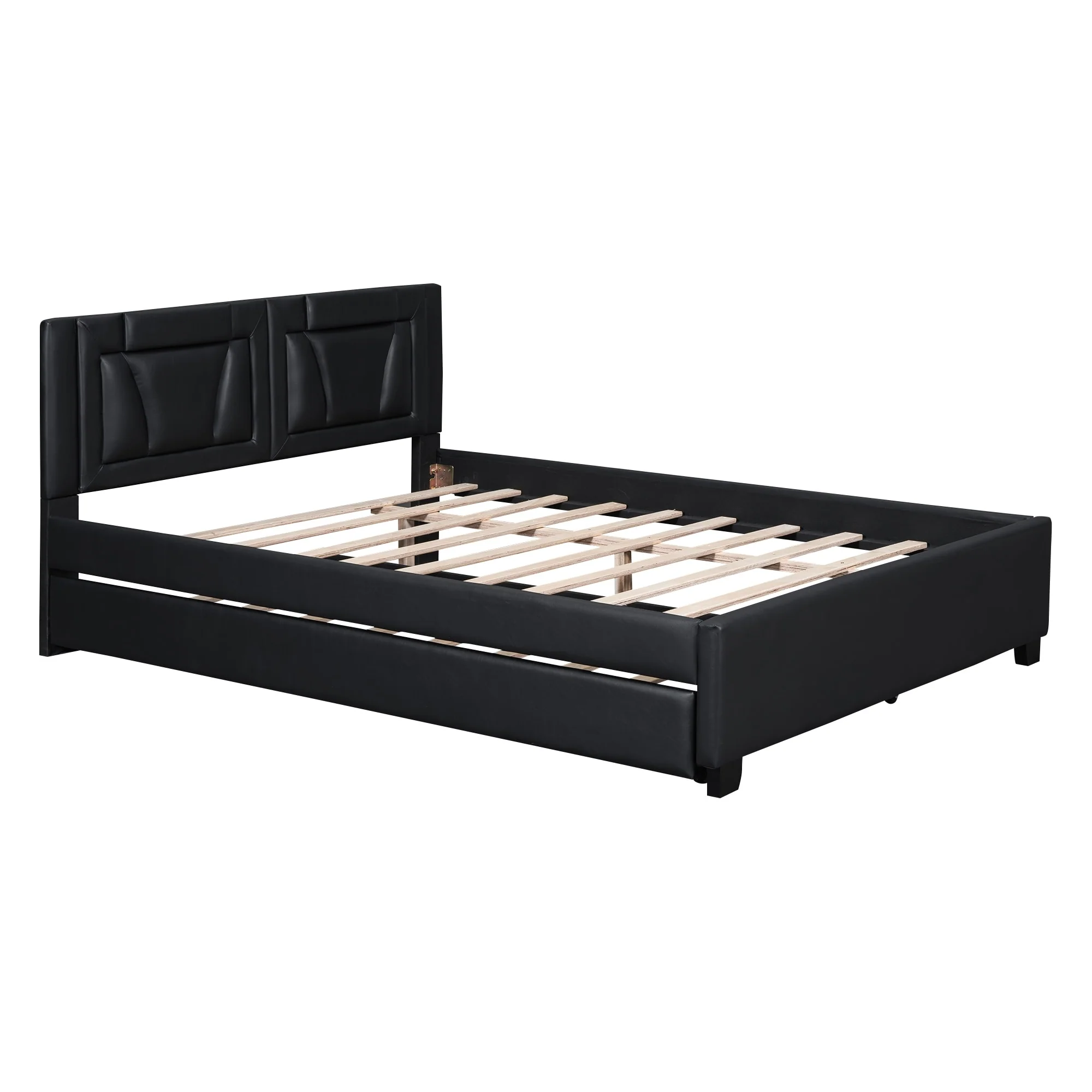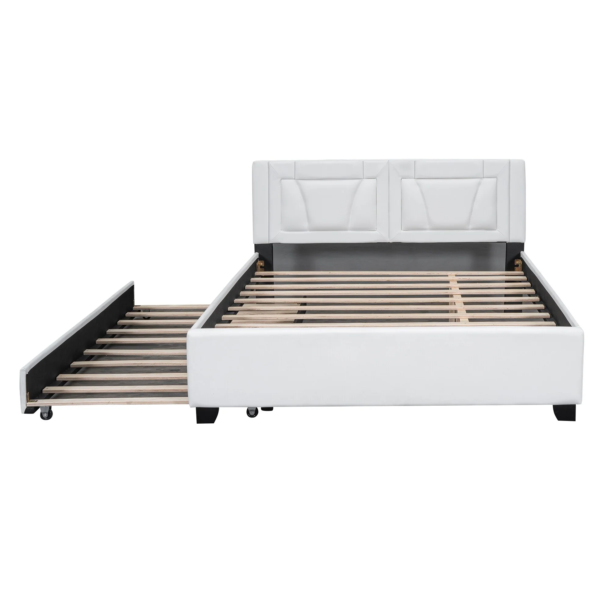 Queen Size Upholstered Platform Bed with Headboard and Twin Trundle, White