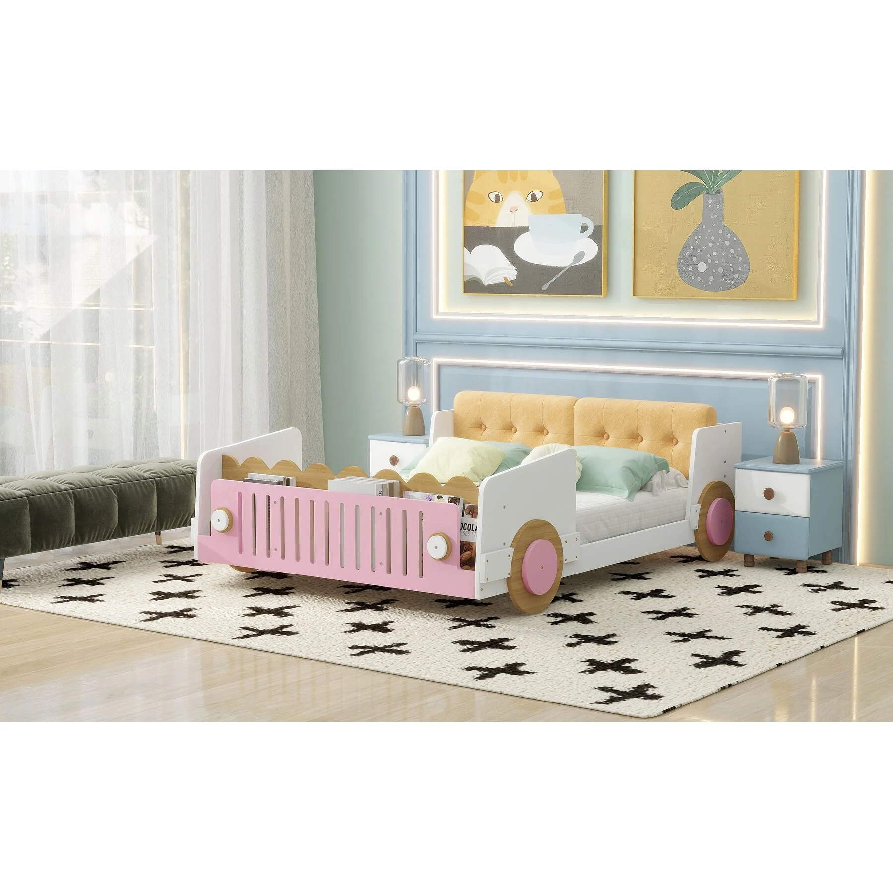 Full Size Car-Shaped Platform Bed with Soft Cushion and Footboard Shelves