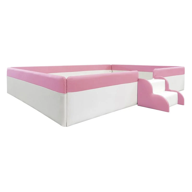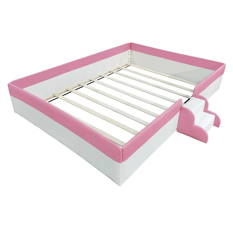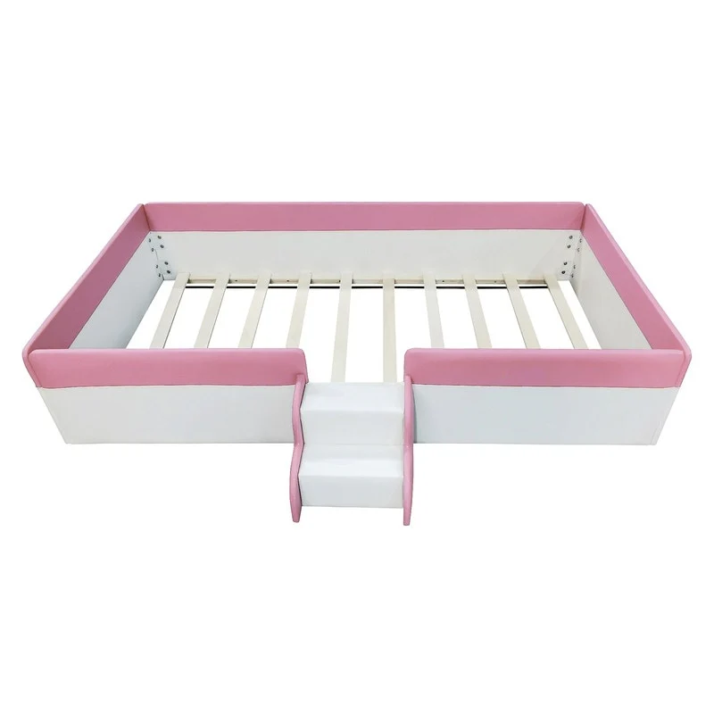 Twin/ Full/ Queen/ King Size Upholstered Kids Floor Bed Frame with Guardrail and Little Stairs, Soft PU Platform Bed