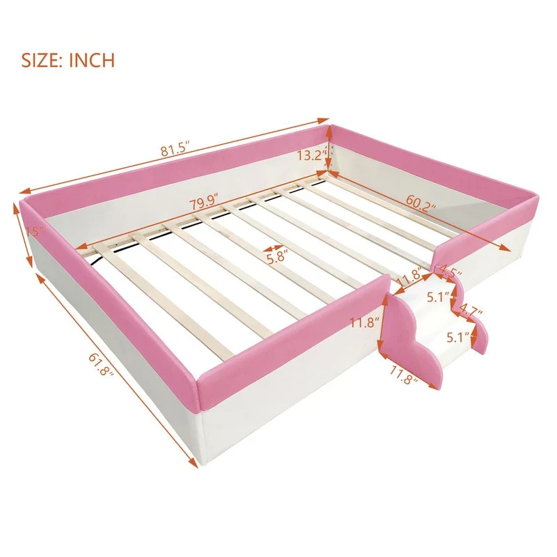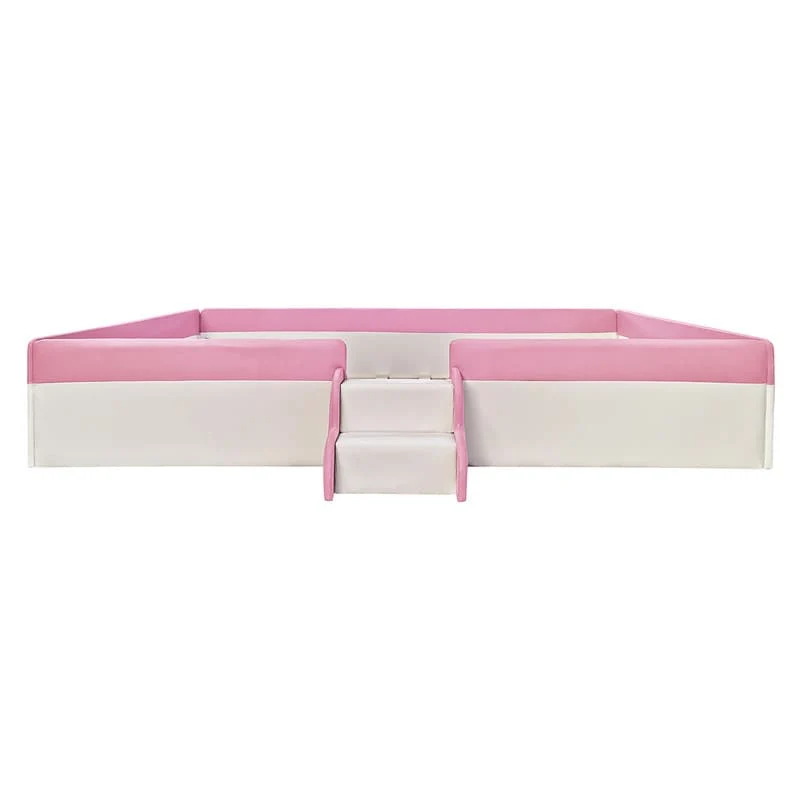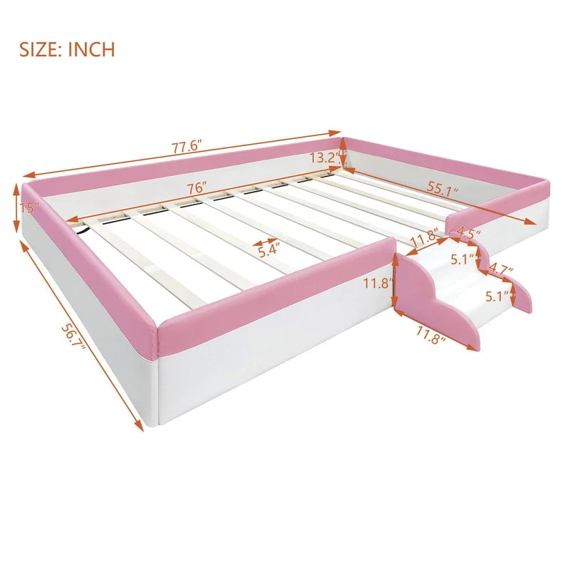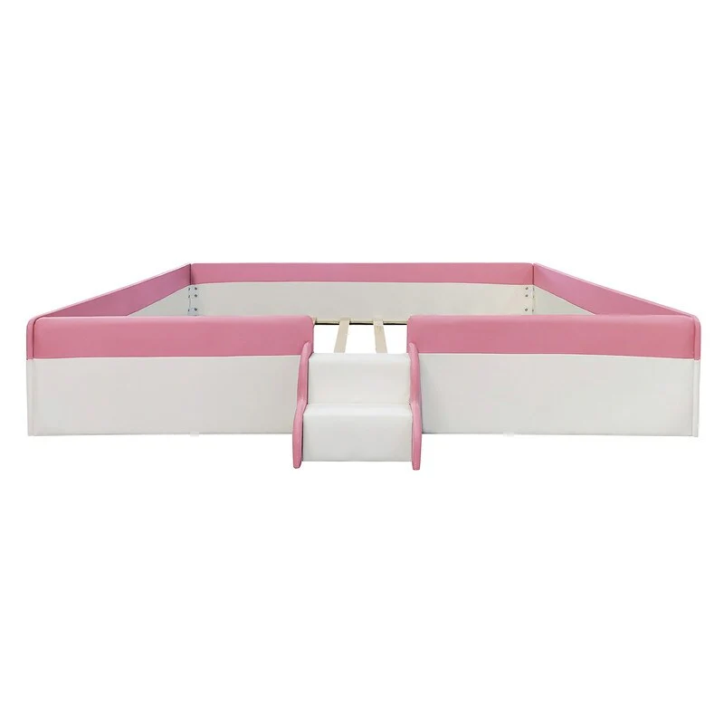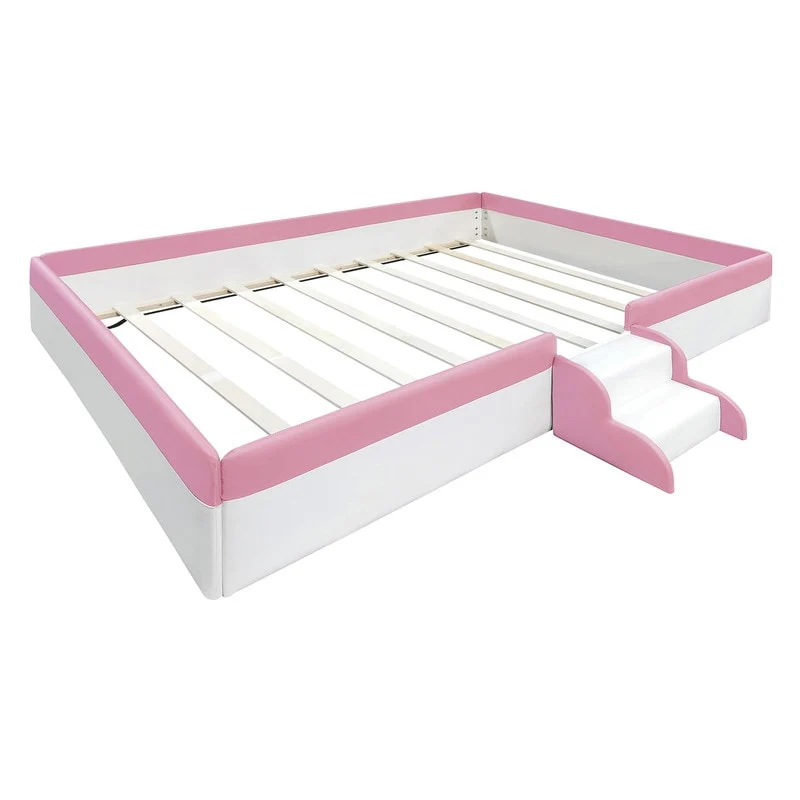 Twin/ Full/ Queen/ King Size Upholstered Kids Floor Bed Frame with Guardrail and Little Stairs, Soft PU Platform Bed
