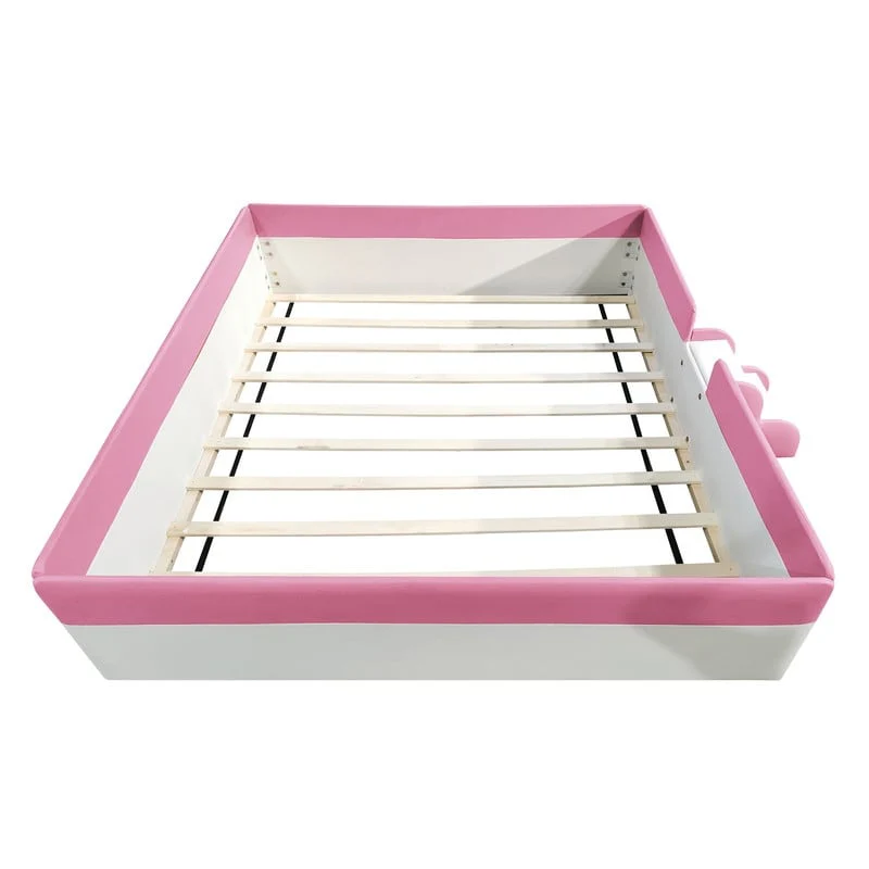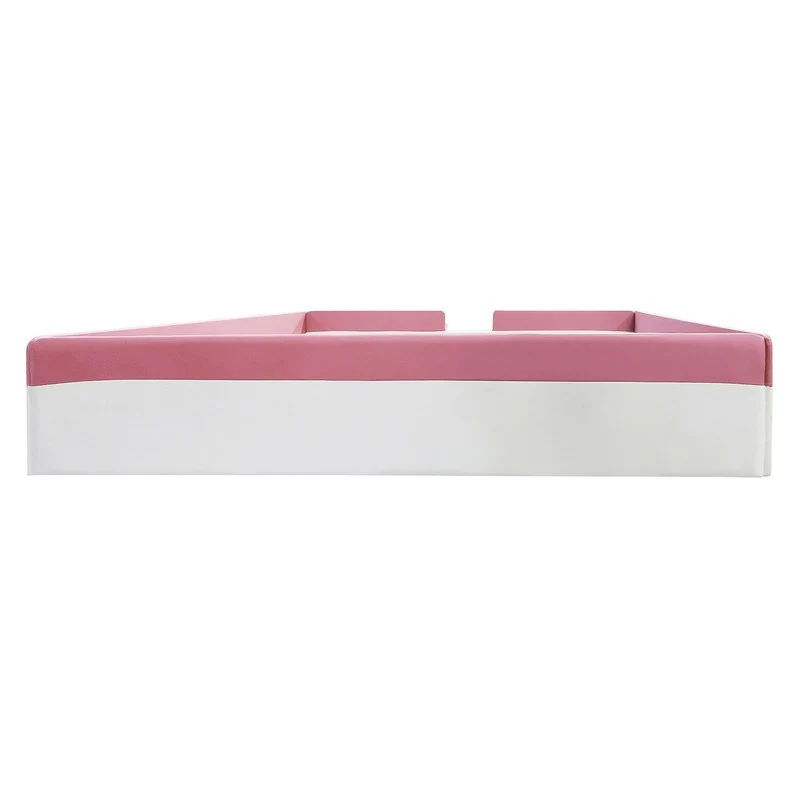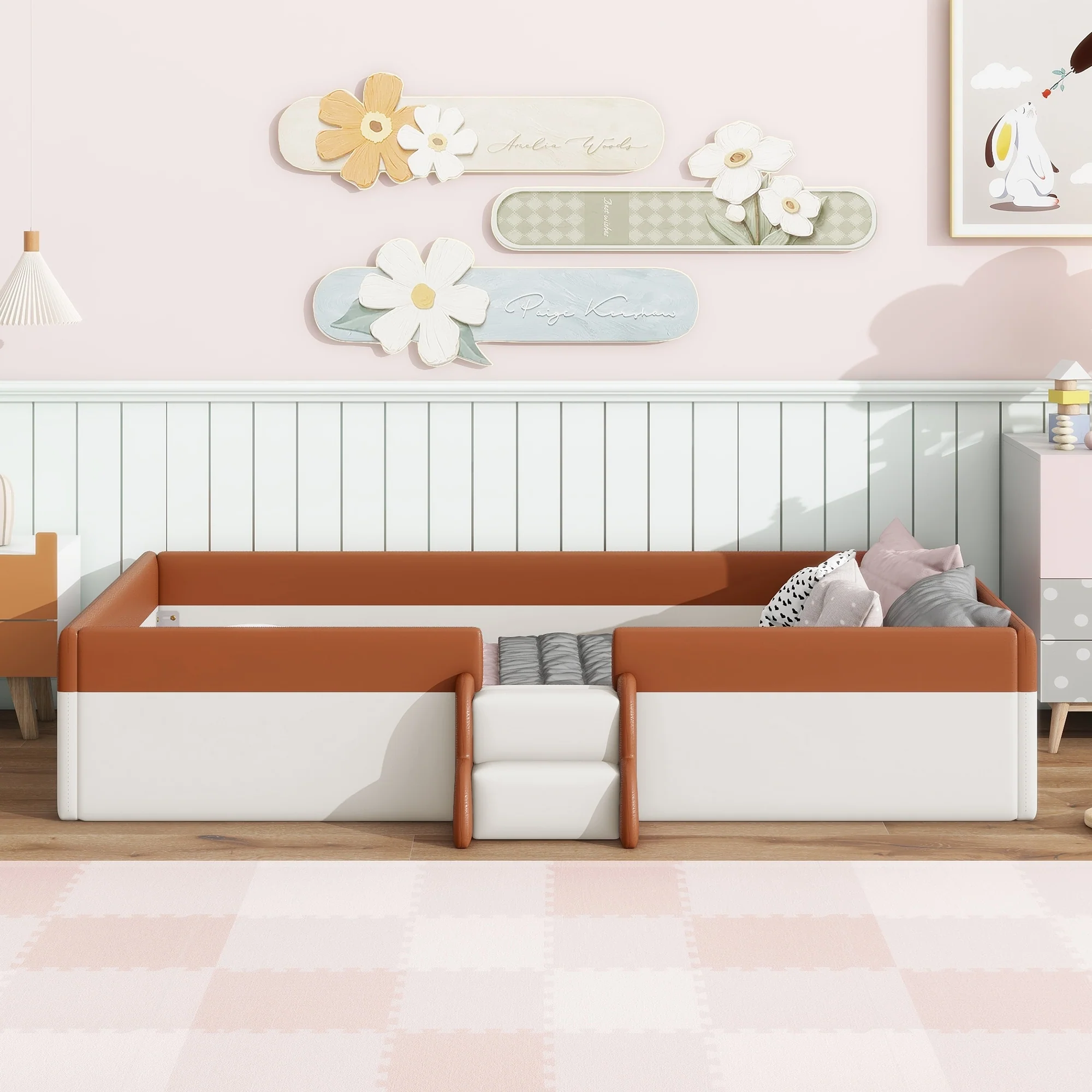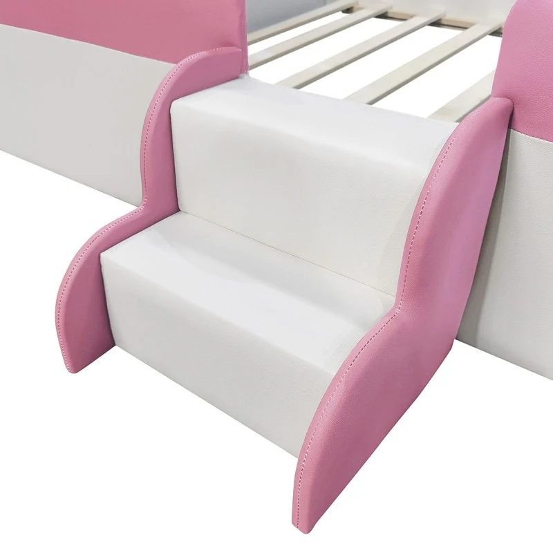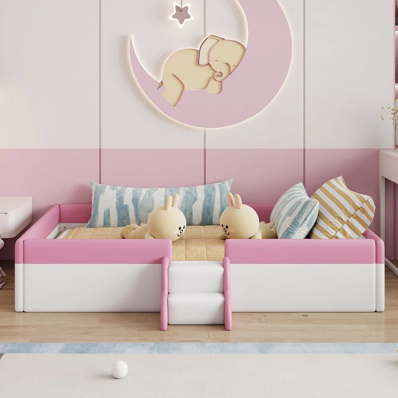 Twin/ Full/ Queen/ King Size Upholstered Kids Floor Bed Frame with Guardrail and Little Stairs, Soft PU Platform Bed