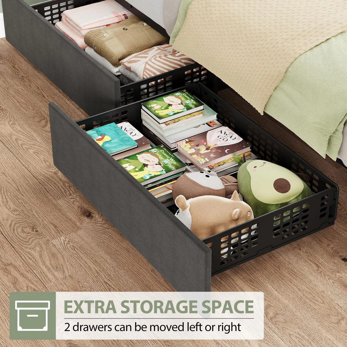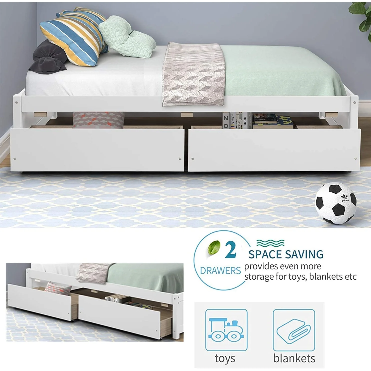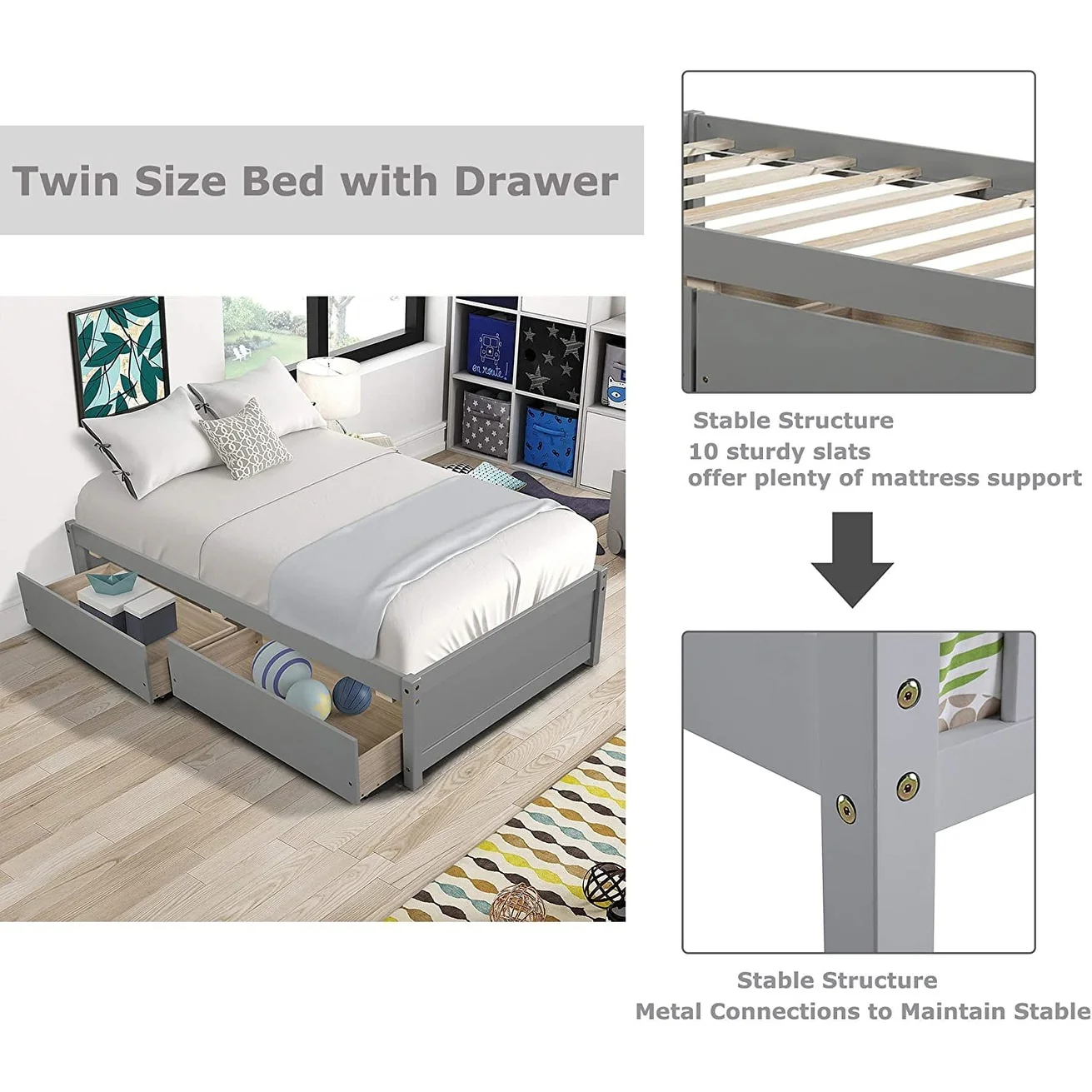 Twin Platform Bed Frame with 2 Storage Drawers, Wood Twin Bed Frames for Kids Toddler Girls Boys