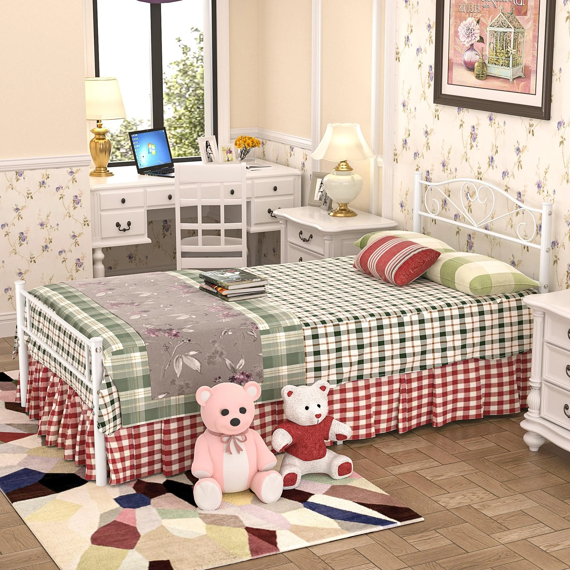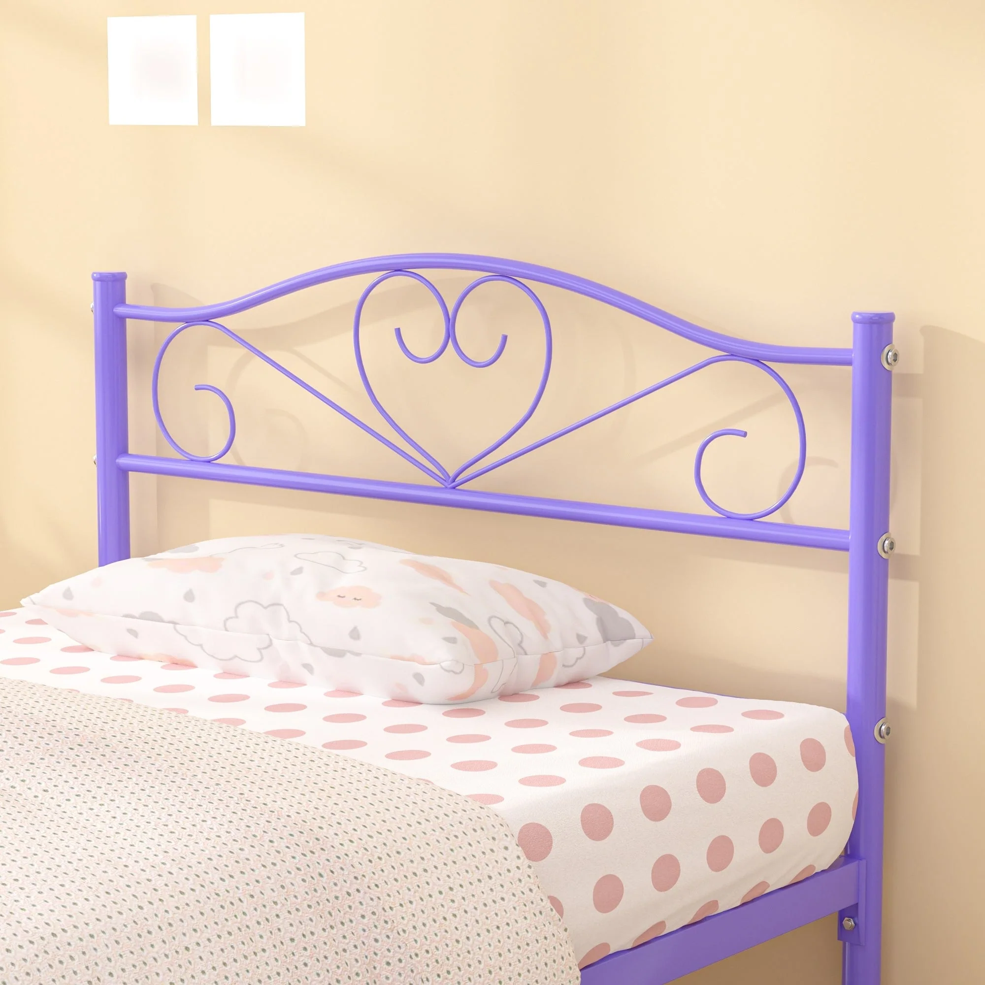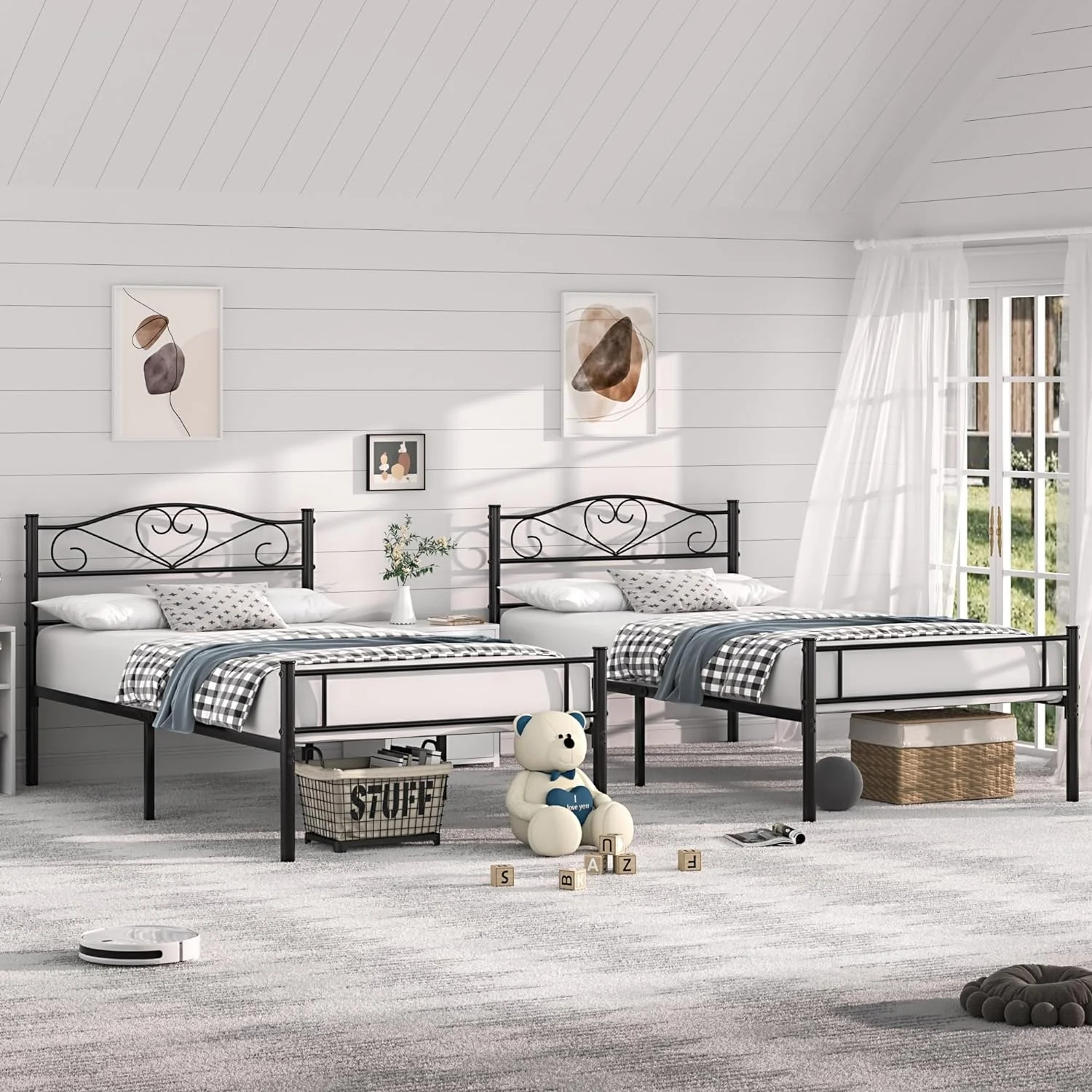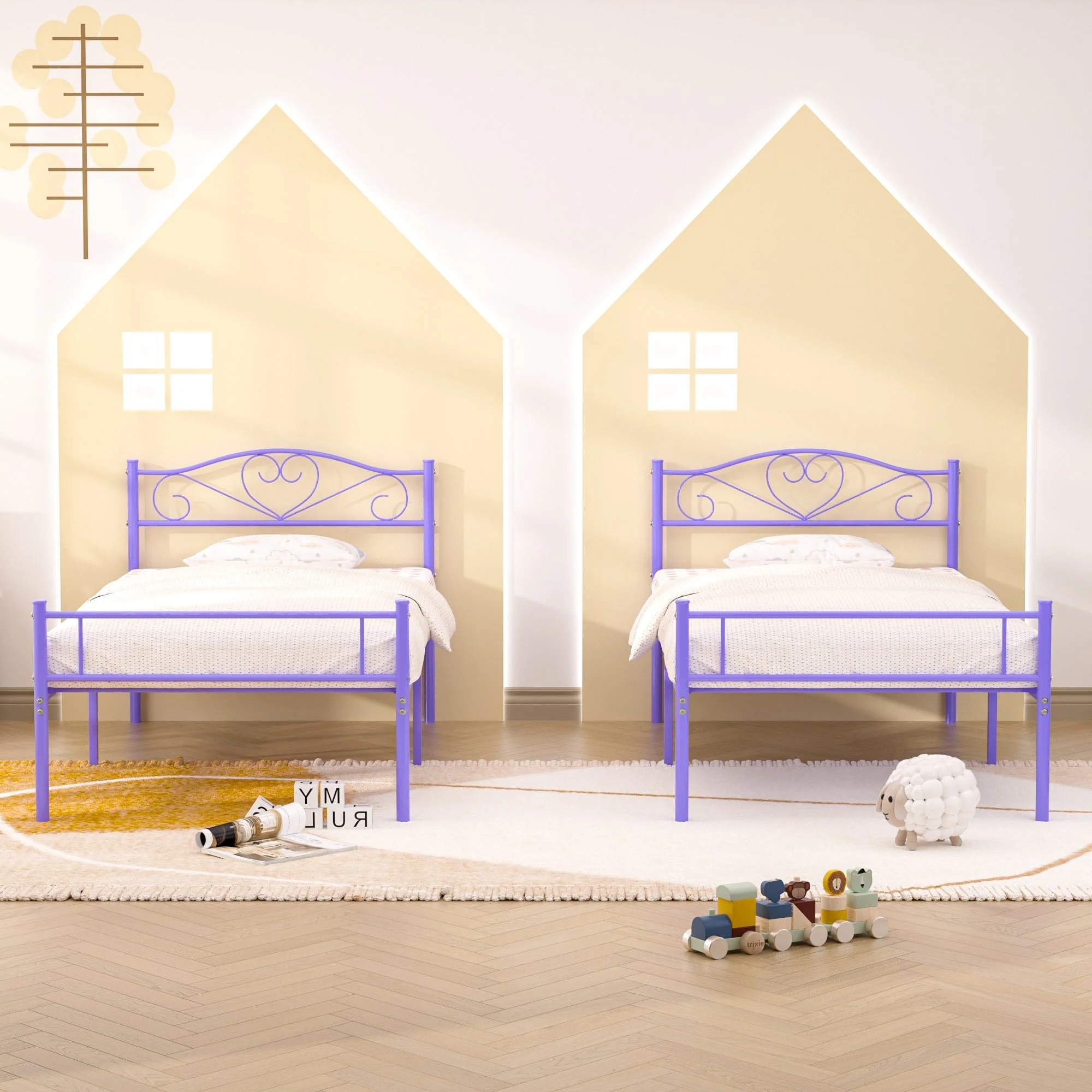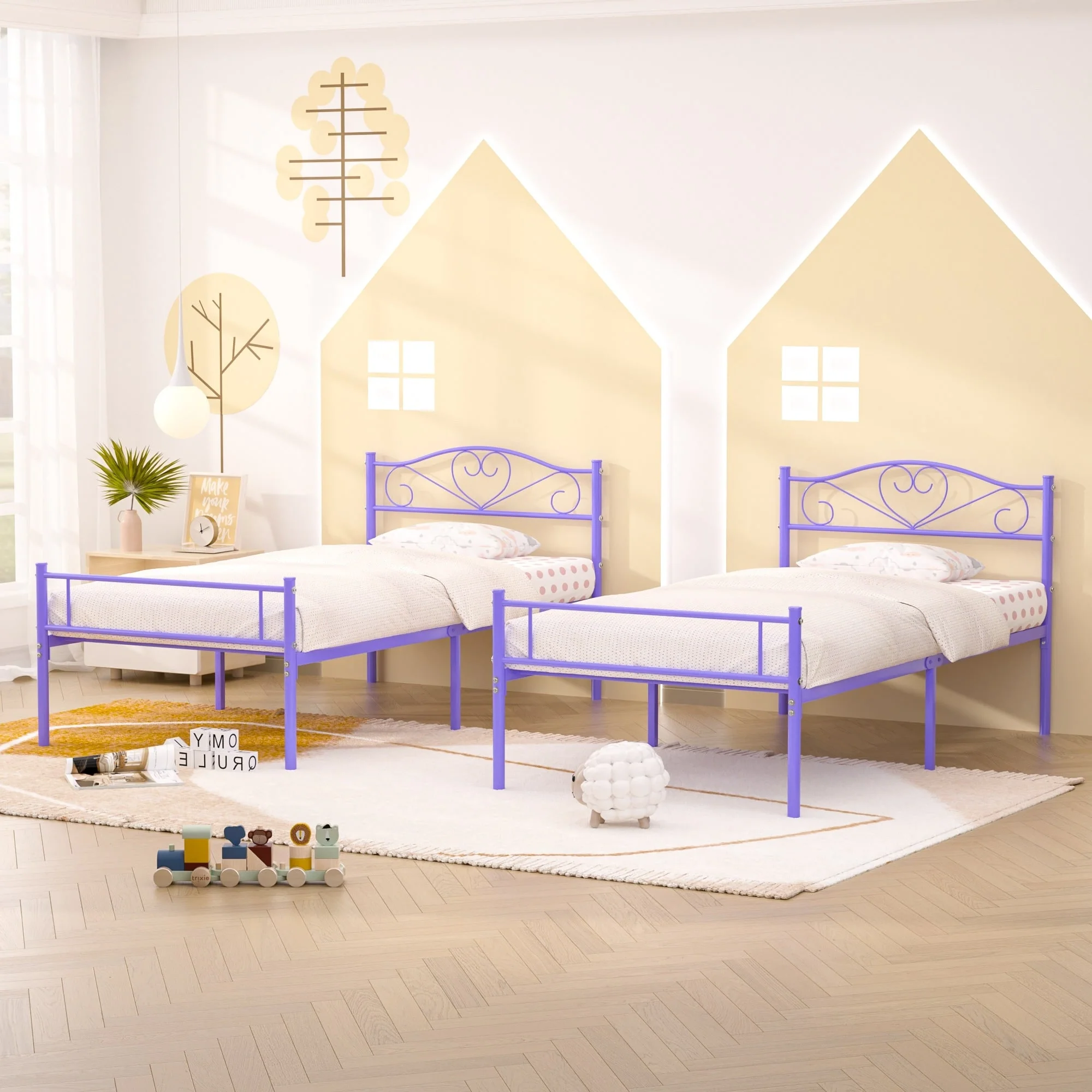 VECELO Kids Bed Frame with Headboard & Metal Slat,Twin Size Bed Set of 2