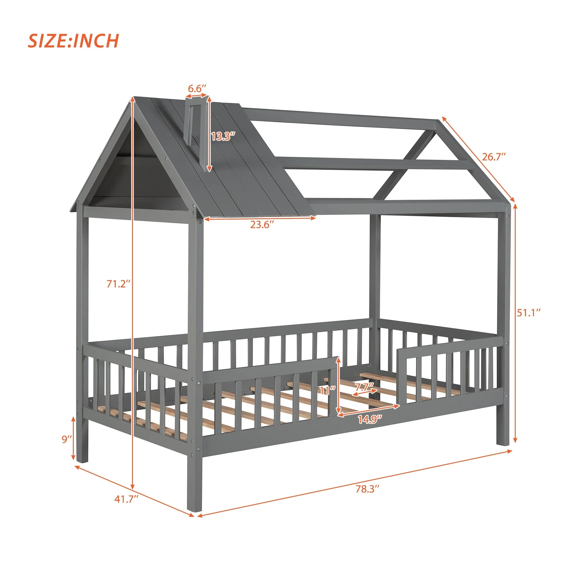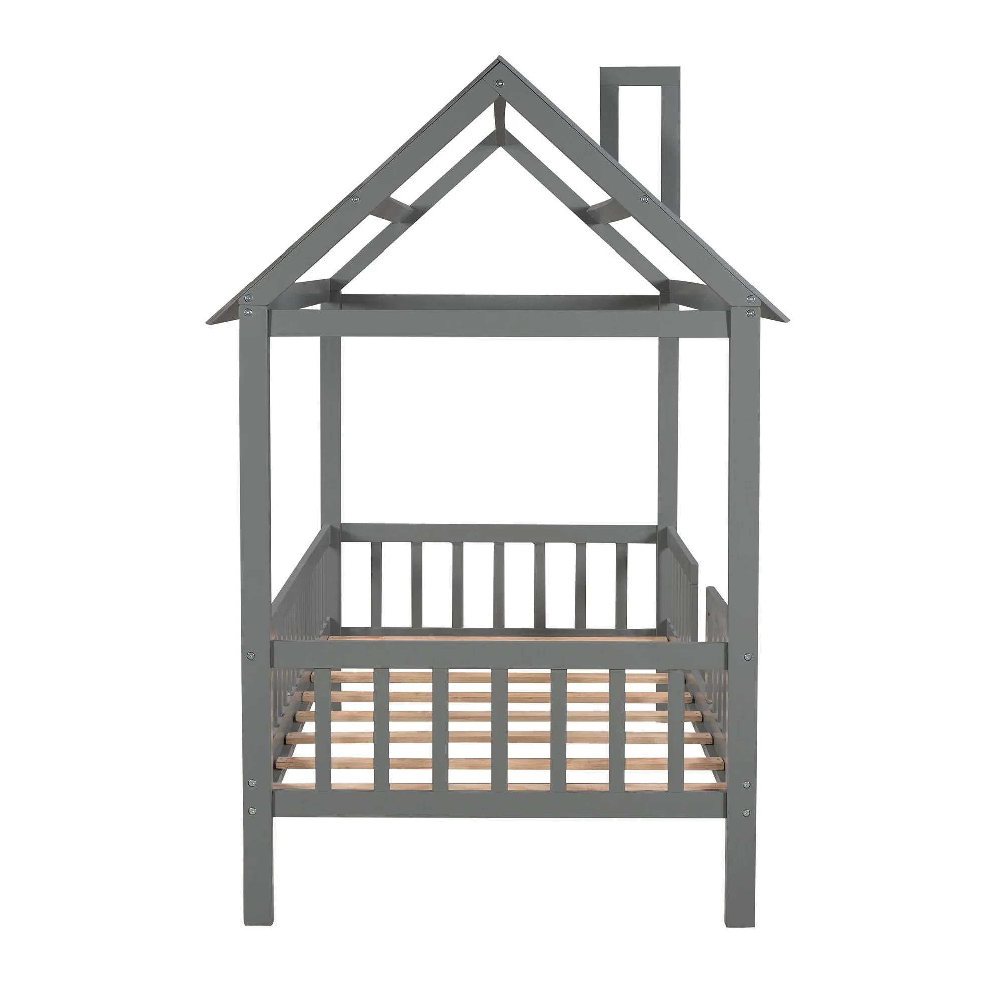Twin Size House Bed with Fence, Semi-enclosed Play Platform Bed with Roof and Chimney Decoration, for Kids Bedroom