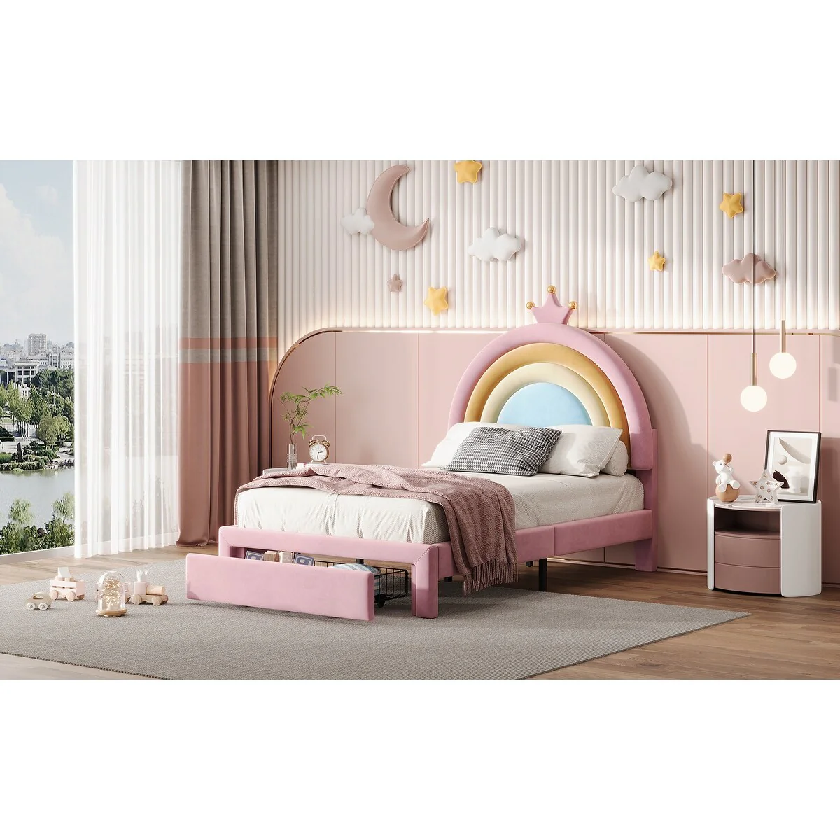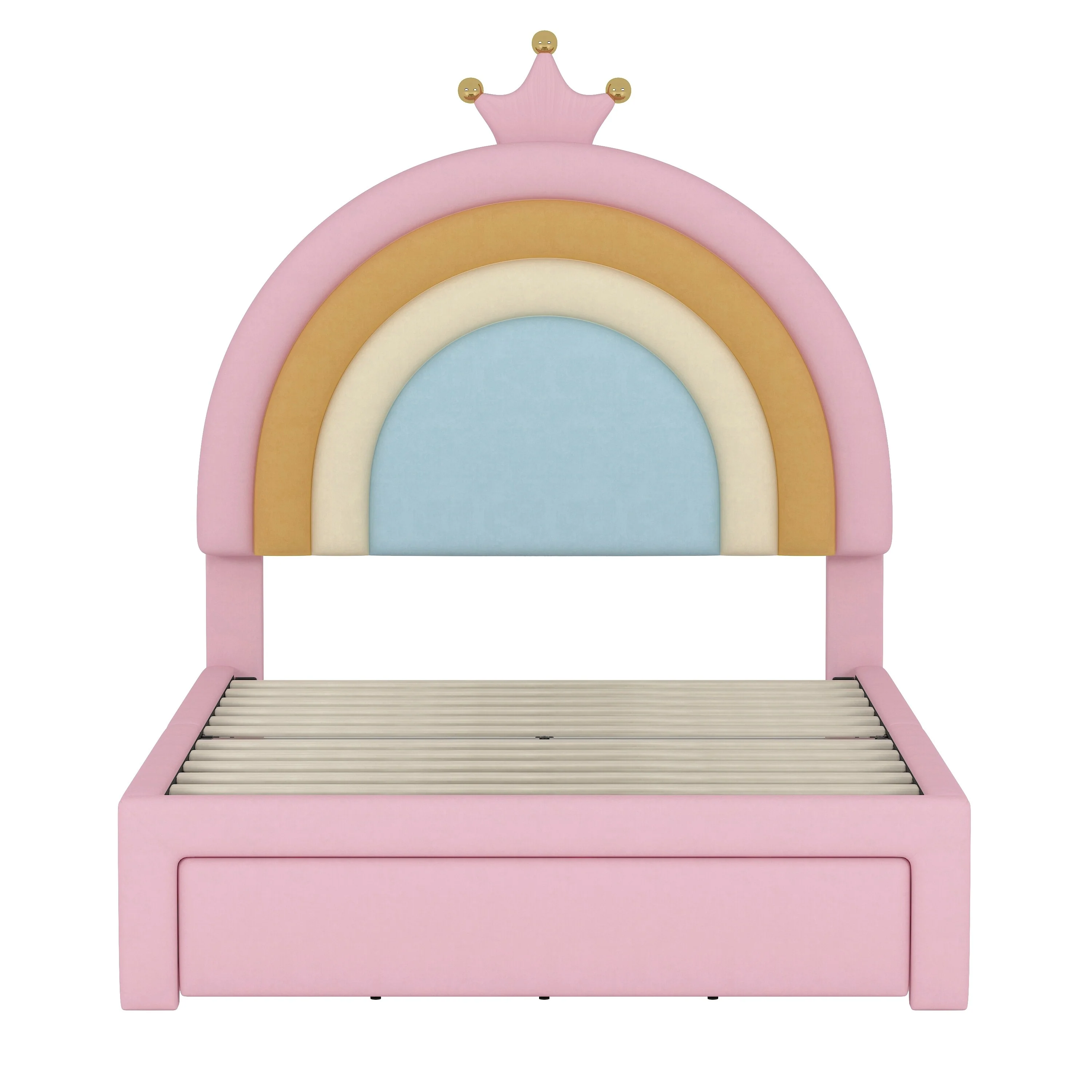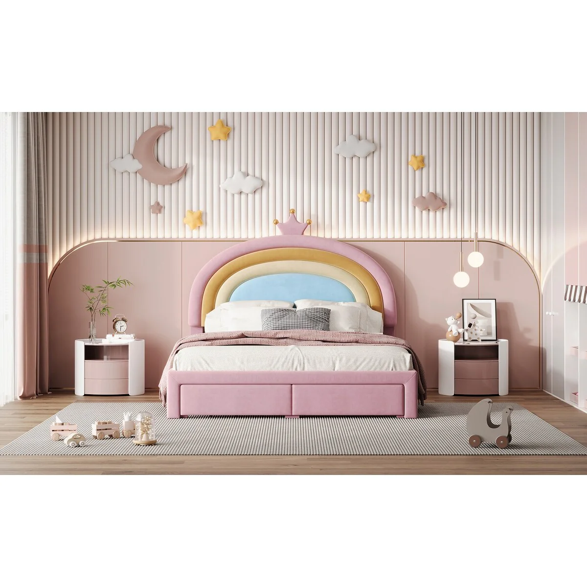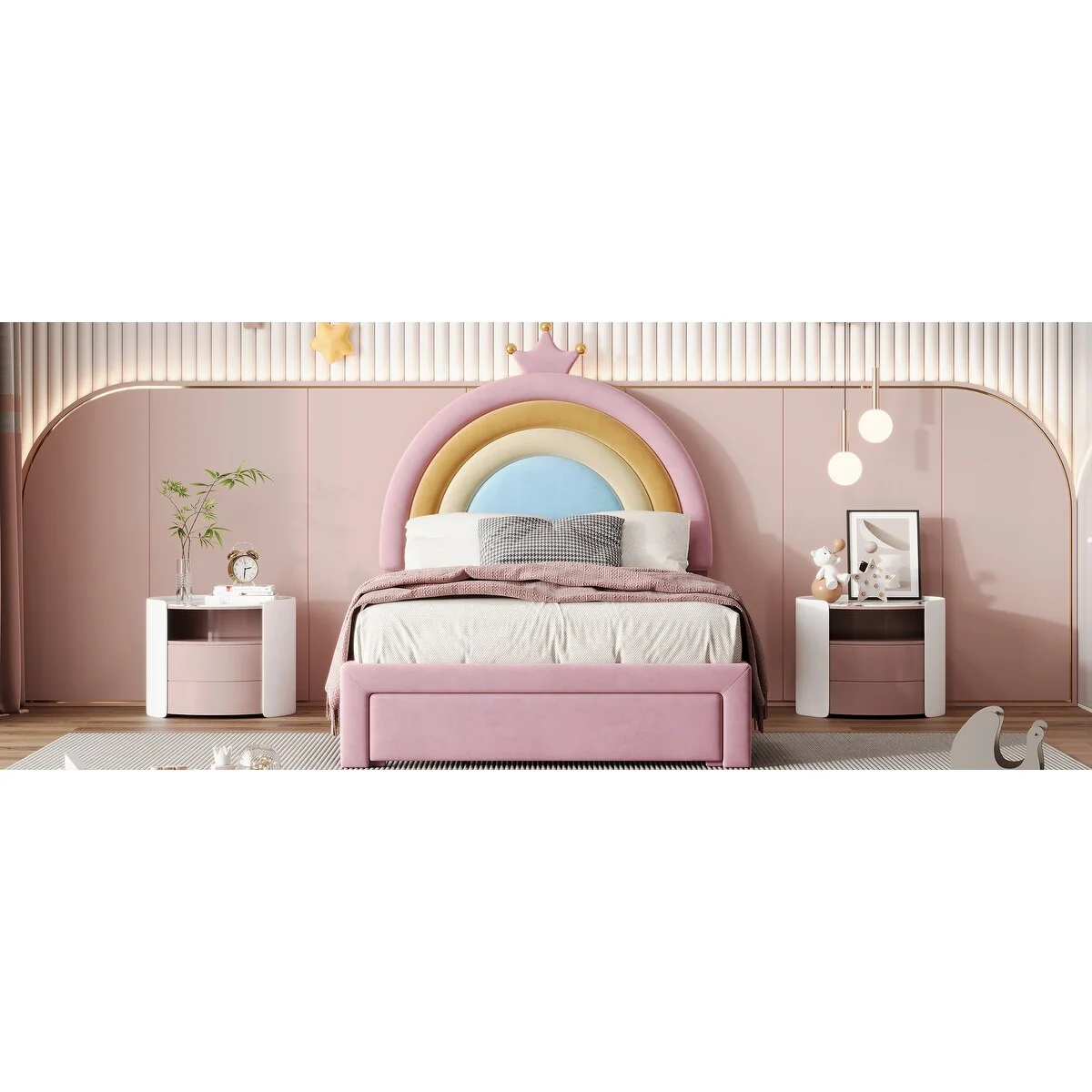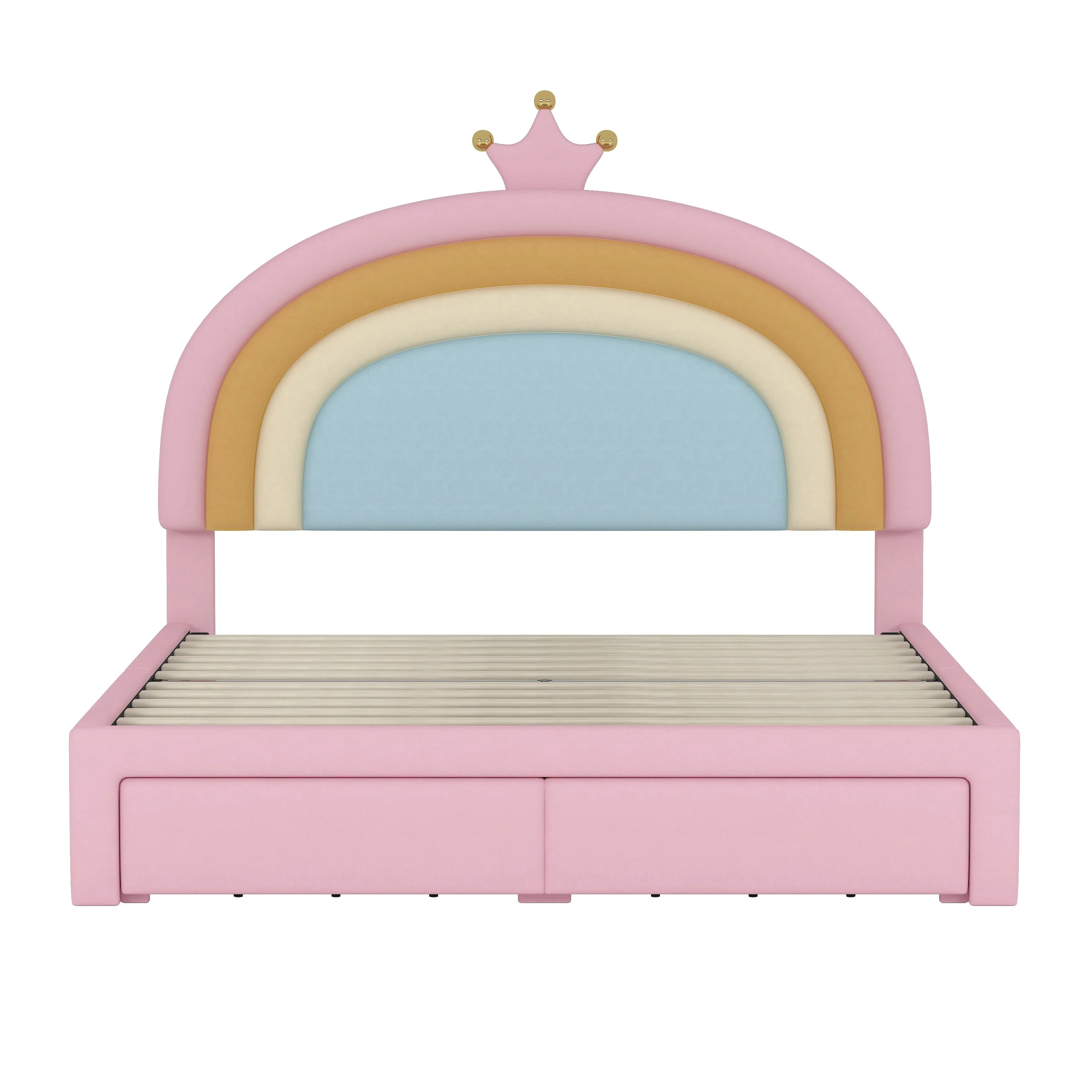 Full Size Velvet Platform Bed with Colorful Rainbow Headboard and 2 Storage Drawers, Upholstered Princess-Style Frame