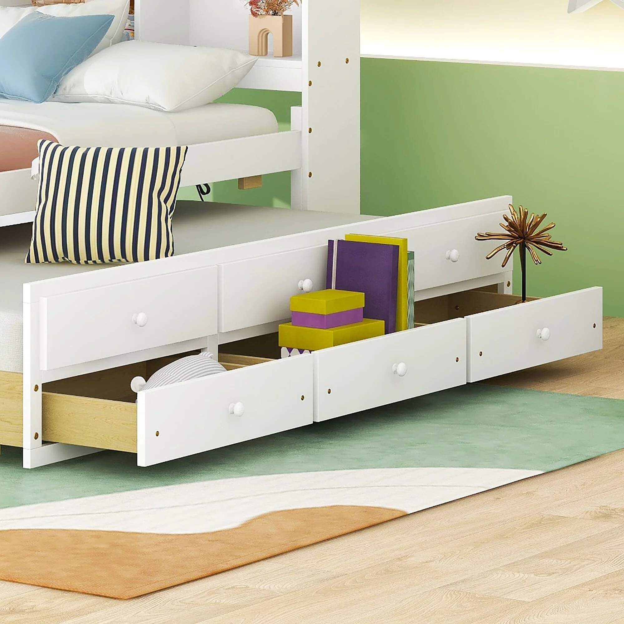Twin Size Wood House Bed with Roof and Drawers