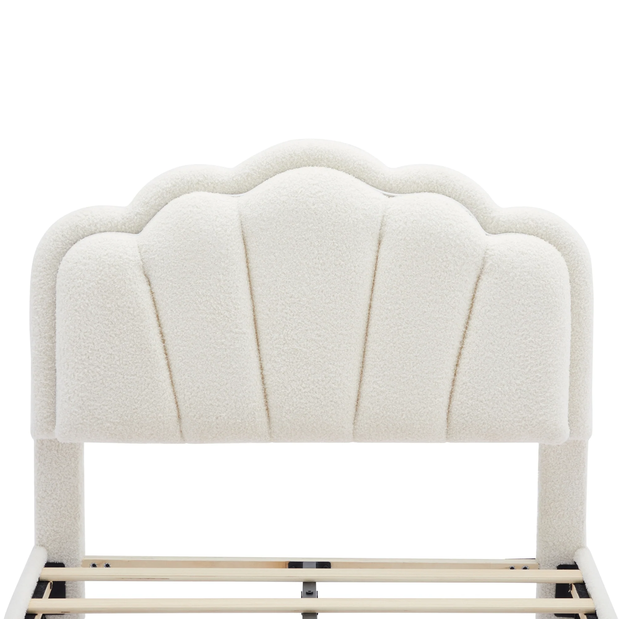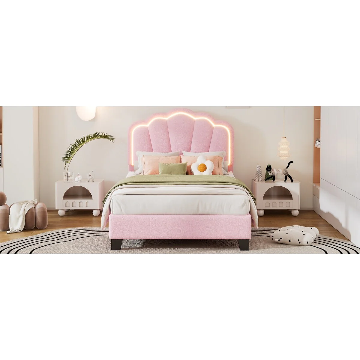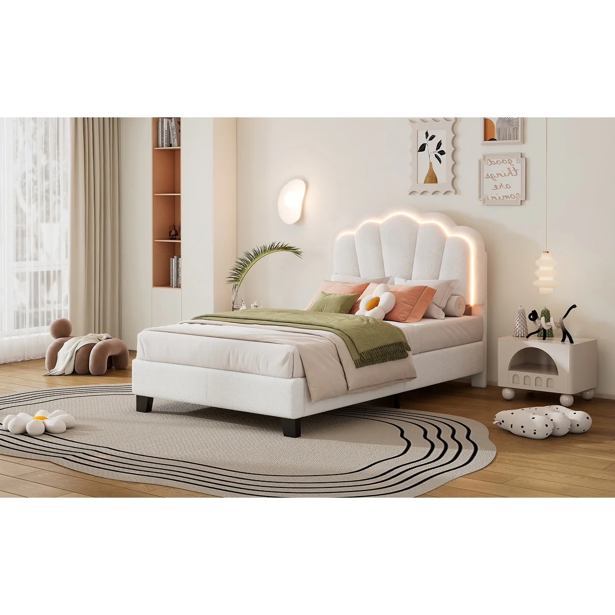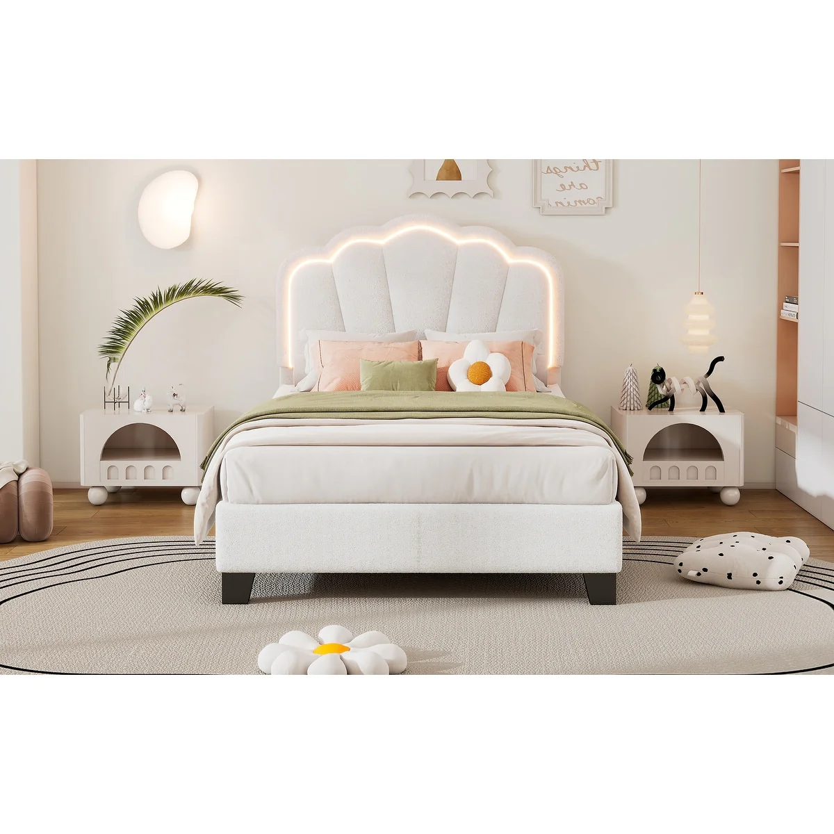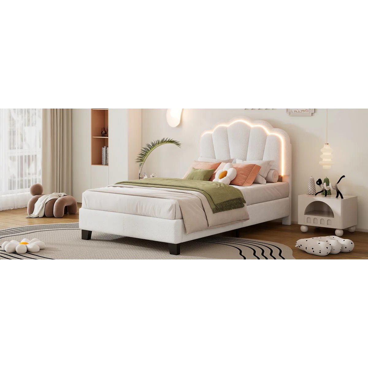 Twin Upholstered Bed with Flower-Inspired Headboard, Adjustable LED Lighting and Sherpa Fabric