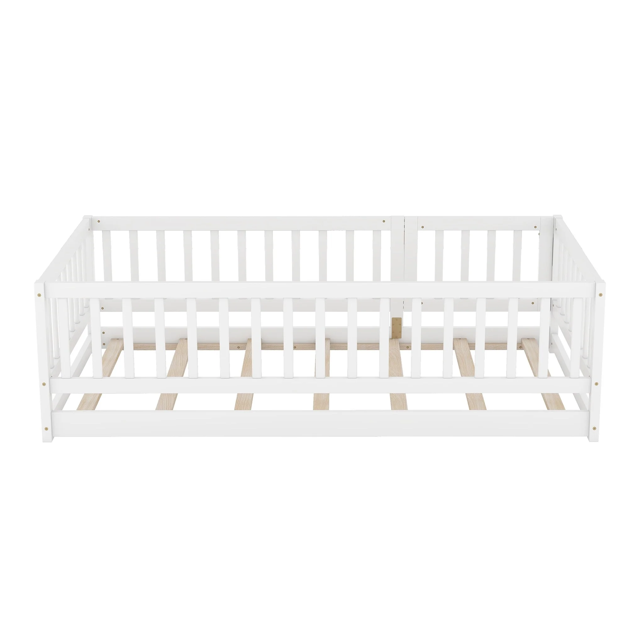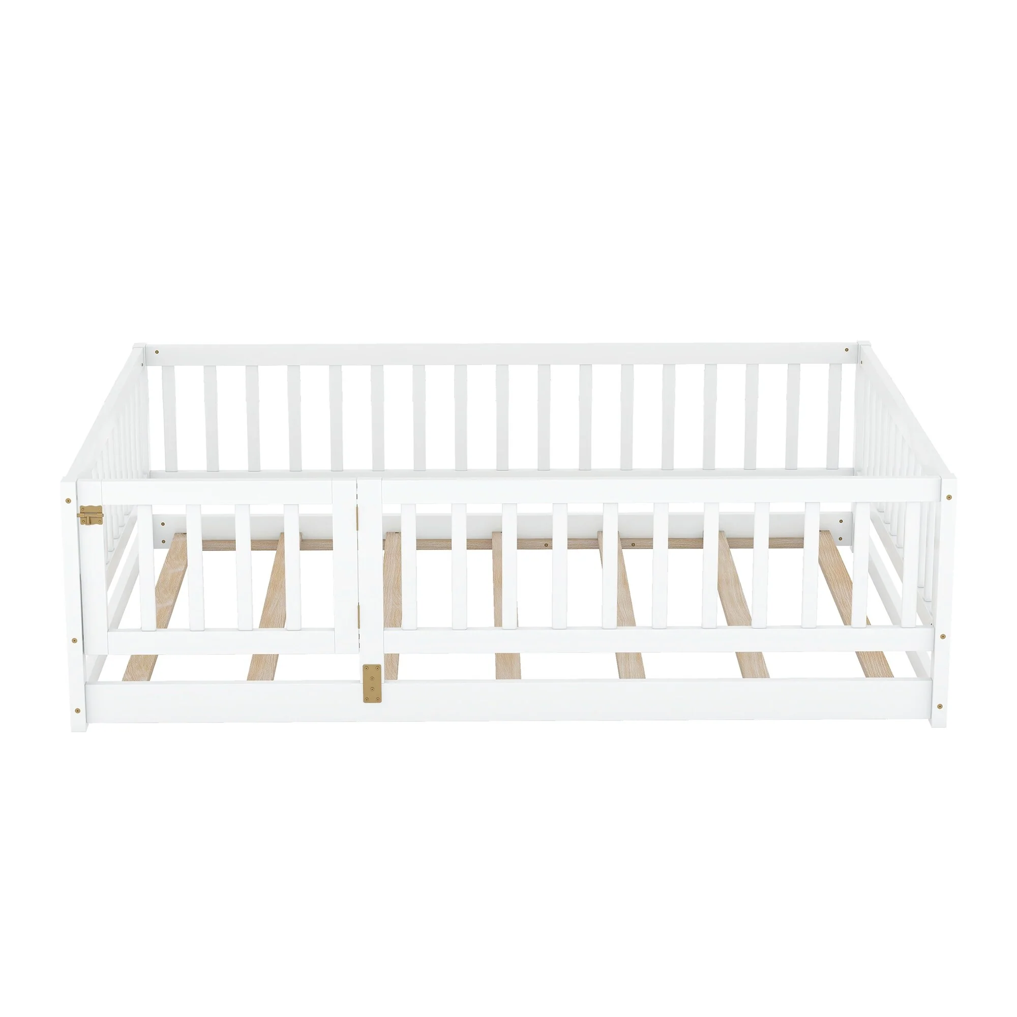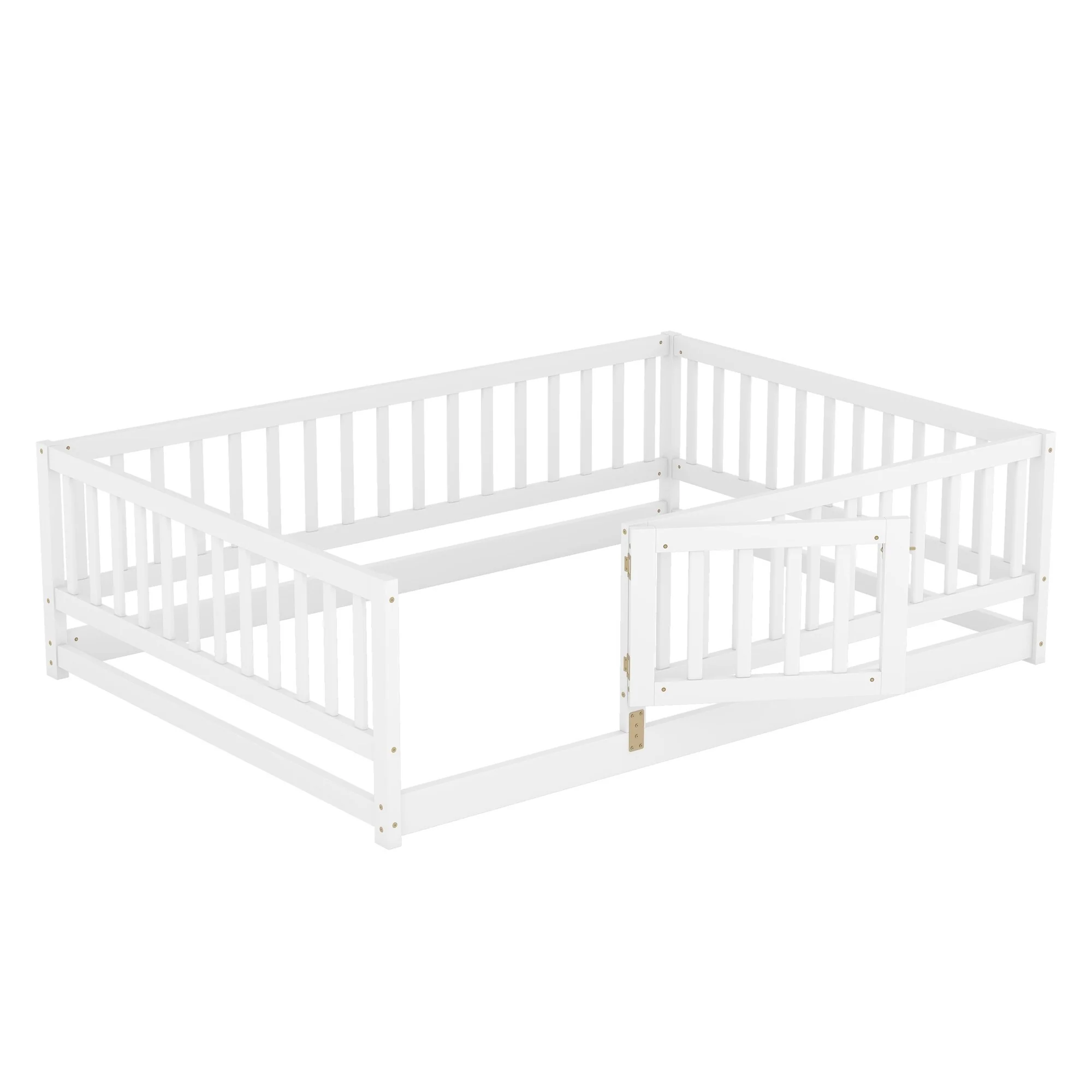 Queen Size Floor Bed Frame for Kids Bed with Fence Guardrails and Removable Door, Slats Playroom Montessori Platform Bed