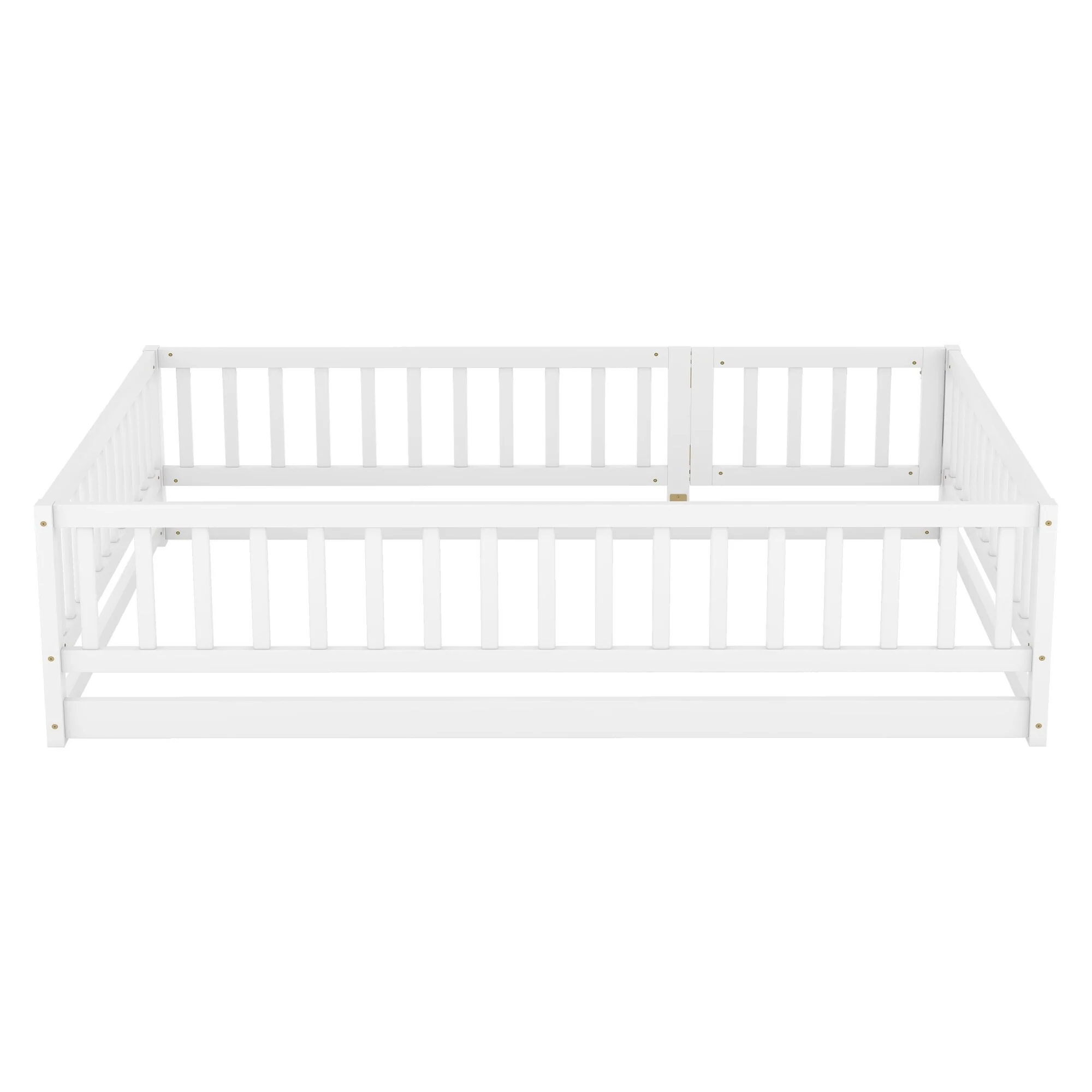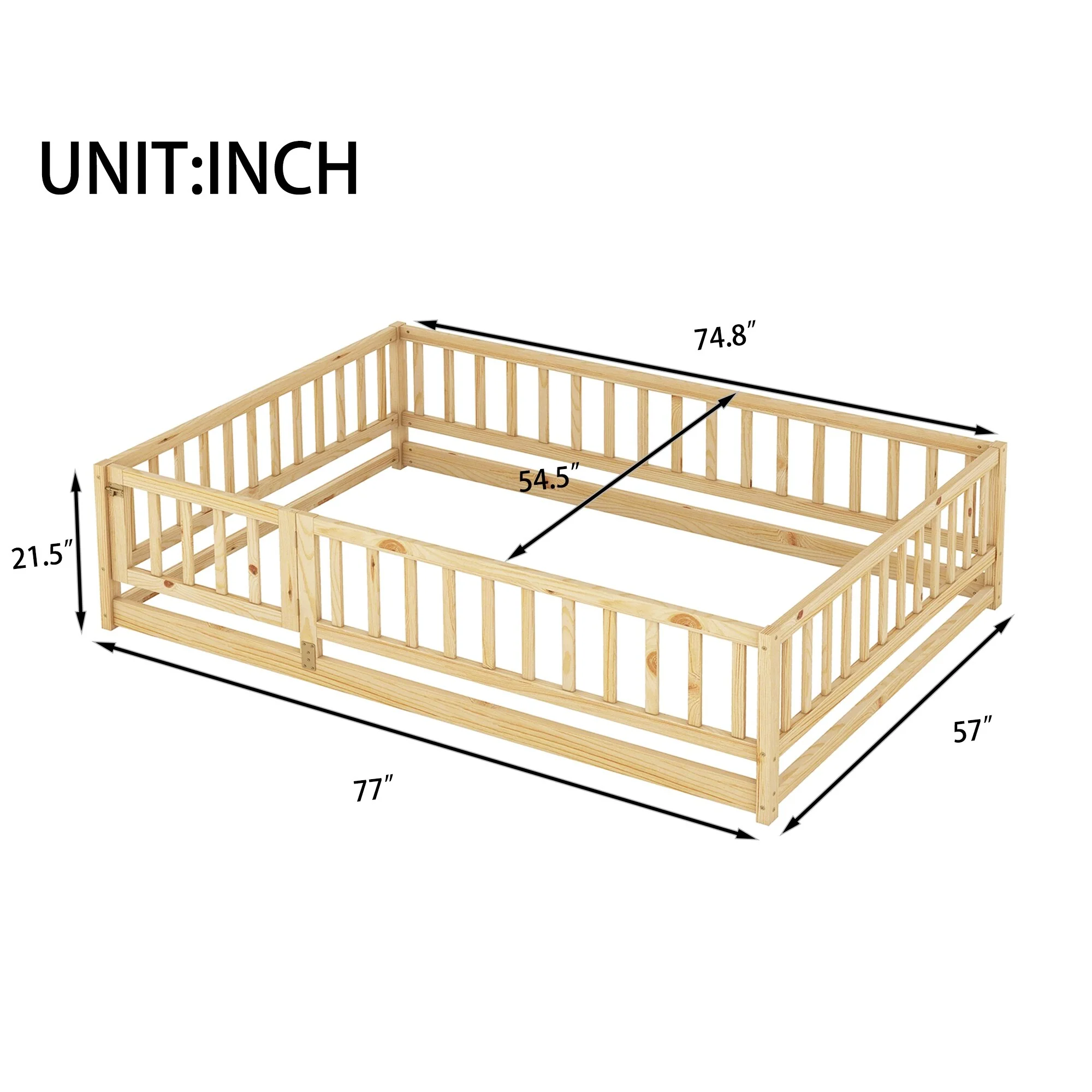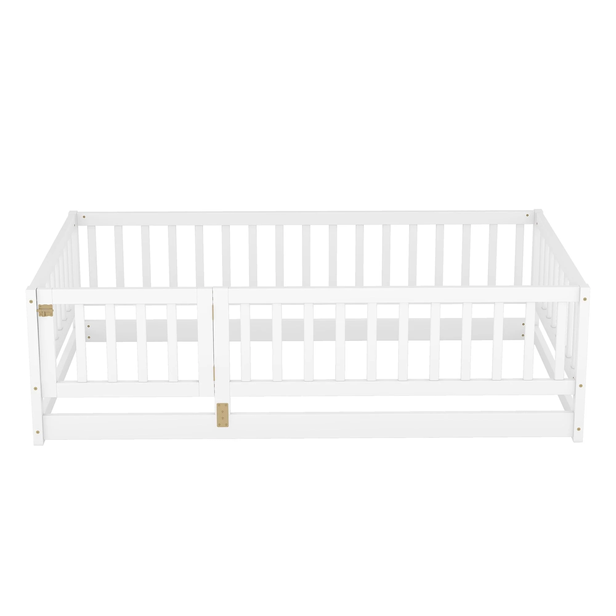 Queen Size Floor Bed Frame for Kids Bed with Fence Guardrails and Removable Door, Slats Playroom Montessori Platform Bed