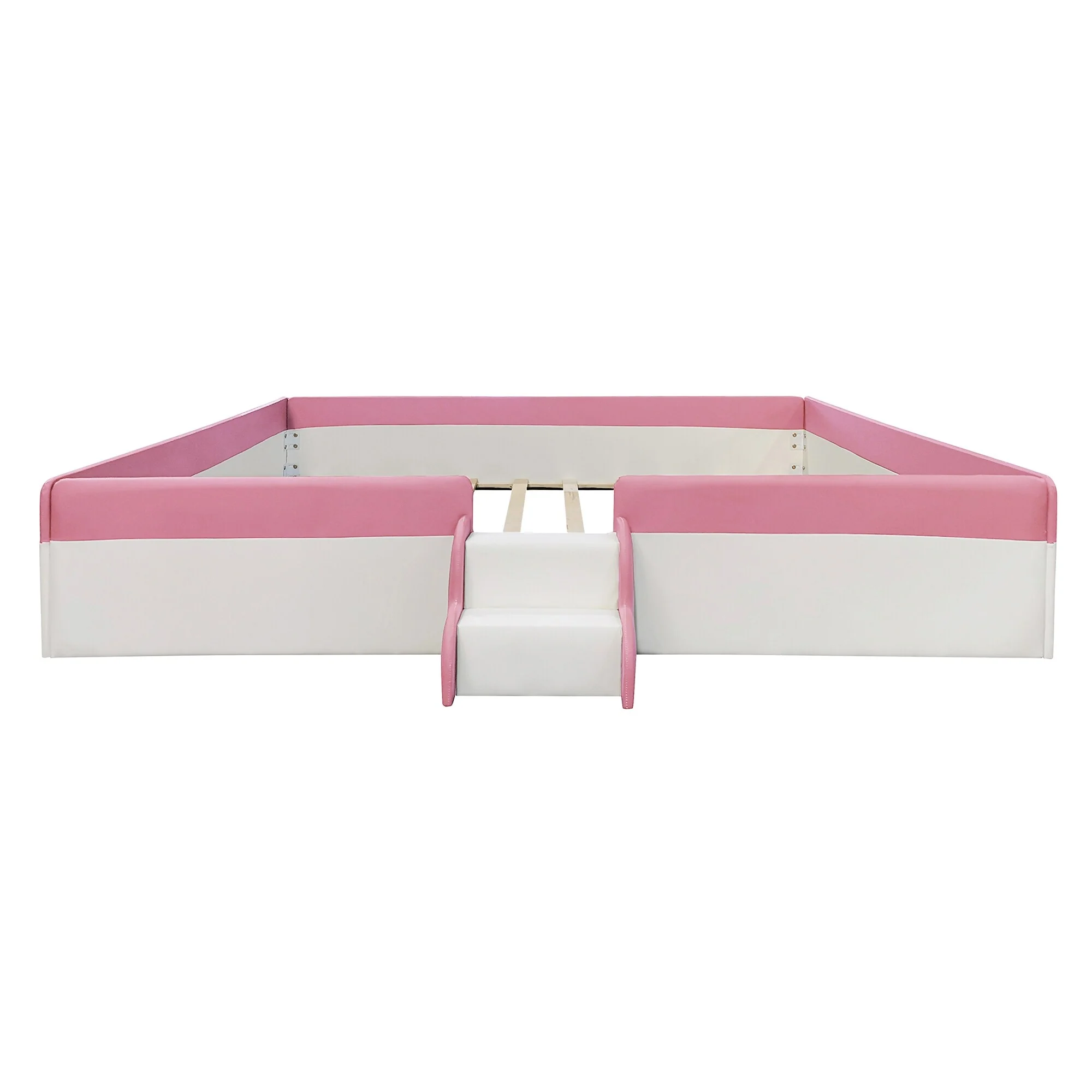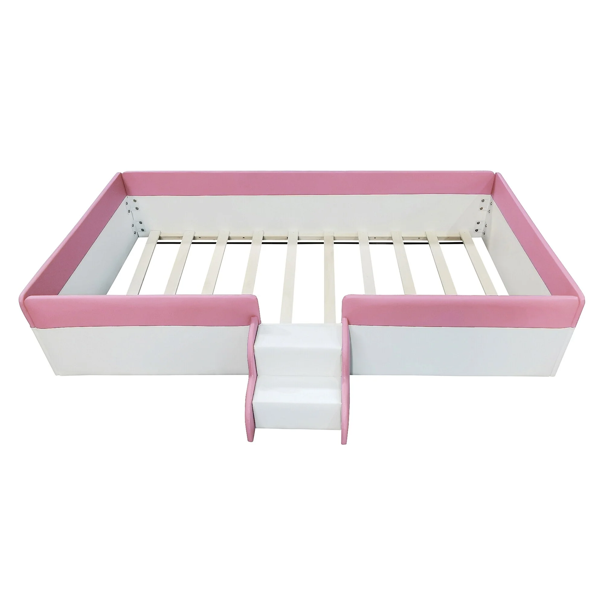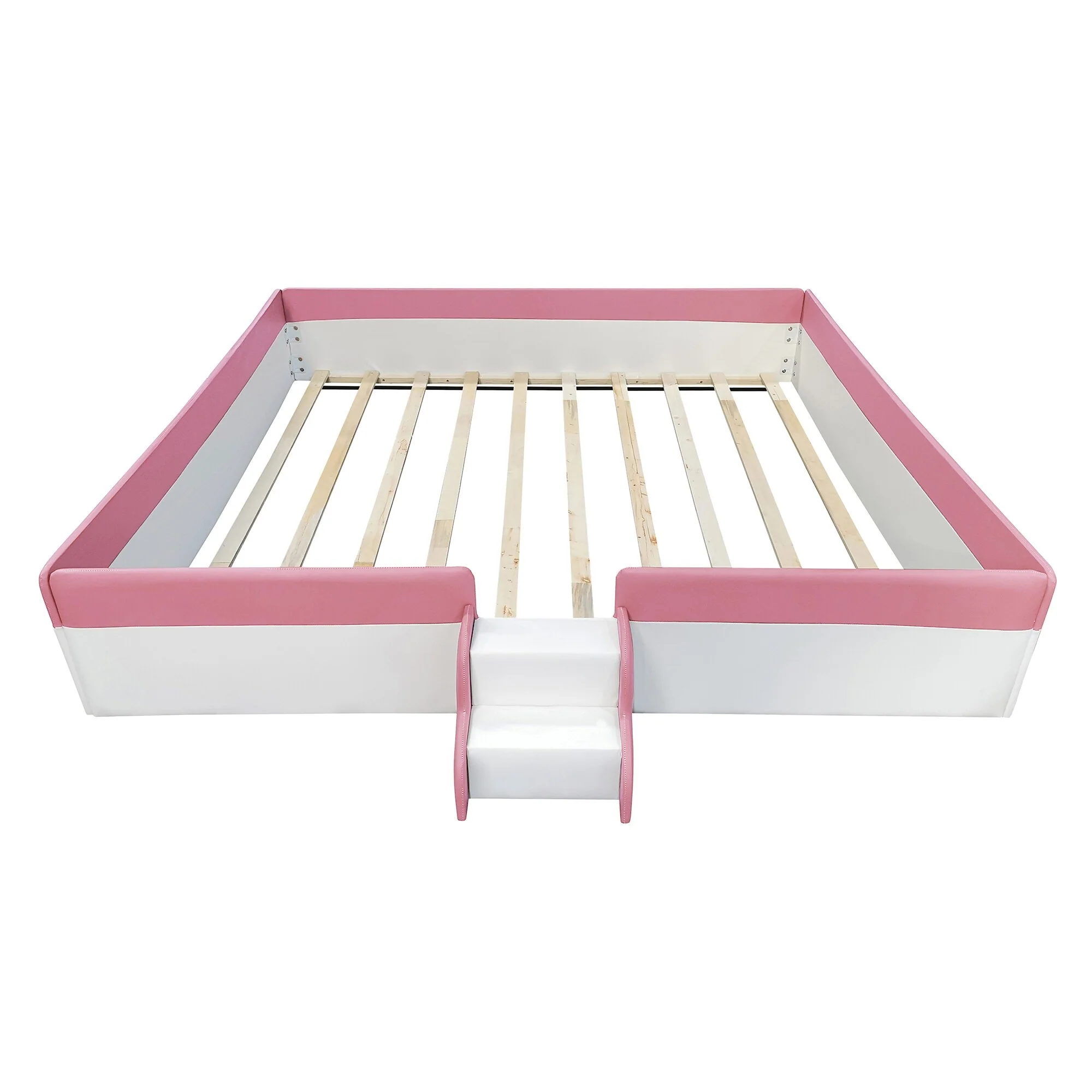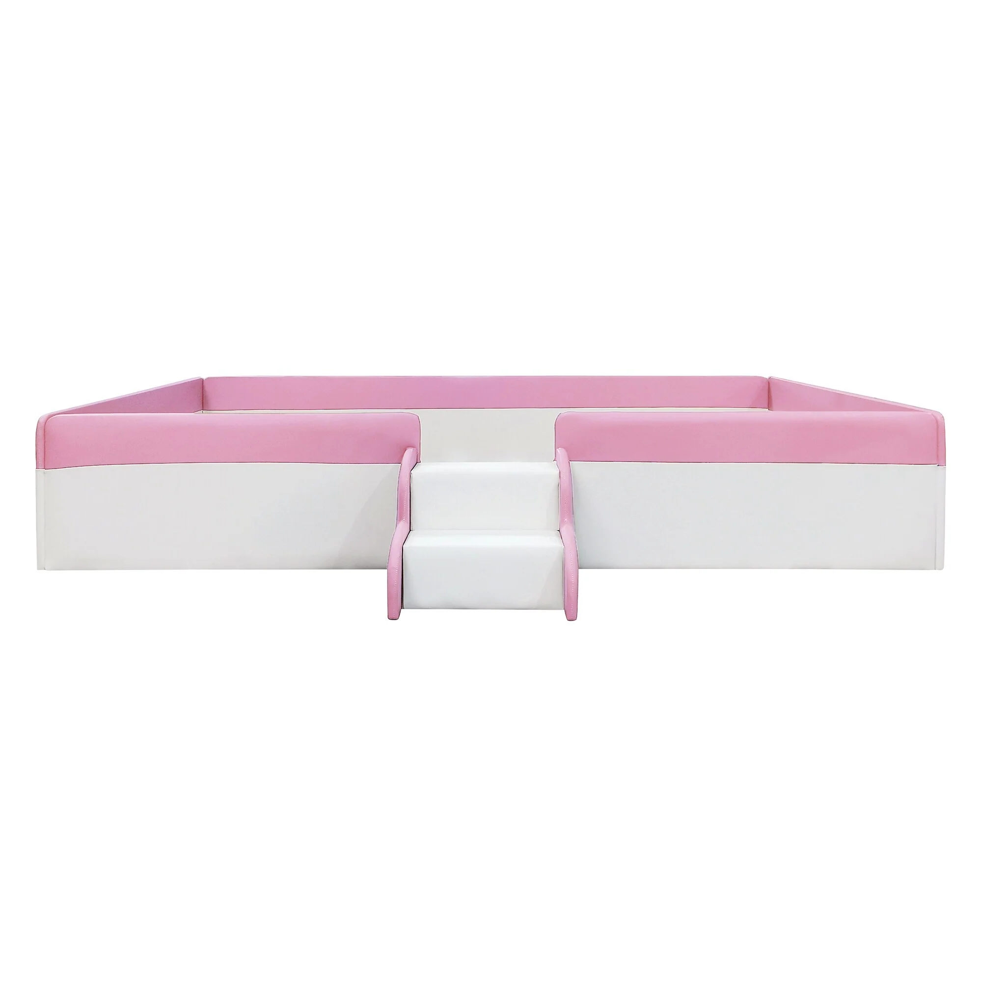 Upholstered Daybed Frame Two-color Grounded Toddler Floor Bed Low Profile Sofa Bed with Fence and Stairs Wood Slat Support Bed
