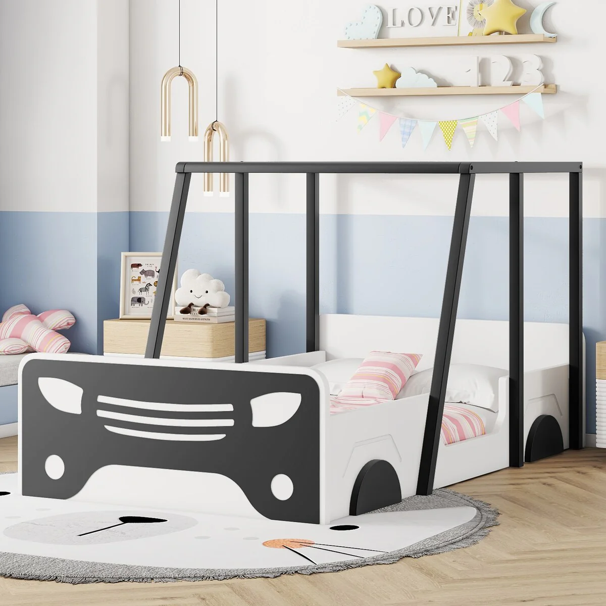 Twin Size Car-shaped Bed with Roof and wheels and door Design