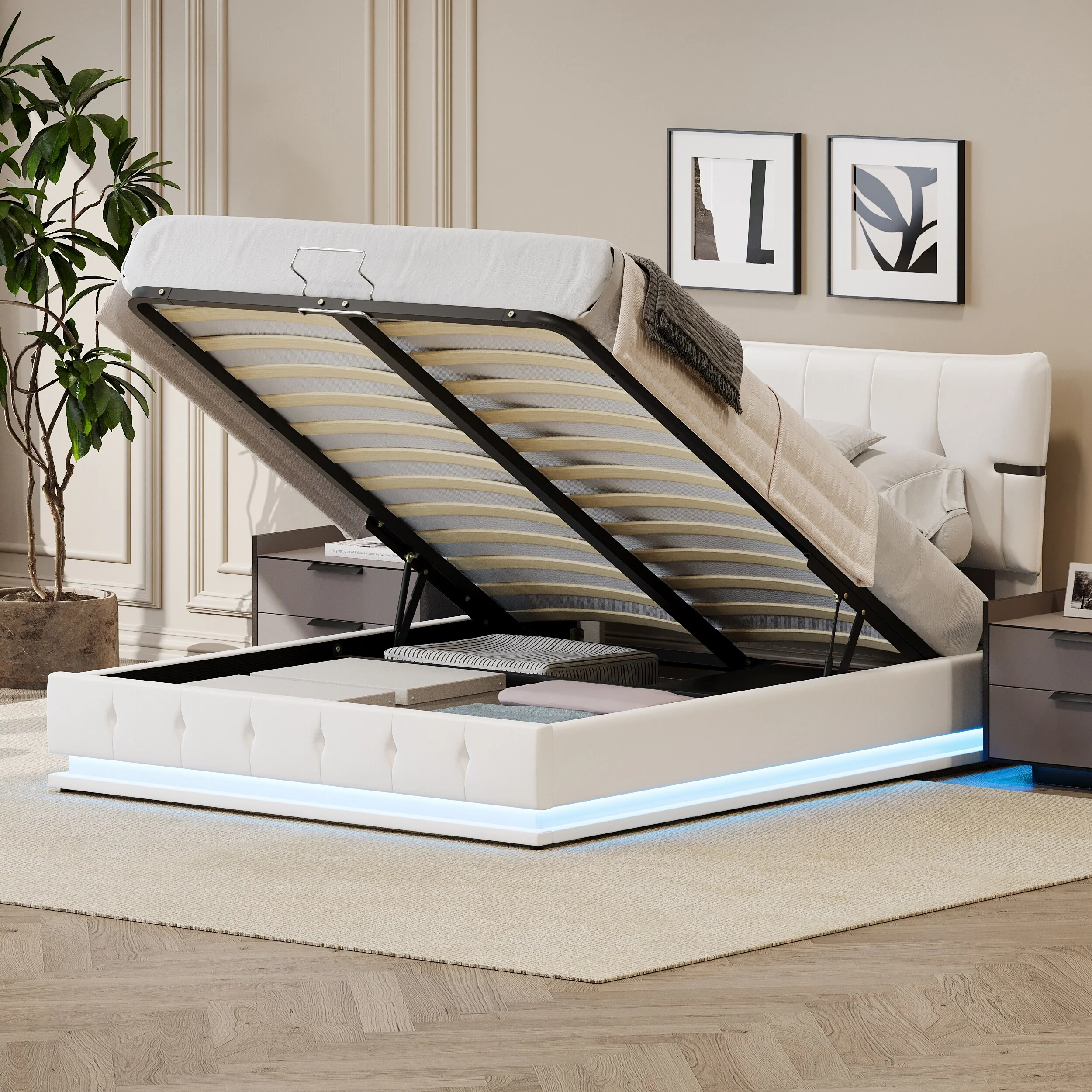 Upholstered Full Size Hydraulic Storage Bed with RGB LED Light - White PU Leather.