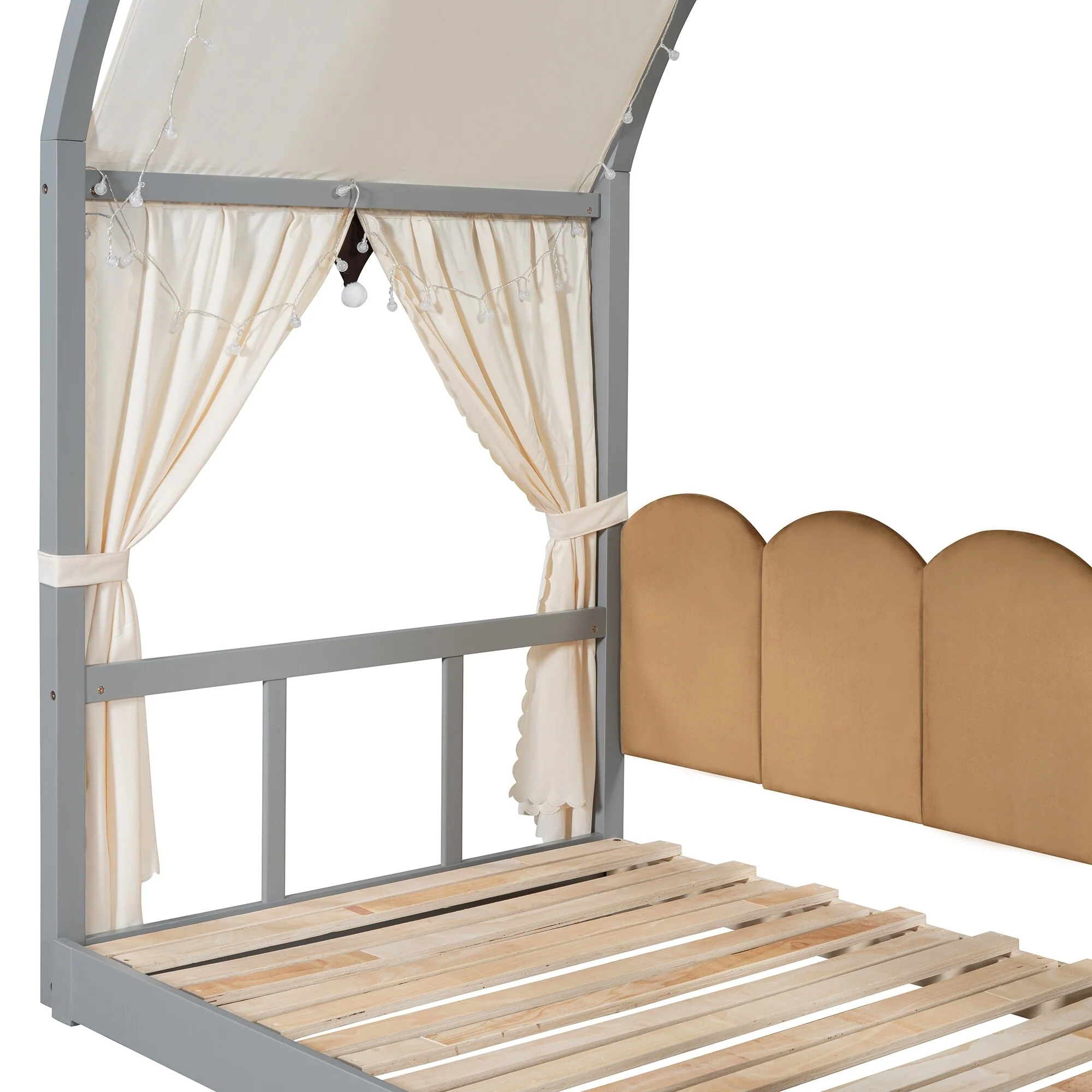 Wood Twin Size Bed Frame with Arched Roof, Floor Bed with Light and Curtain, Pull-out Kids Bed for Girls Boys Bedroom