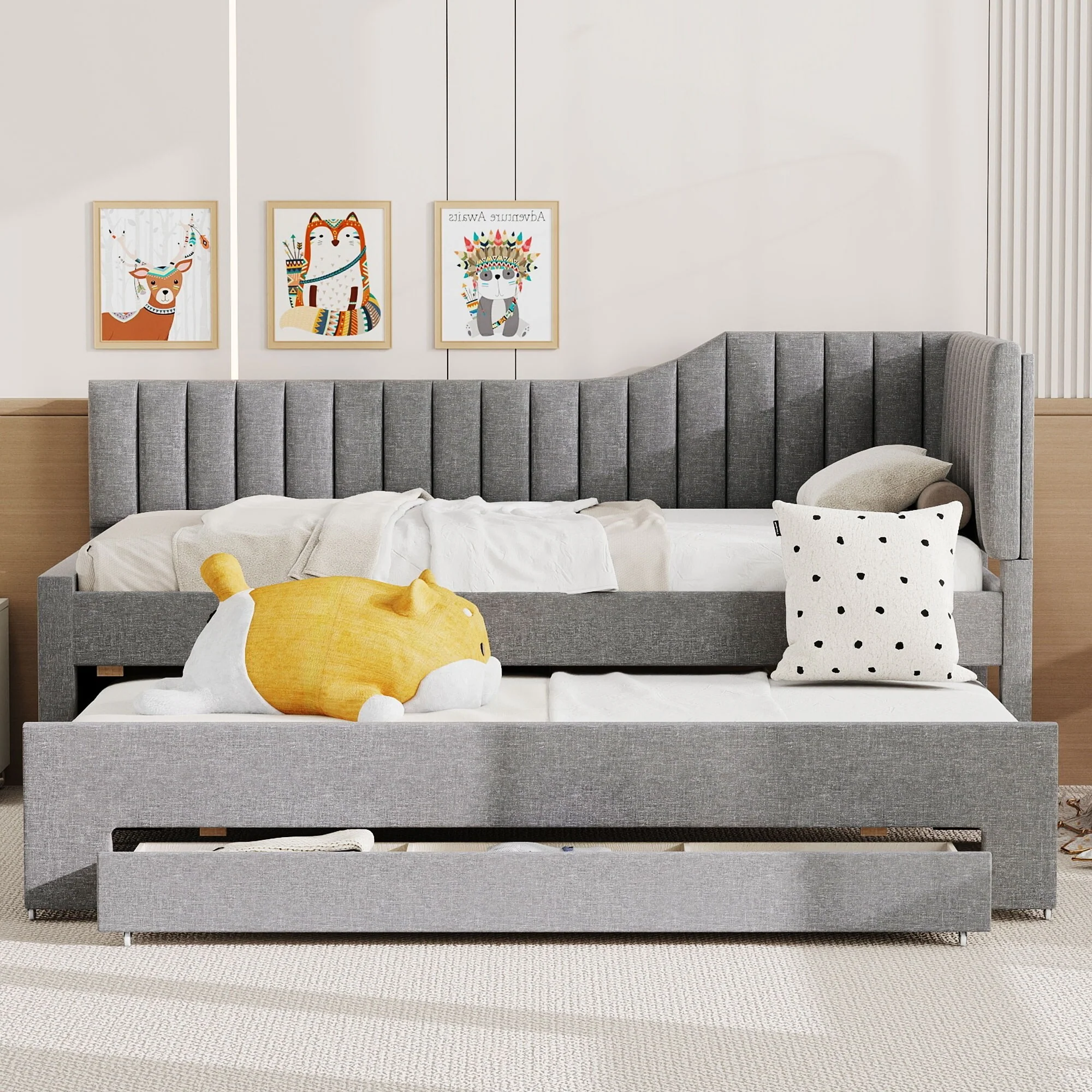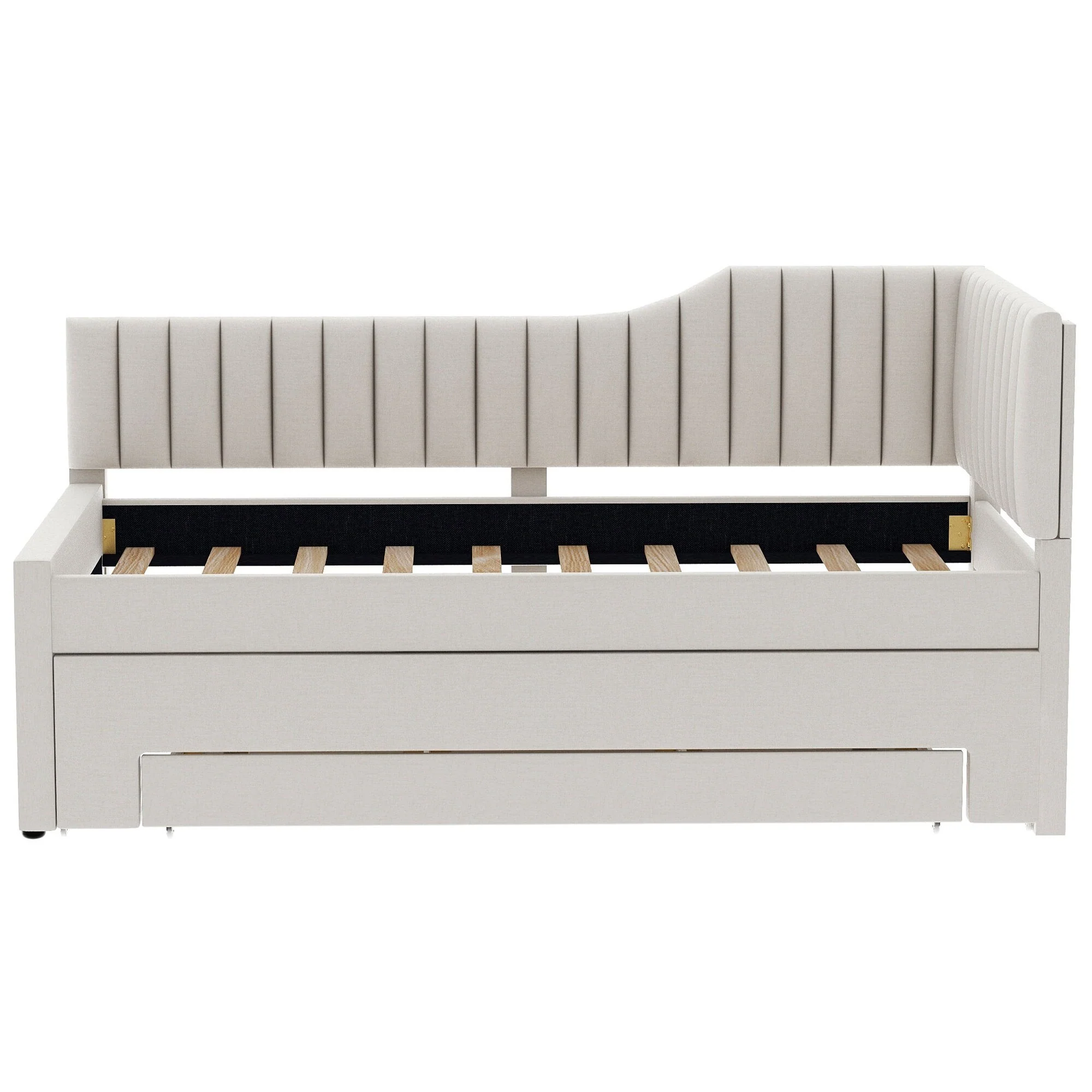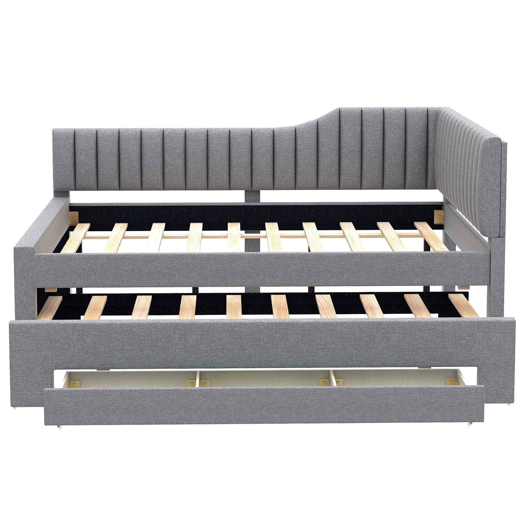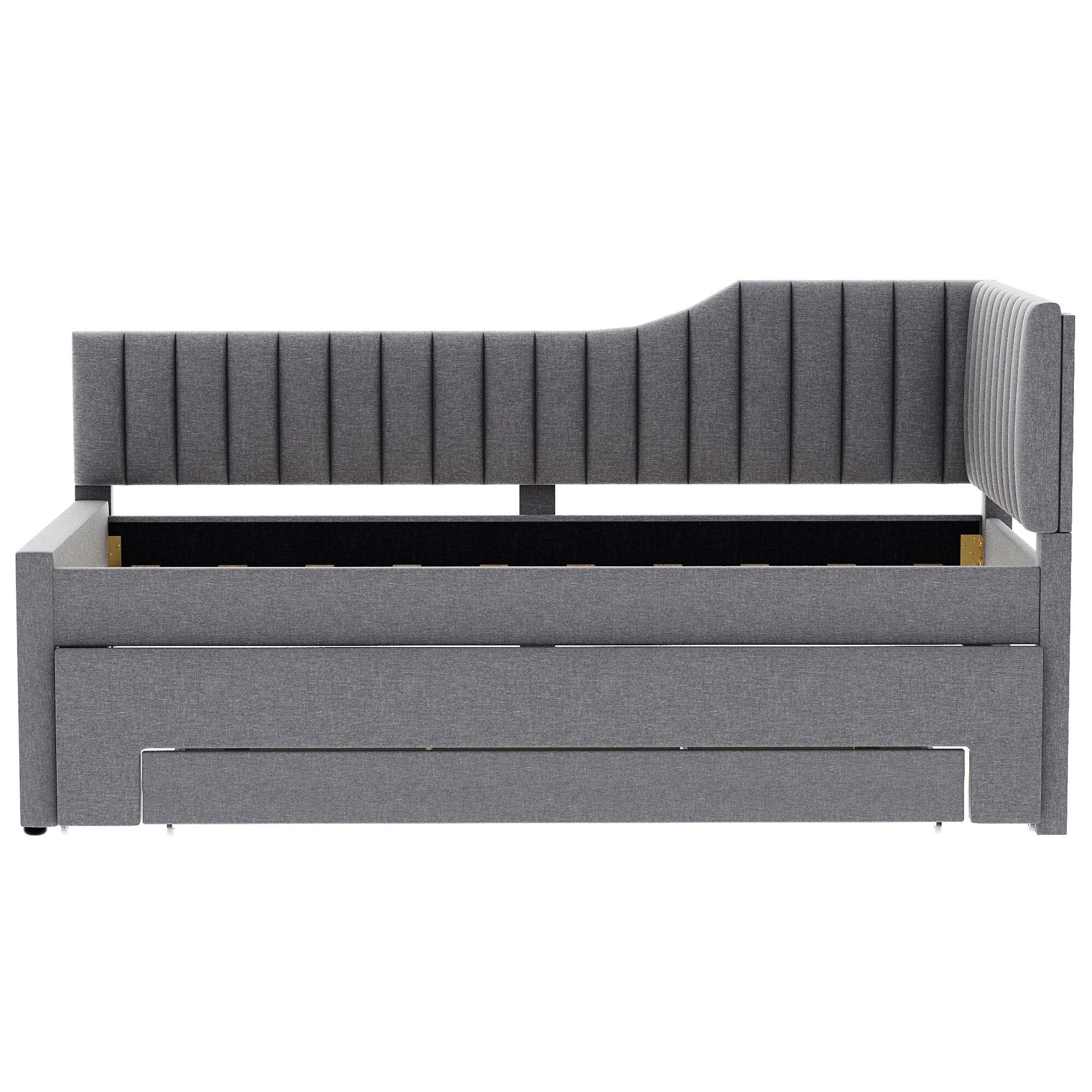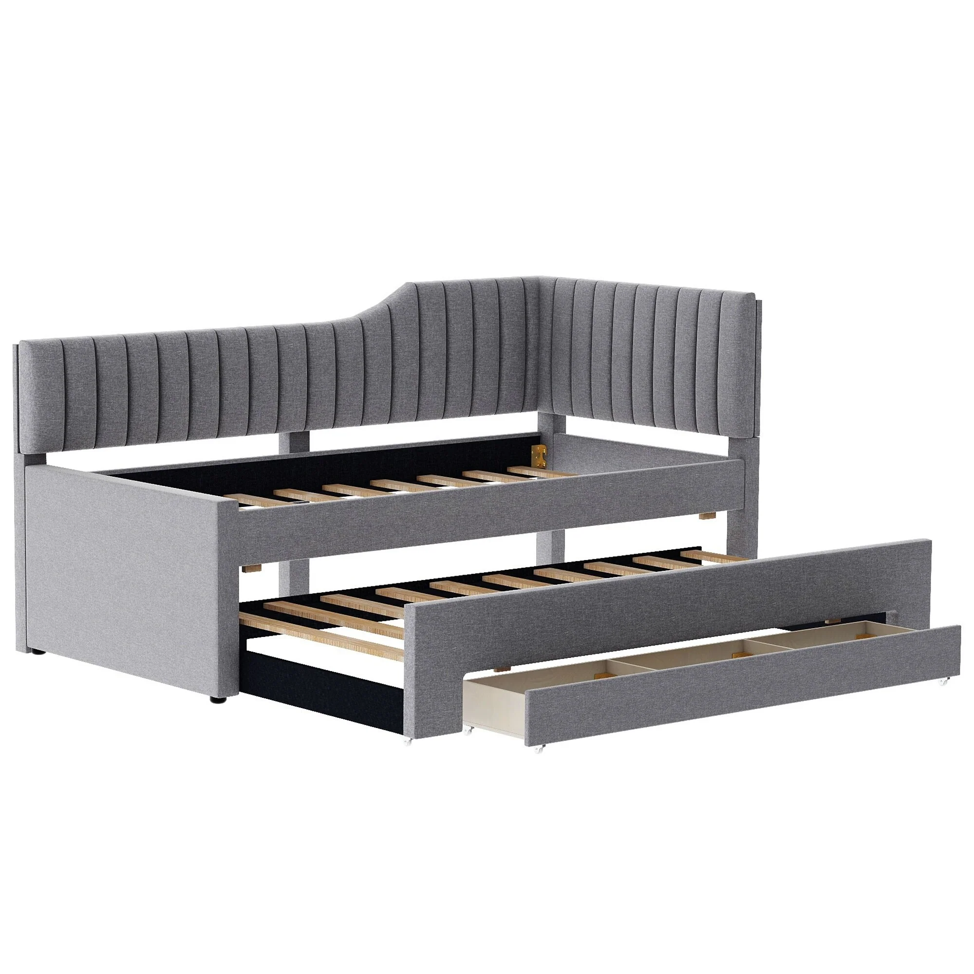 Daybed Captain Bed Upholstered Bed with Trundle and 3 Drawers, Elegance Stripe Design L-Shaped Upholstered Daybed Platform Bed
