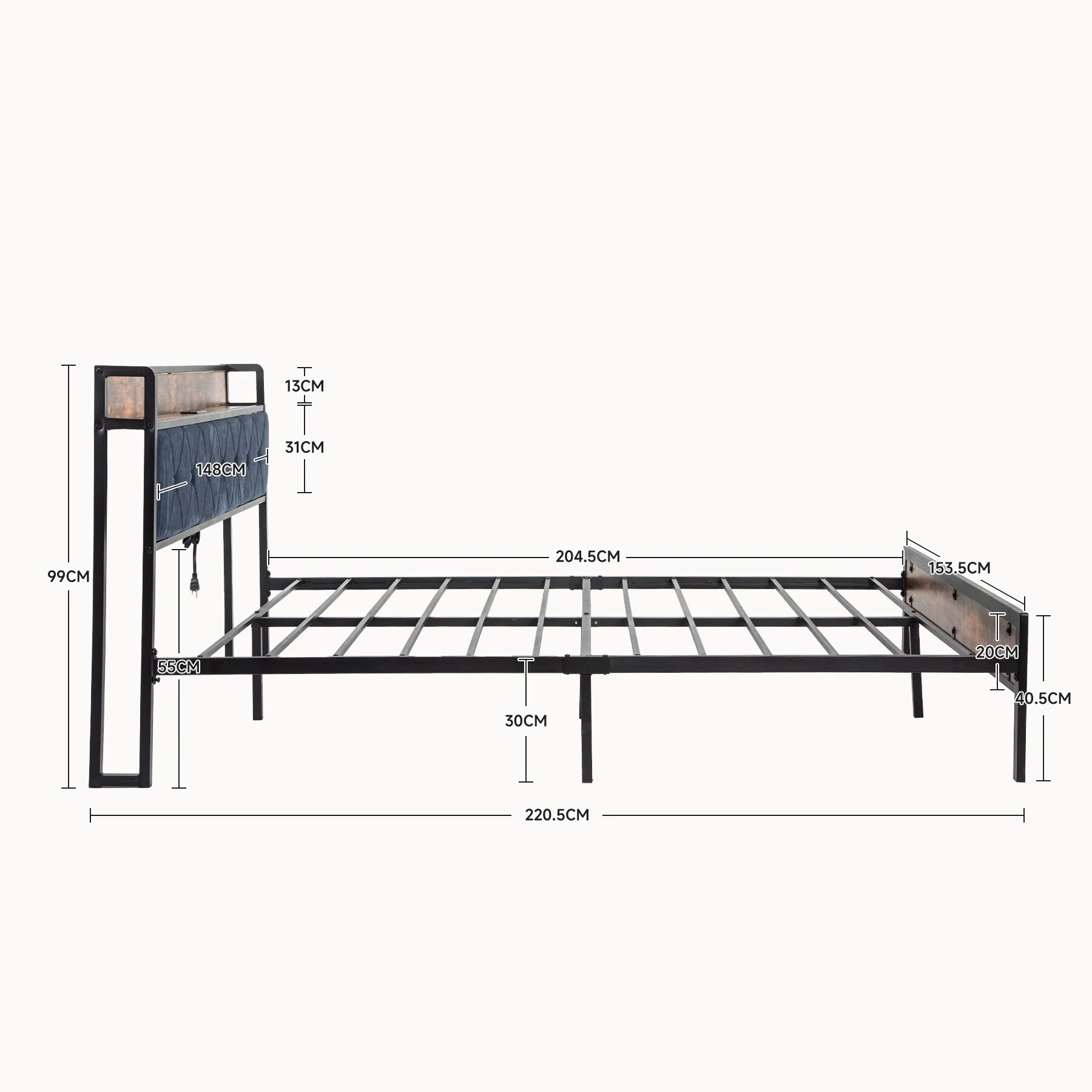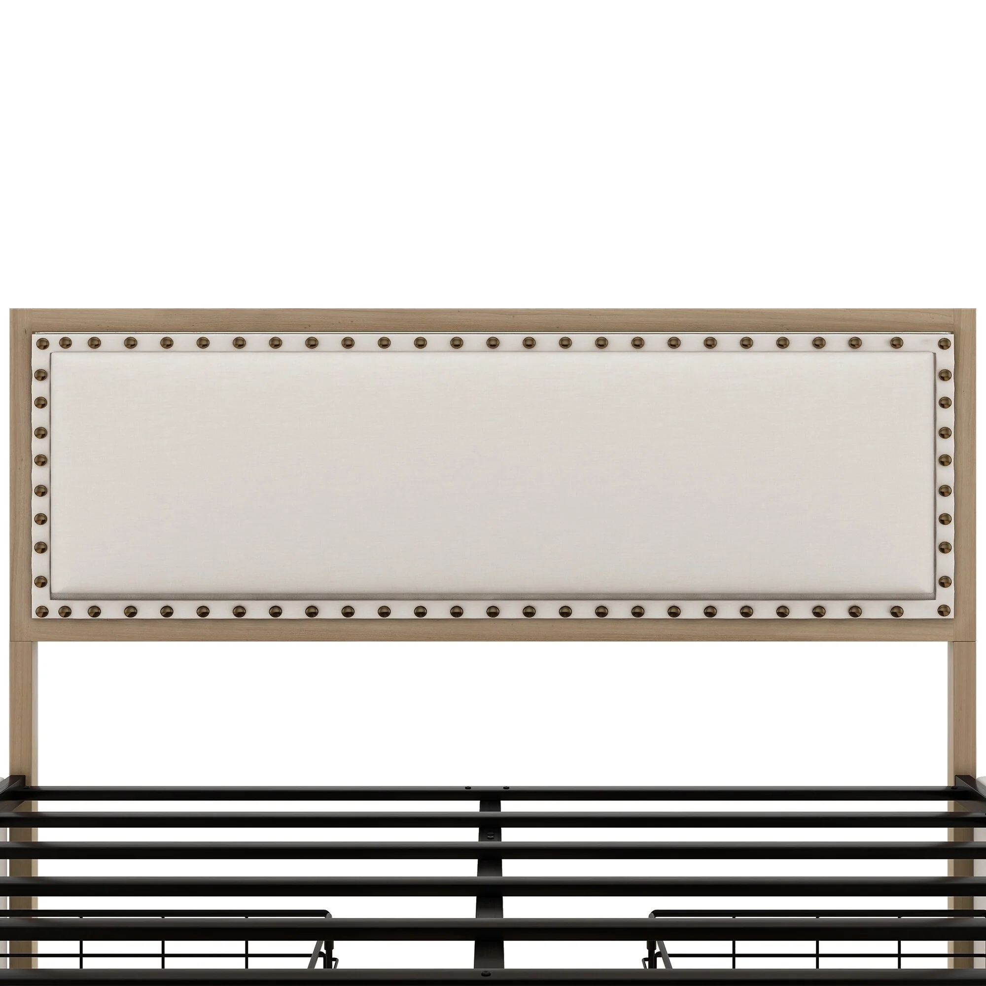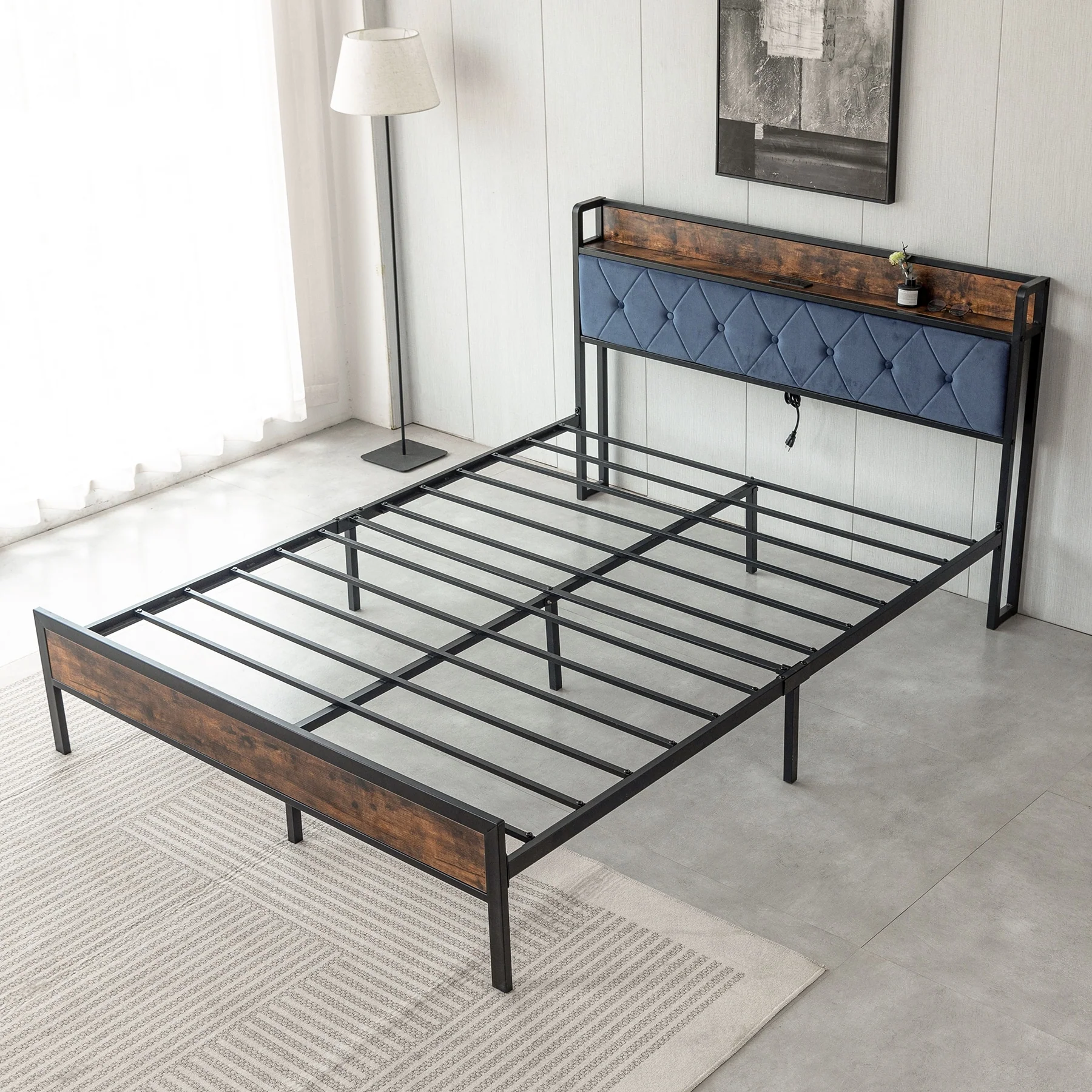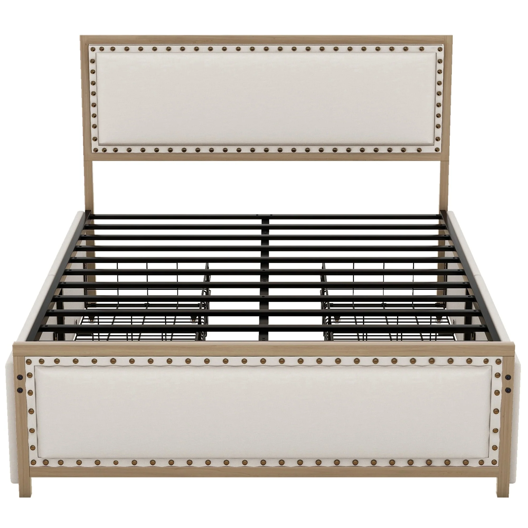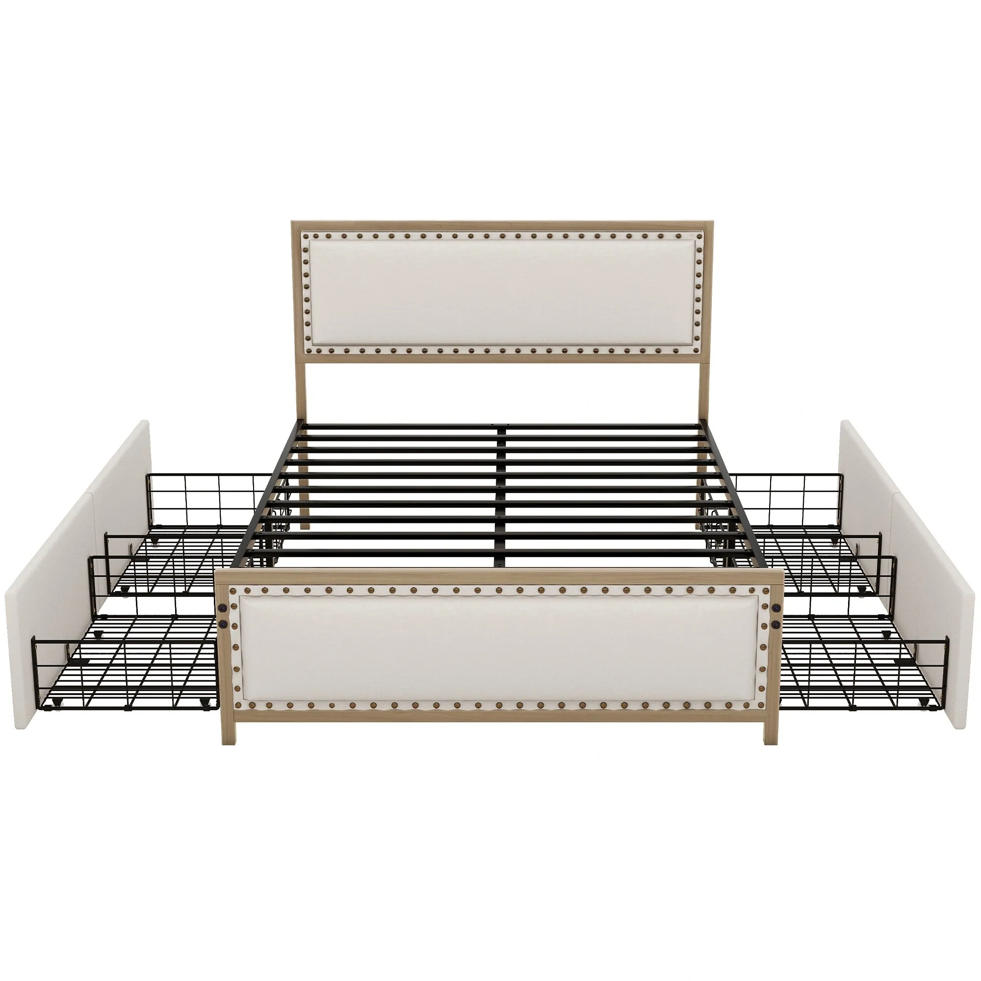 Vintage Metal Queen Bed Frame with Upholstered Headboard and Underbed Storage
