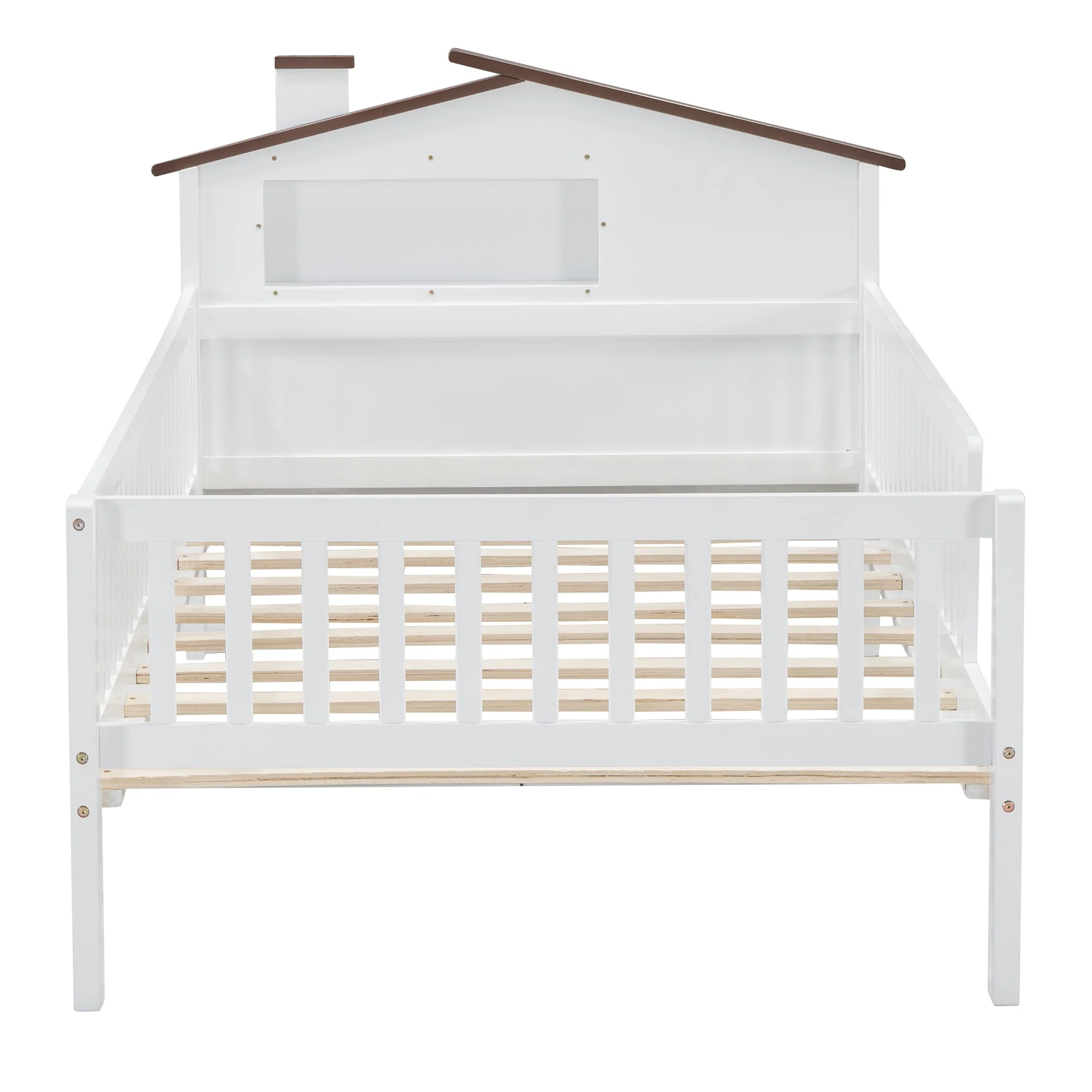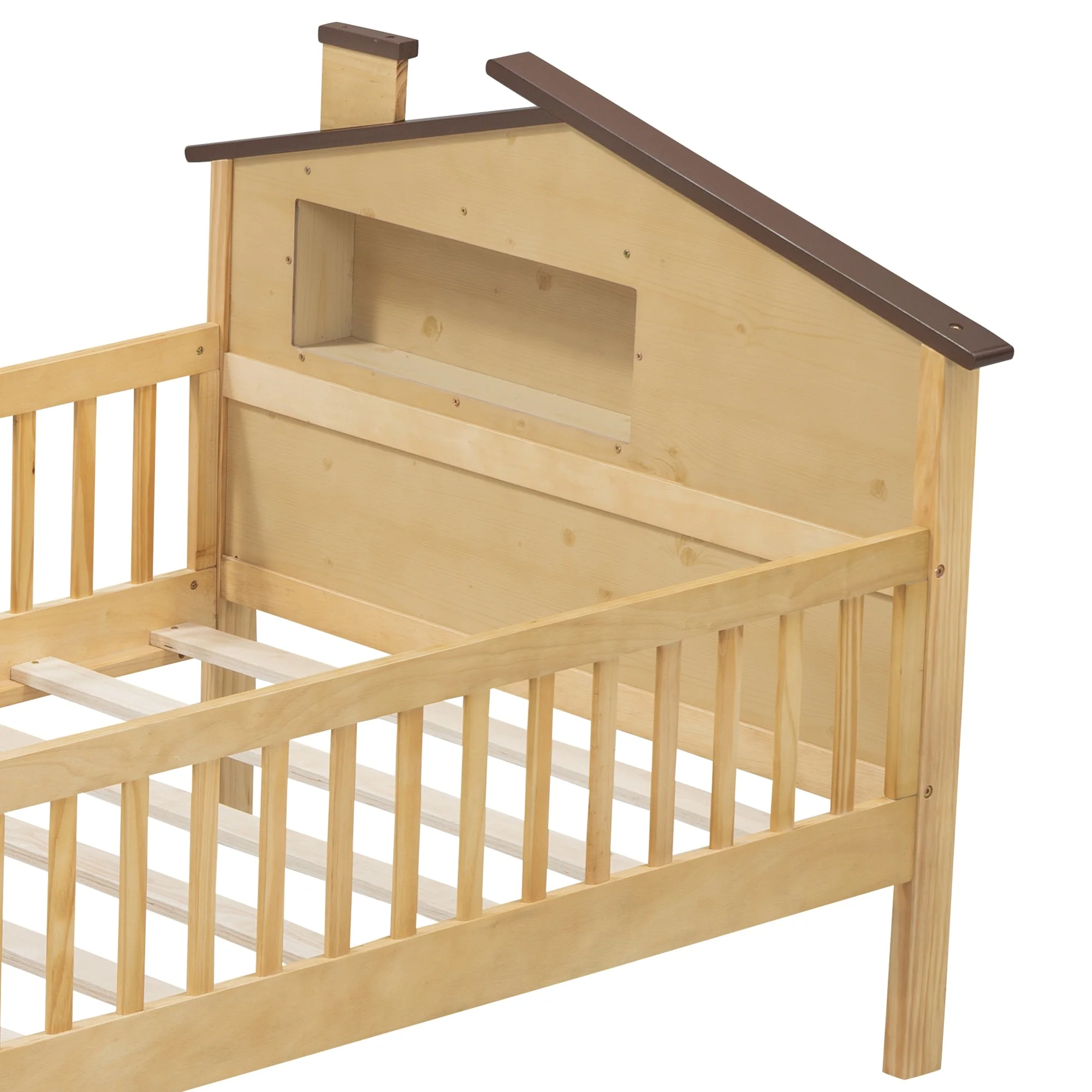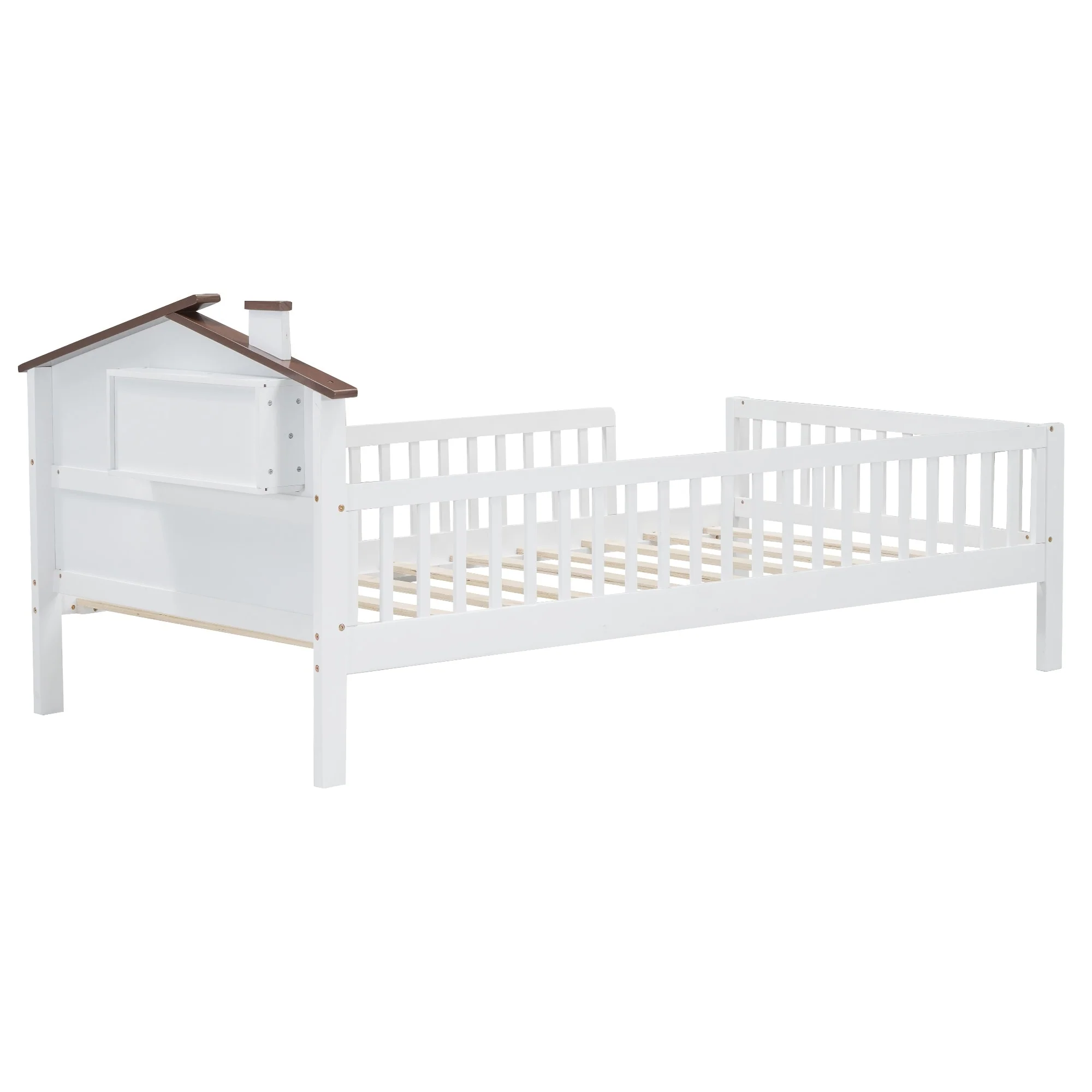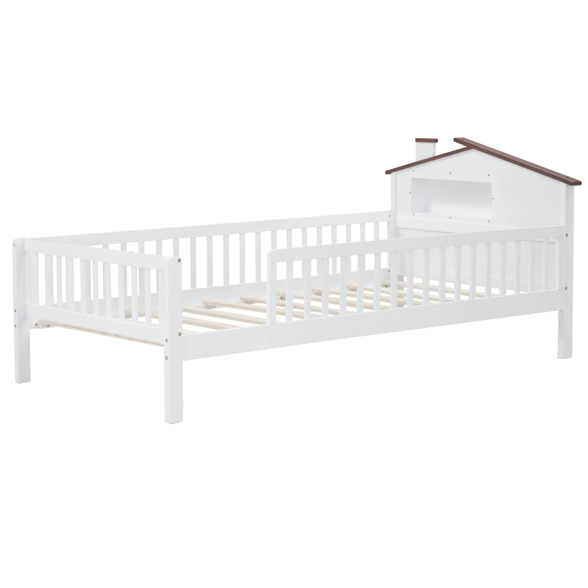 Twin Size House Bed with Roof and Storage Footboard, Playhouse Design