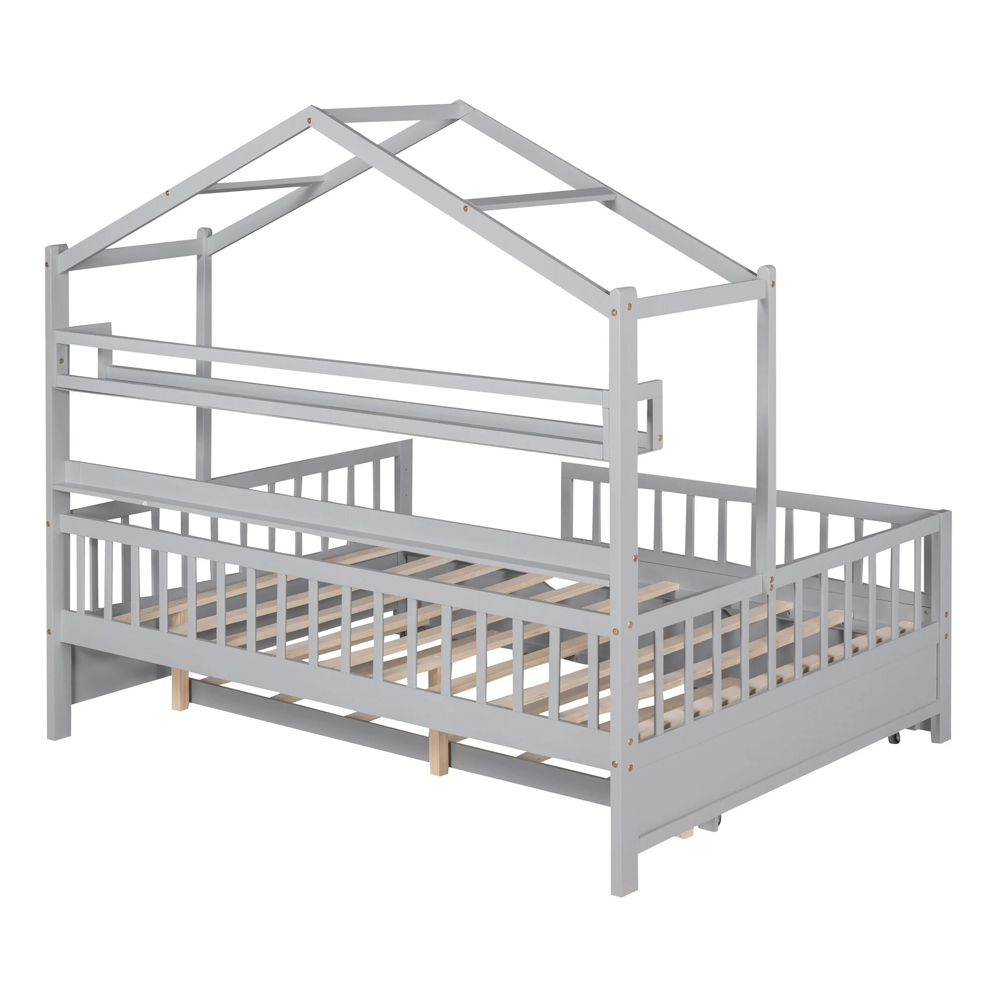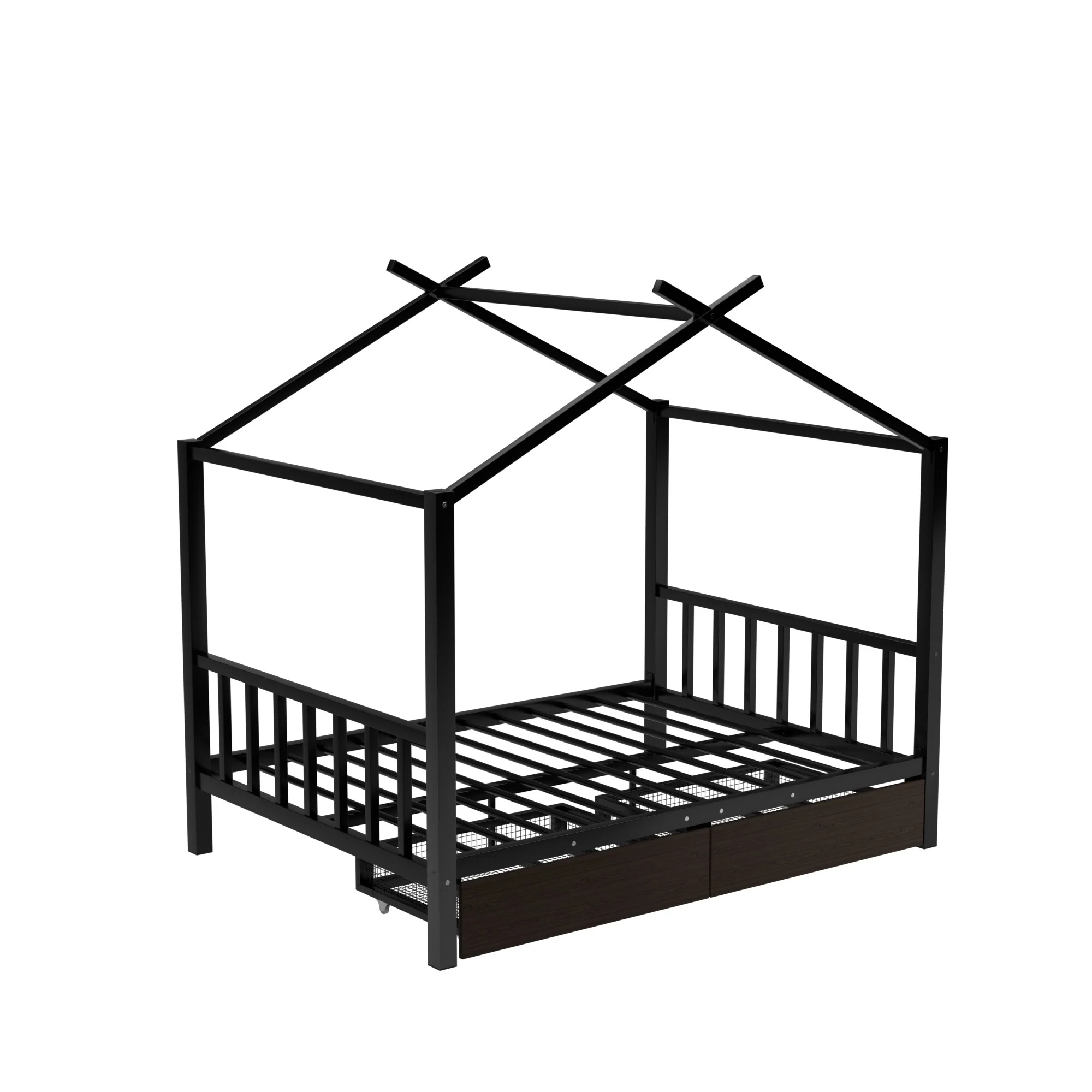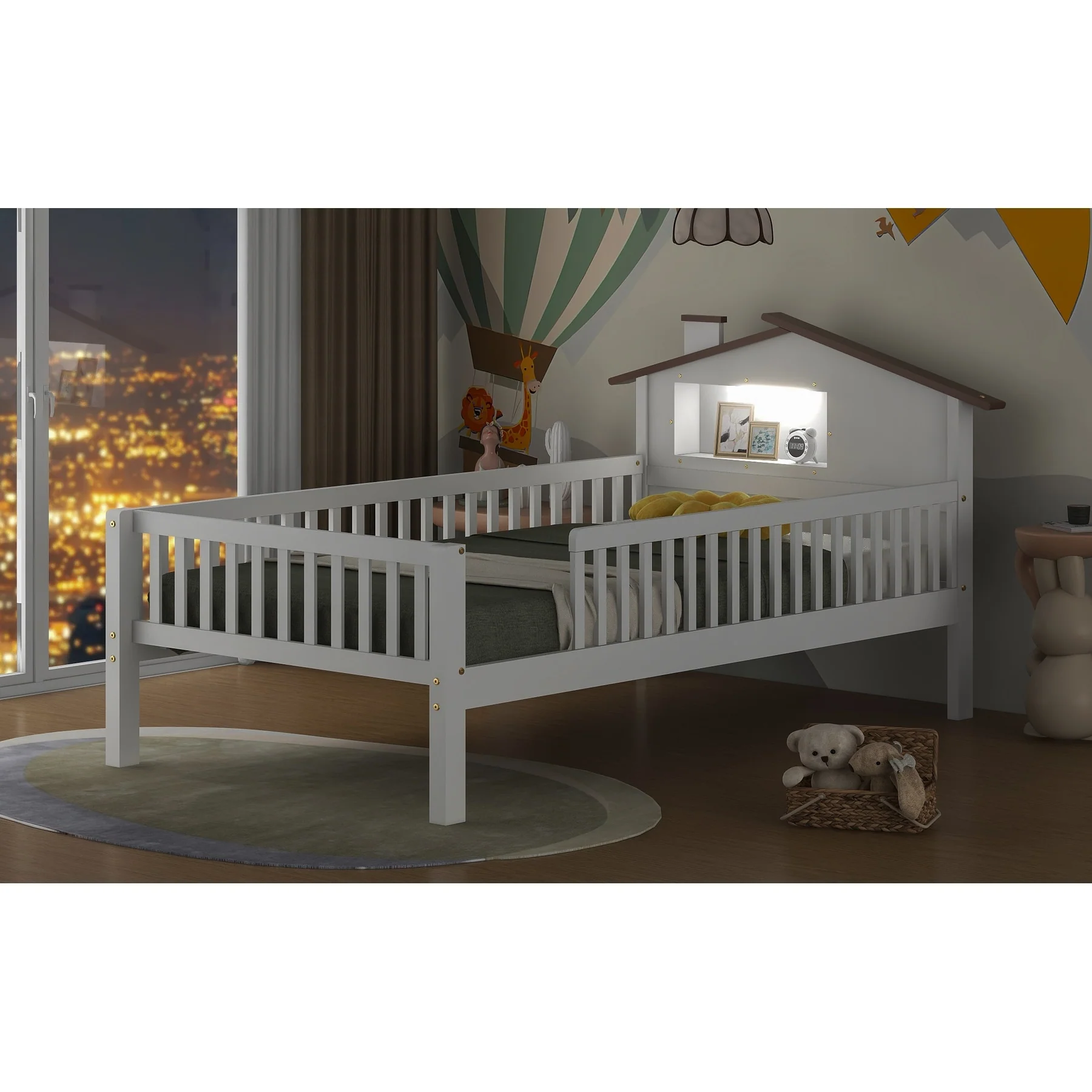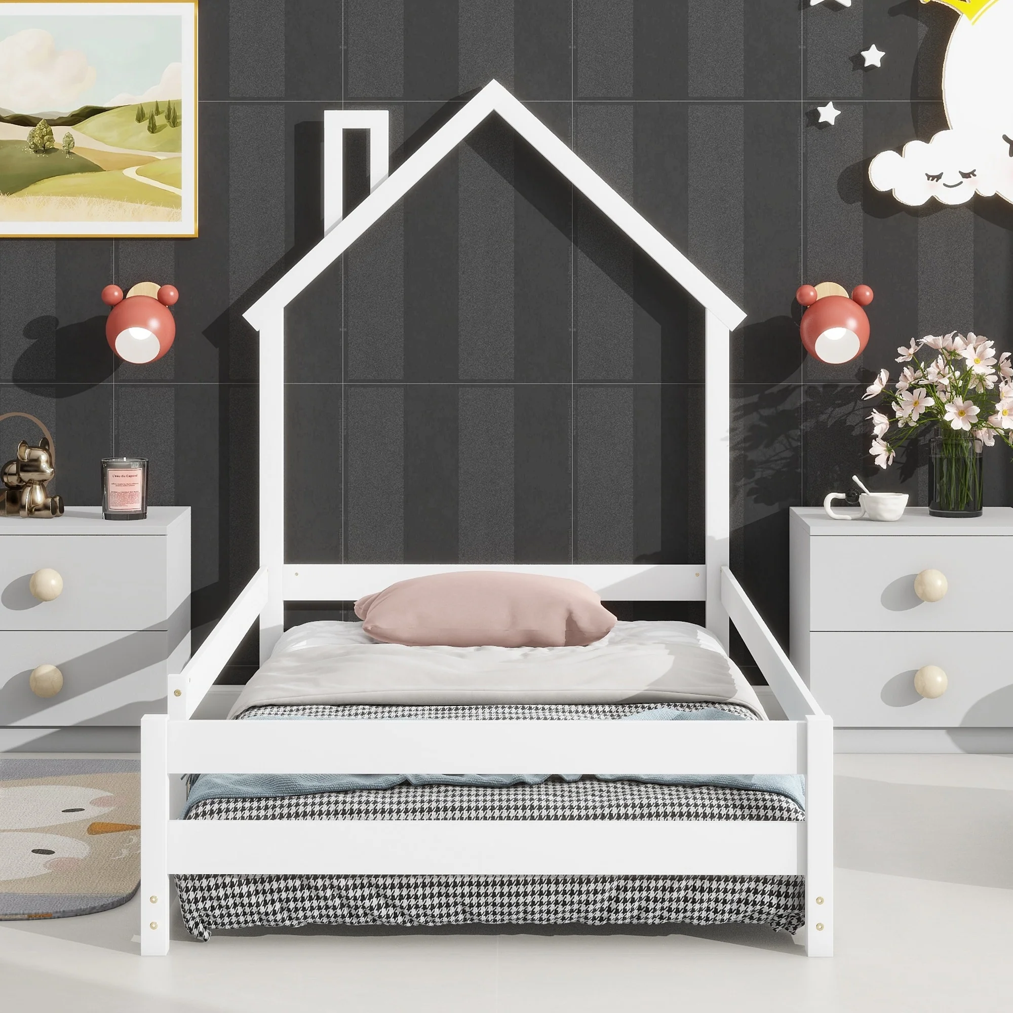 Twin Size House Bed with Roof and Storage Footboard, Playhouse Design