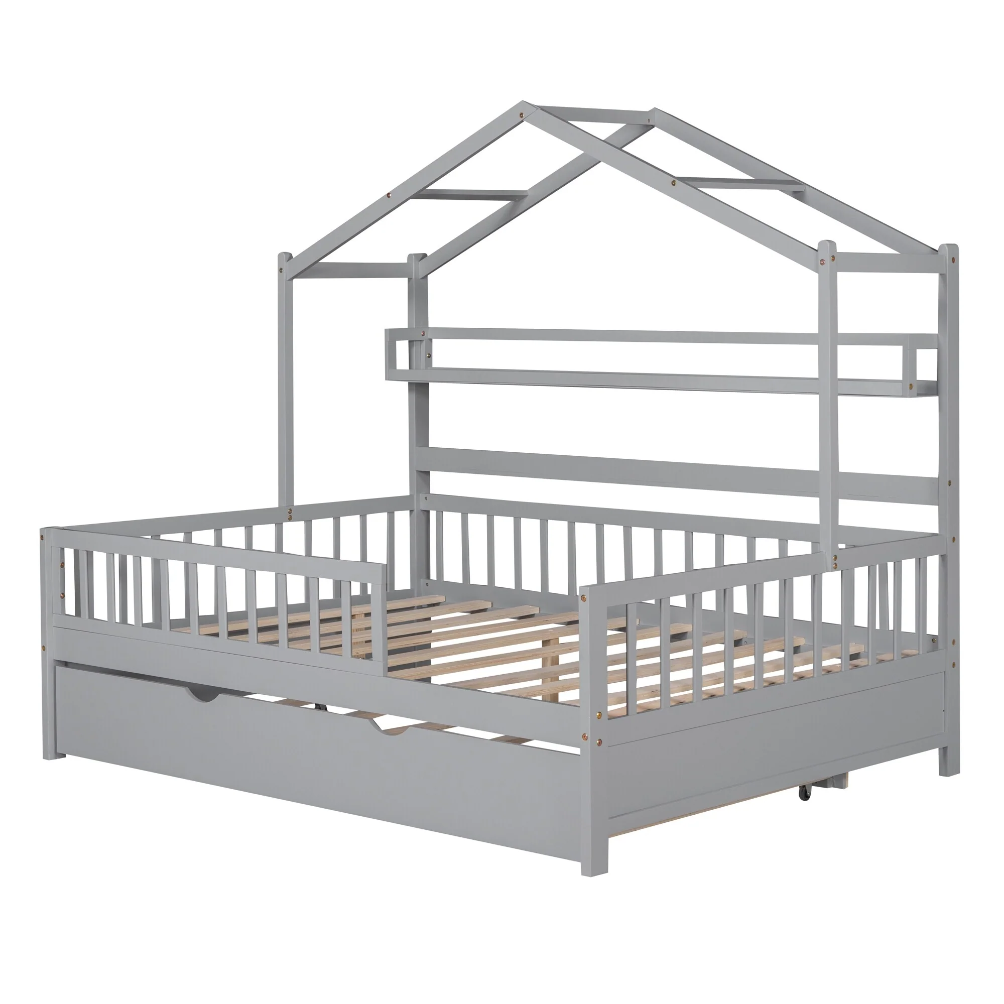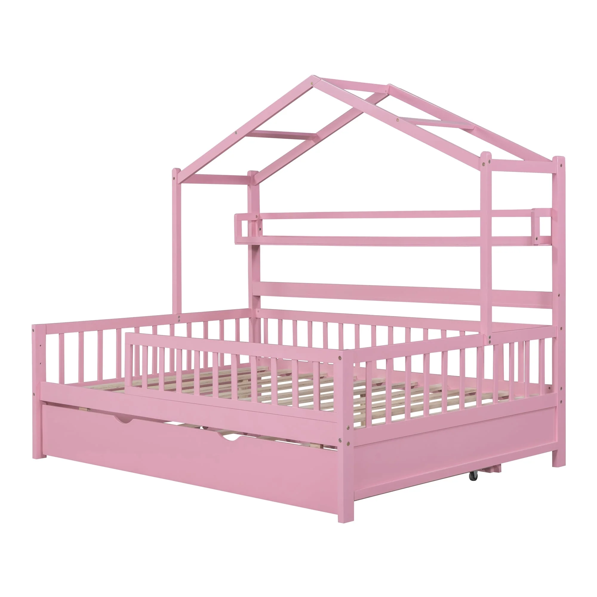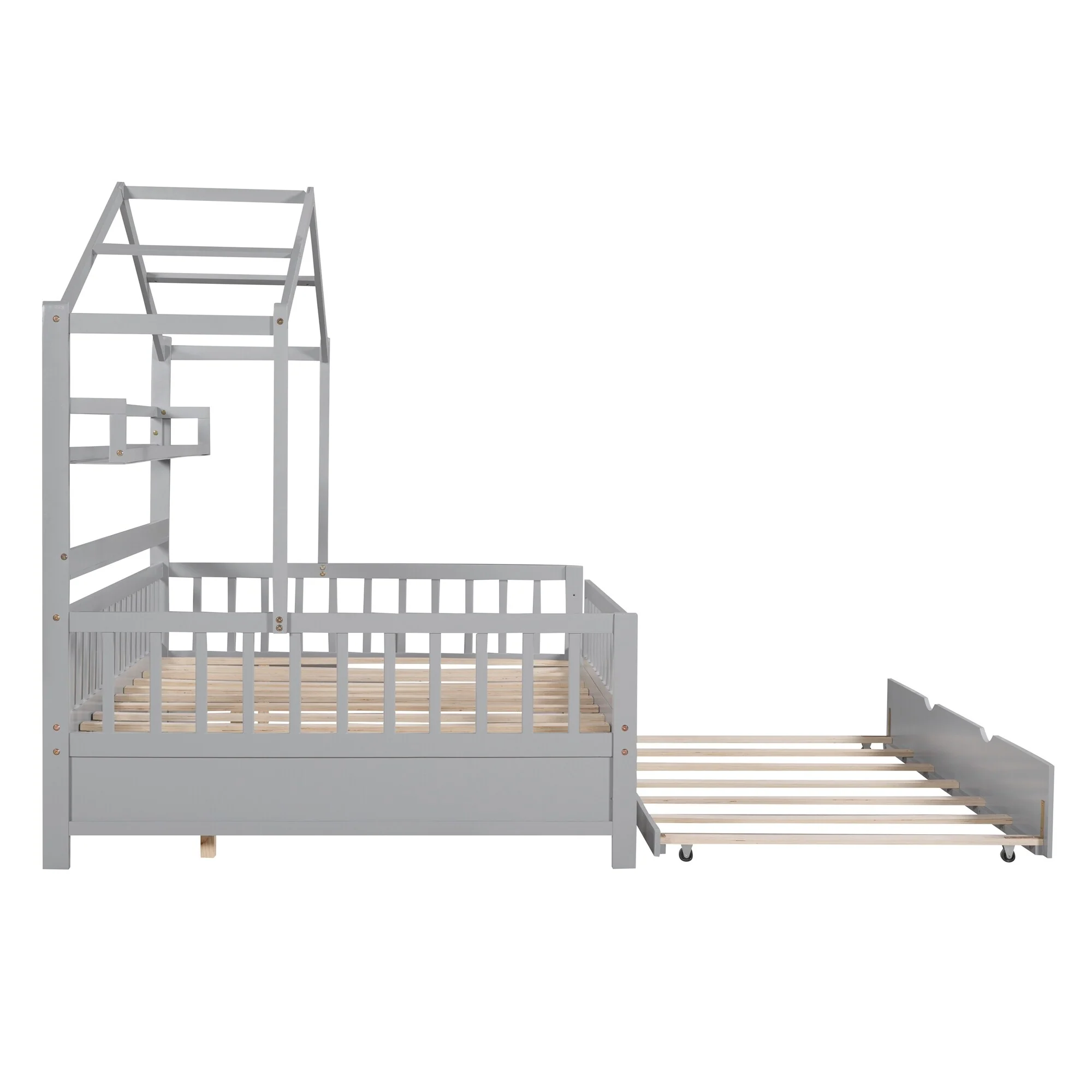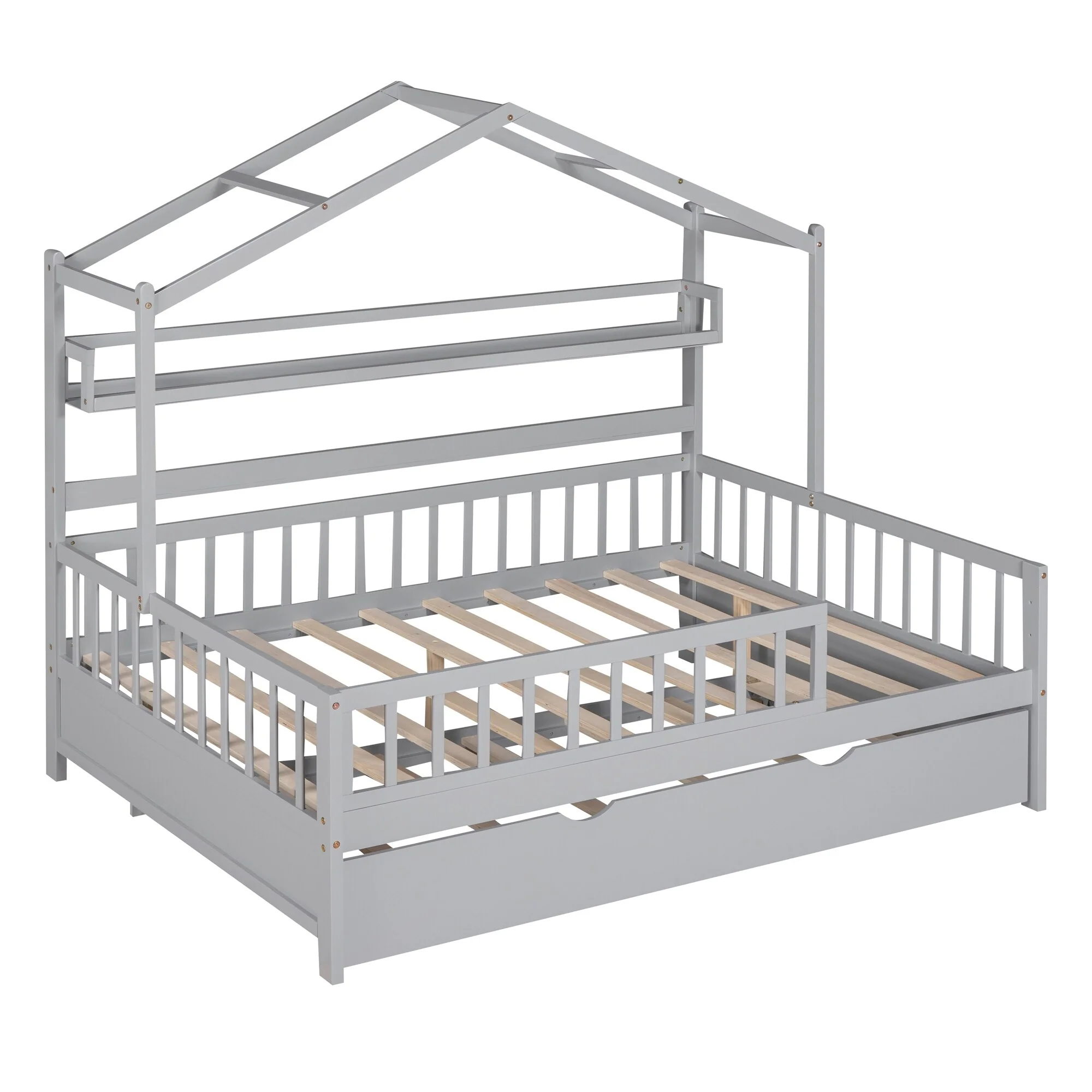 Full Size House Bed with Twin Trundle and Shelves, Kids Bed with Roof