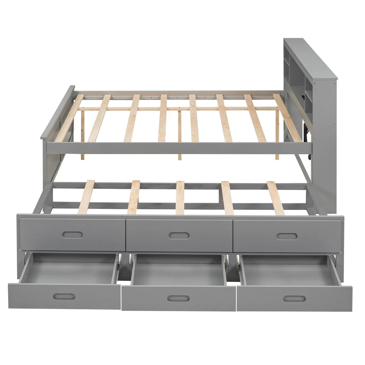 Full Bed Frame with Bookcase Headboard and Charging Station, Wood Captain Bed with Trundle and Storage Drawers