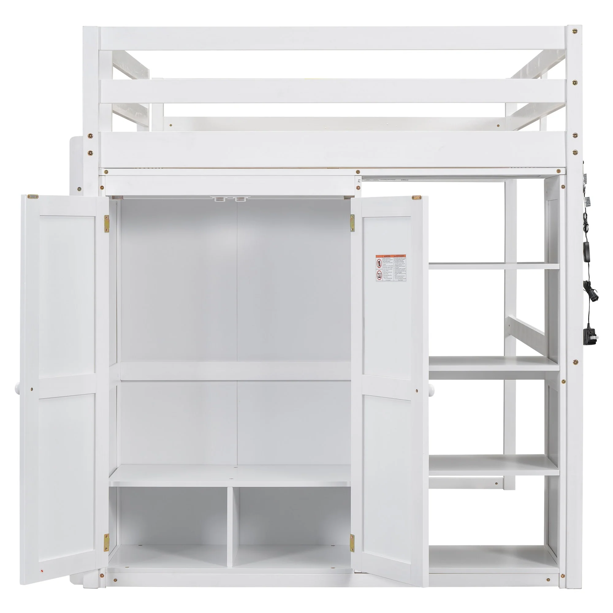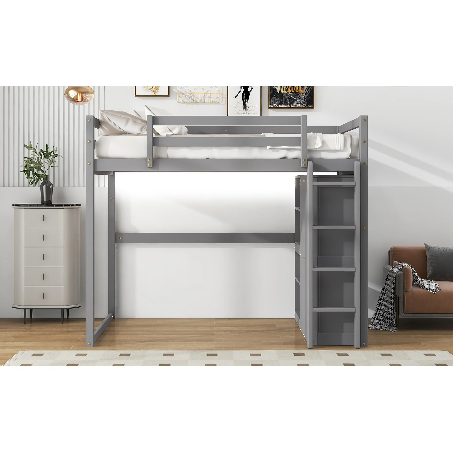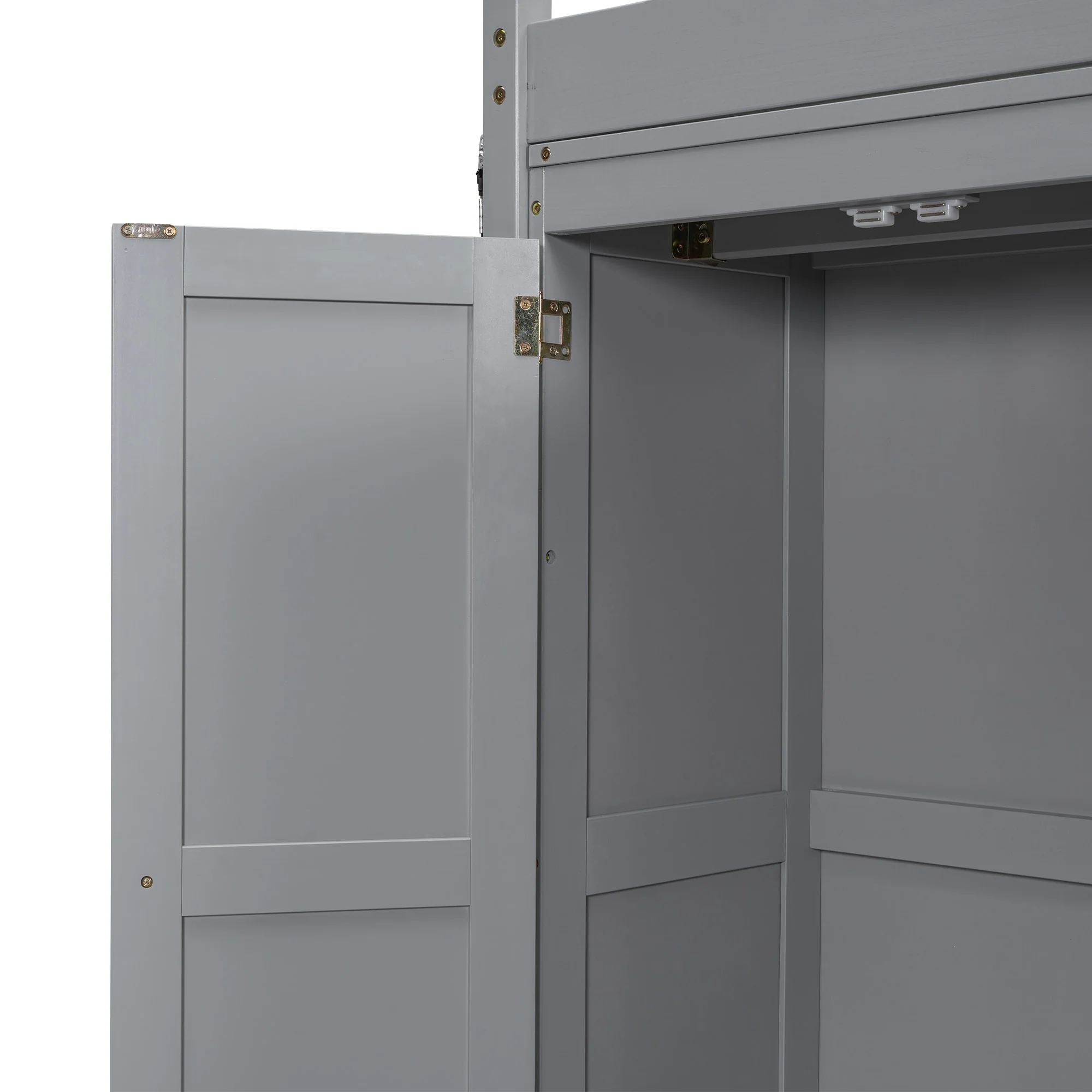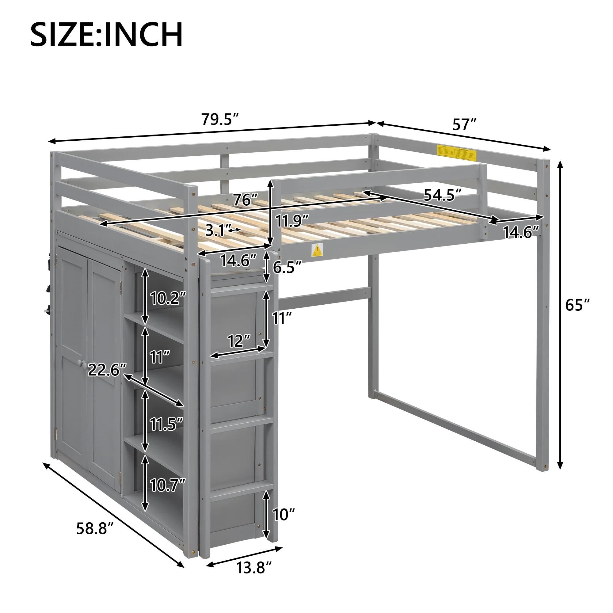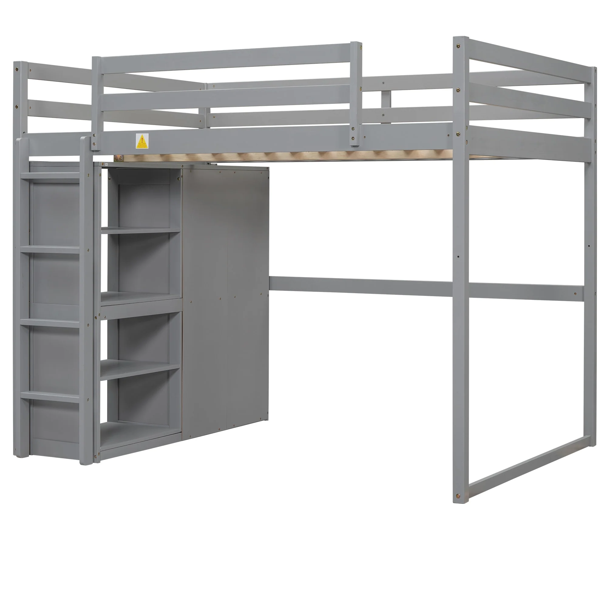 Full Size Loft Bed with Wardrobe, Storage Shelves, and LED Light - Modern Gray Design
