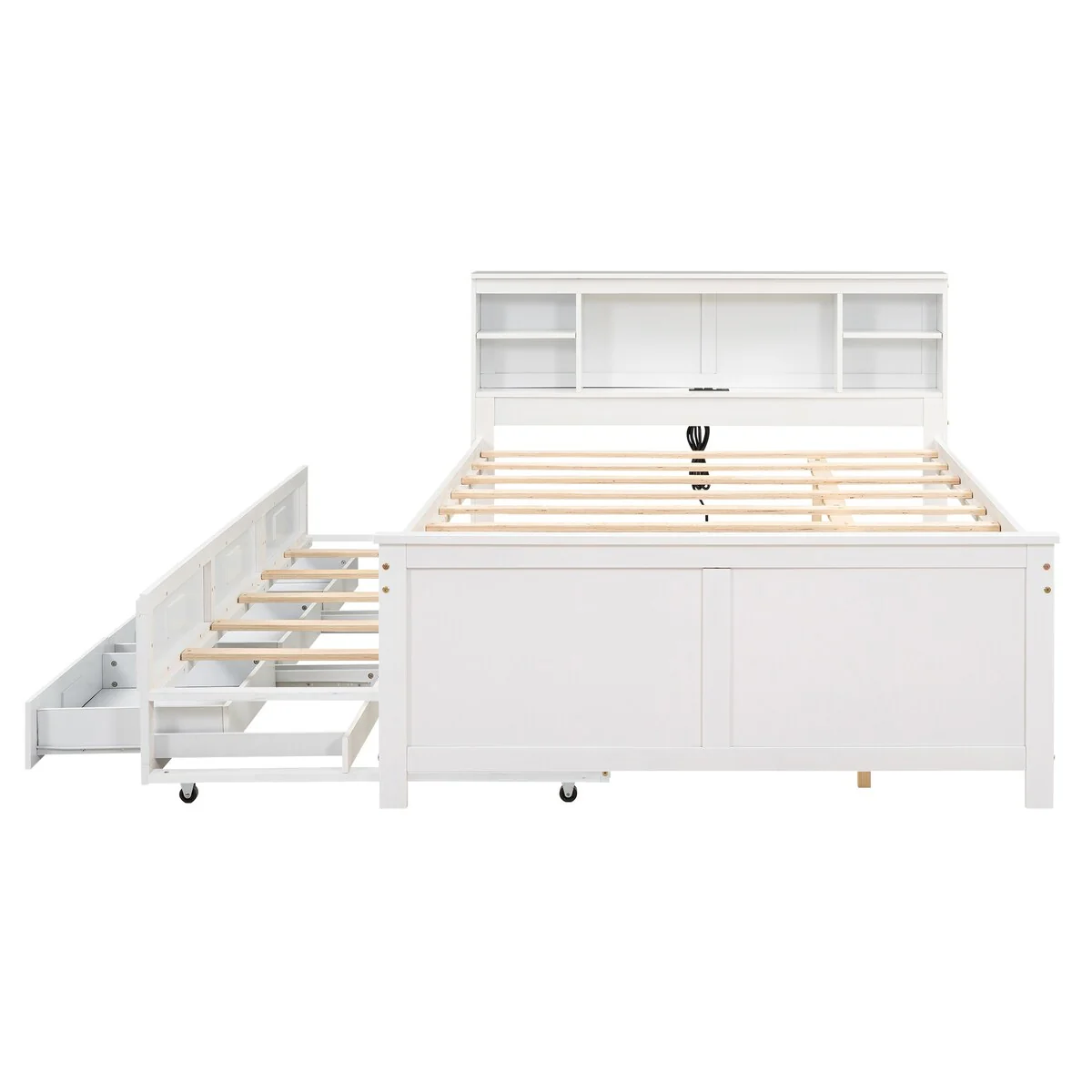 Full Platform Bed with Twin Size Trundle,Bookcase Headboard,Charging Station and 3 Drawers,Wood Full Storage Bed Frame for Kids