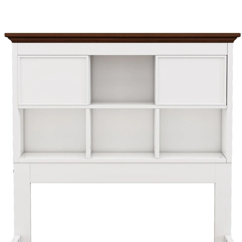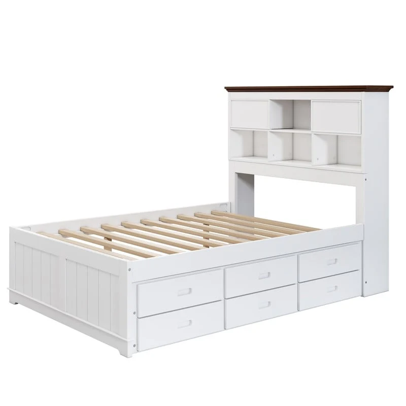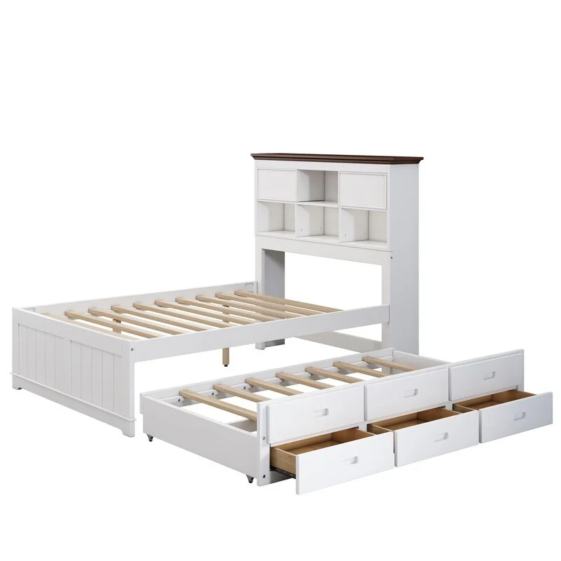 Twin/Full Bed with Trundle and 3 Under Bed Drawers, Wood Platform Bed Frame with Bookcase Headboard for Kids Teens Adults