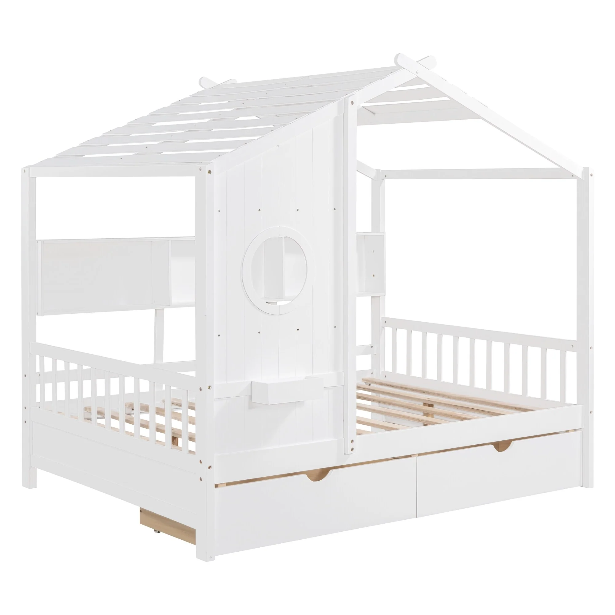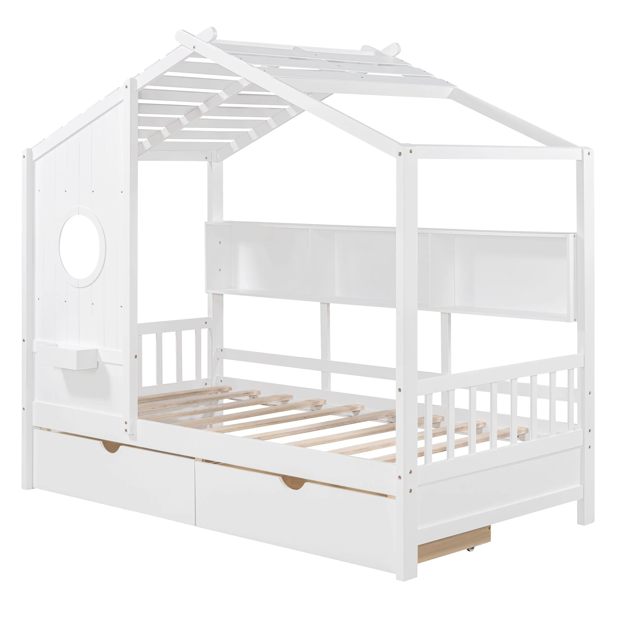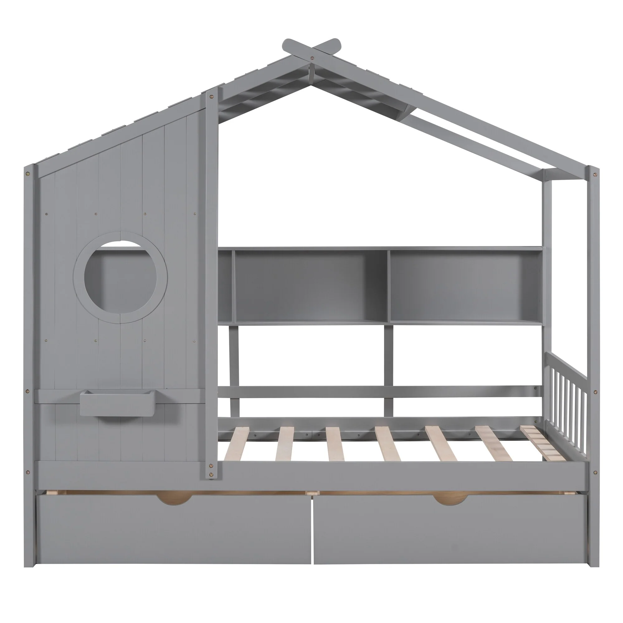 Wooden Kids House Bed with 2 Drawers and Storage Shelf