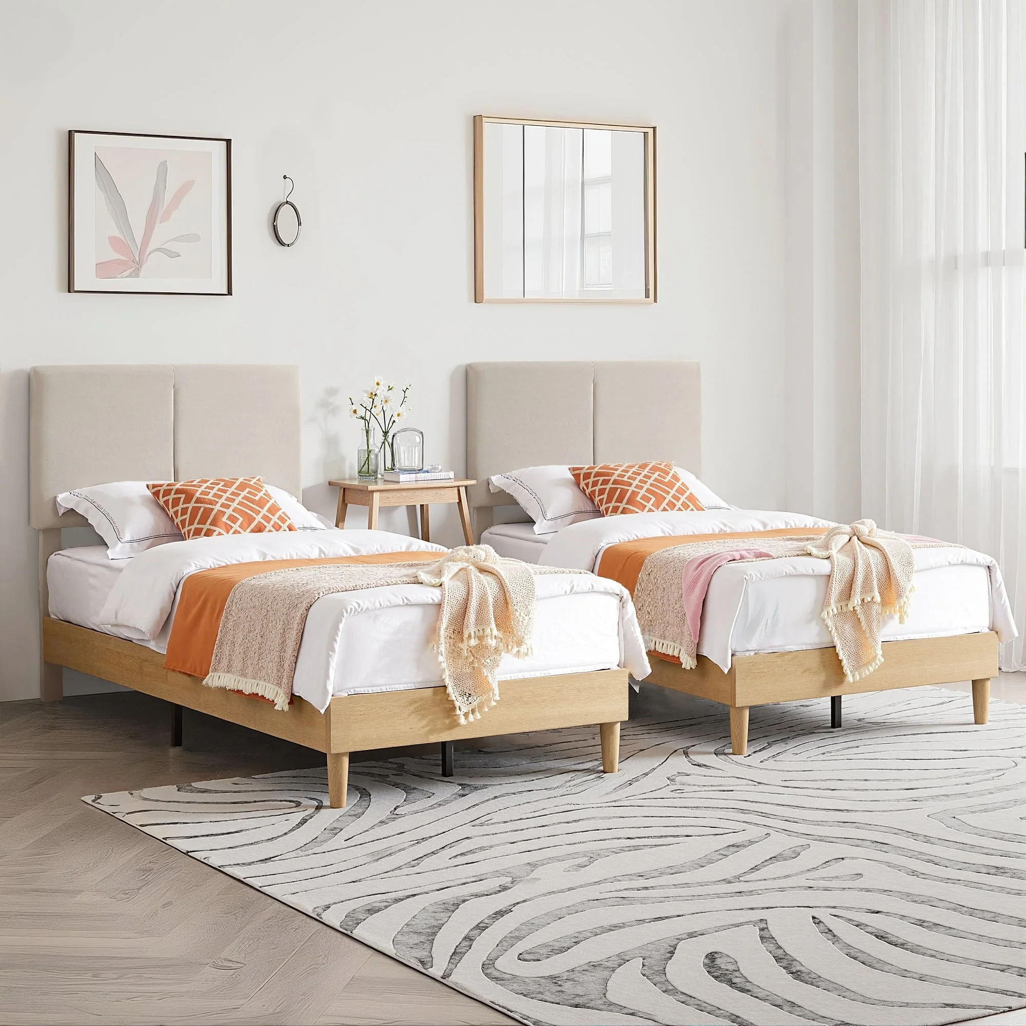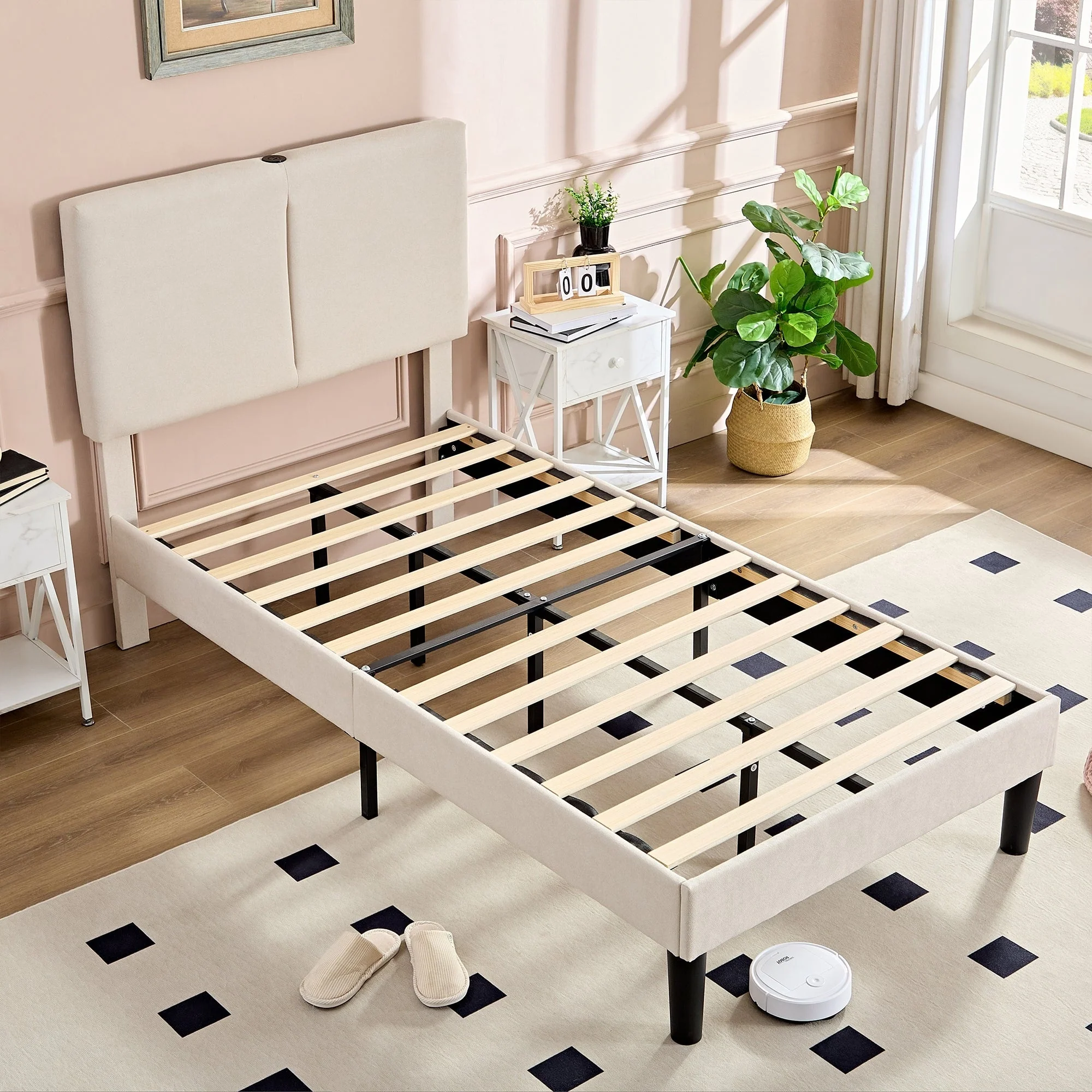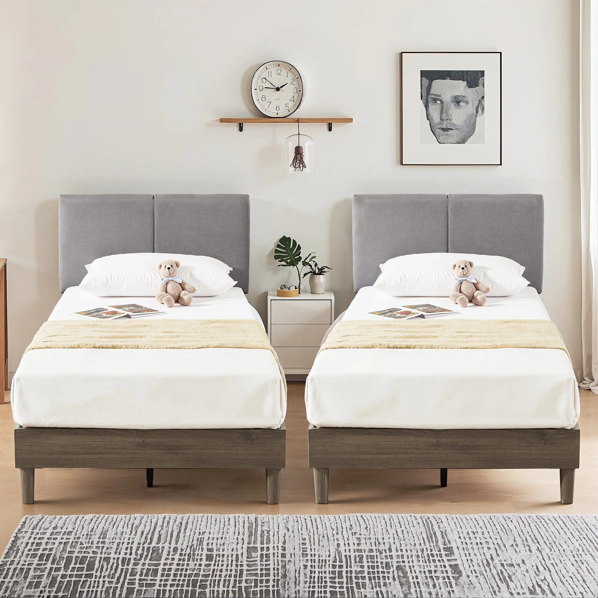 Javlergo Upholstered Platform Bed Frame with 2 USB Charging Station & Adjustable Headboard, Kids Bed Set of 2
