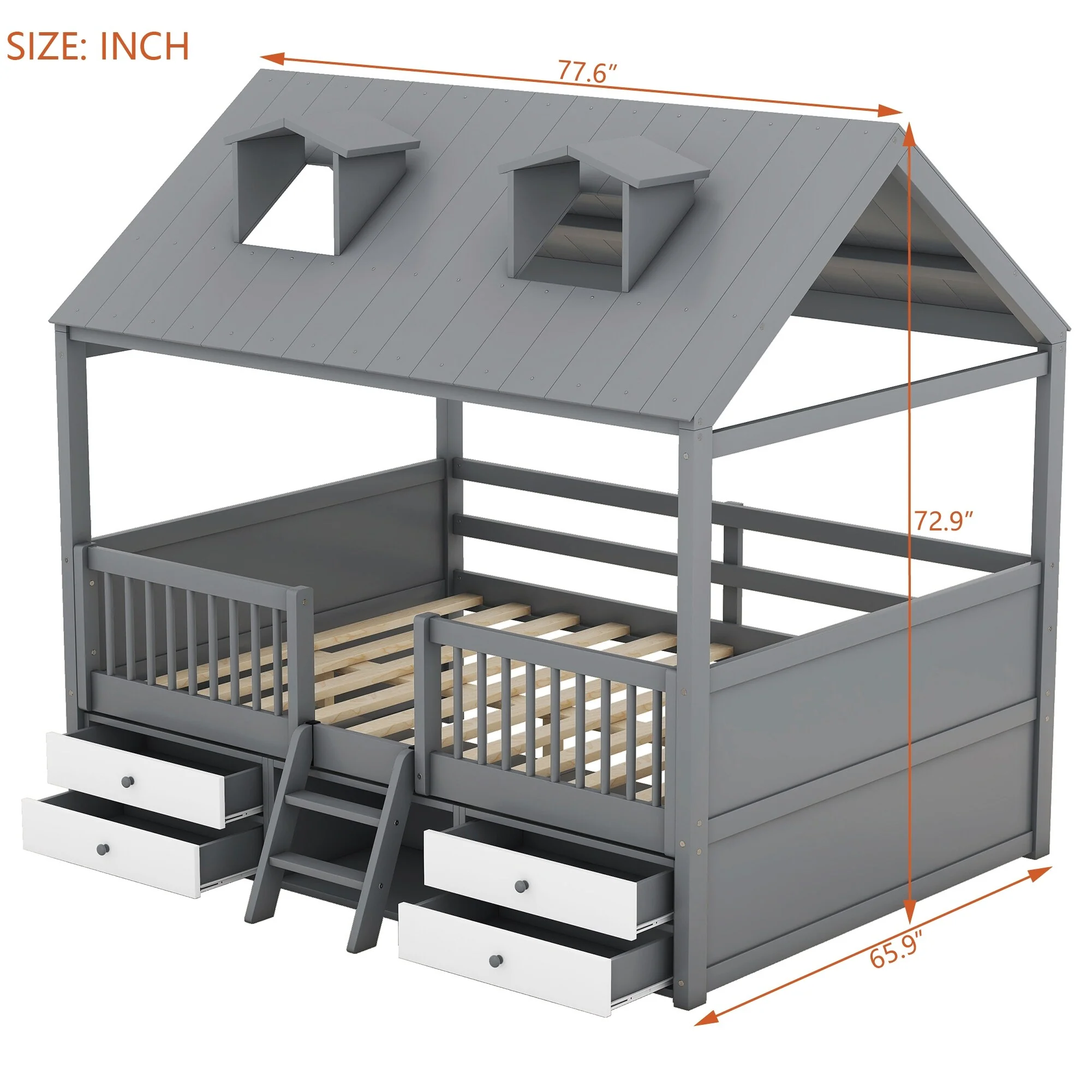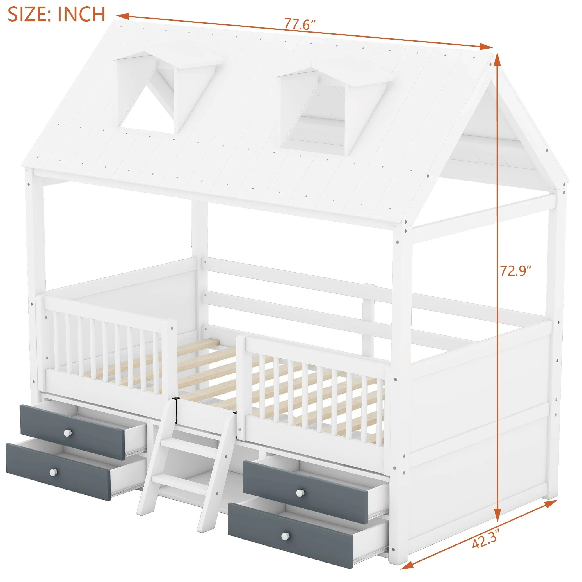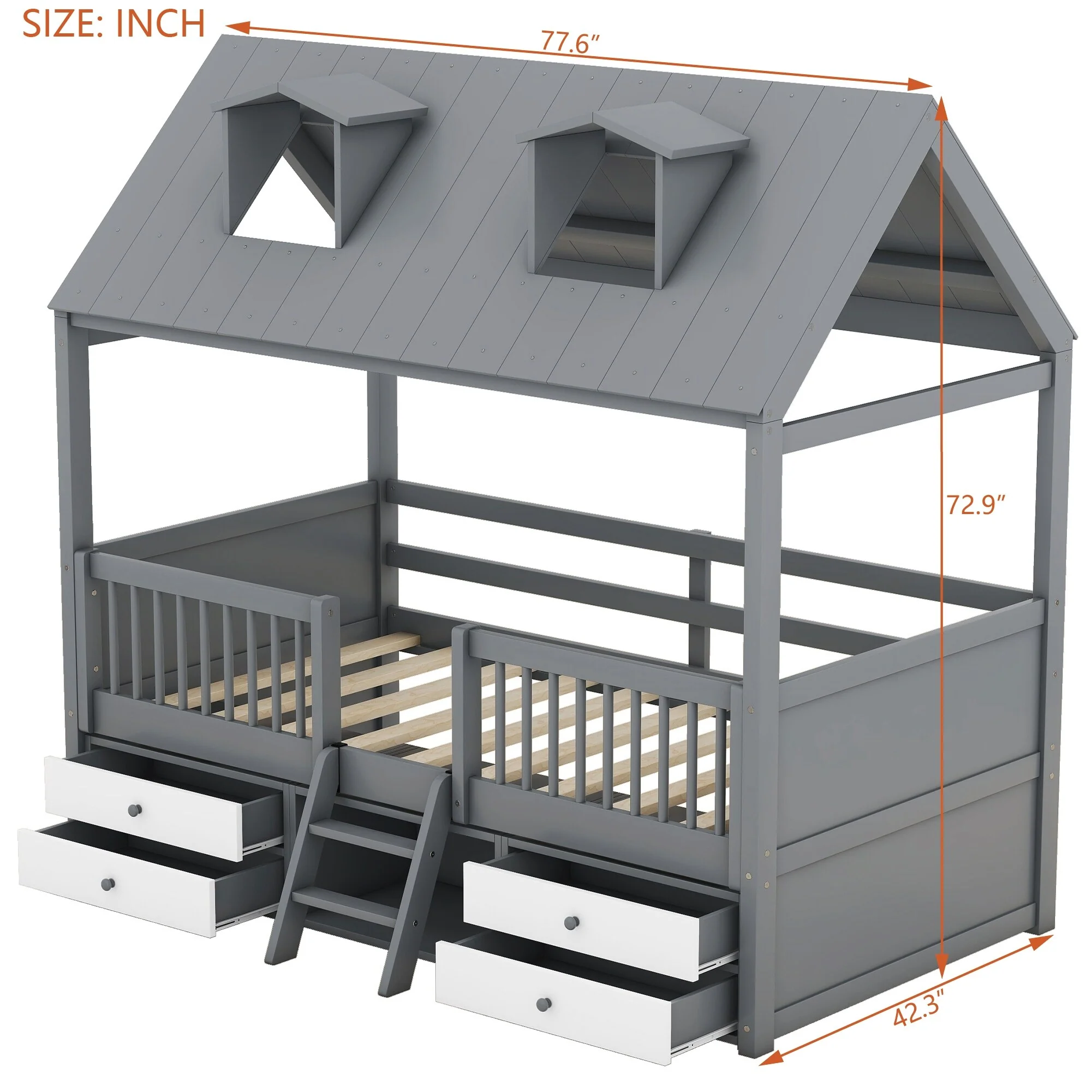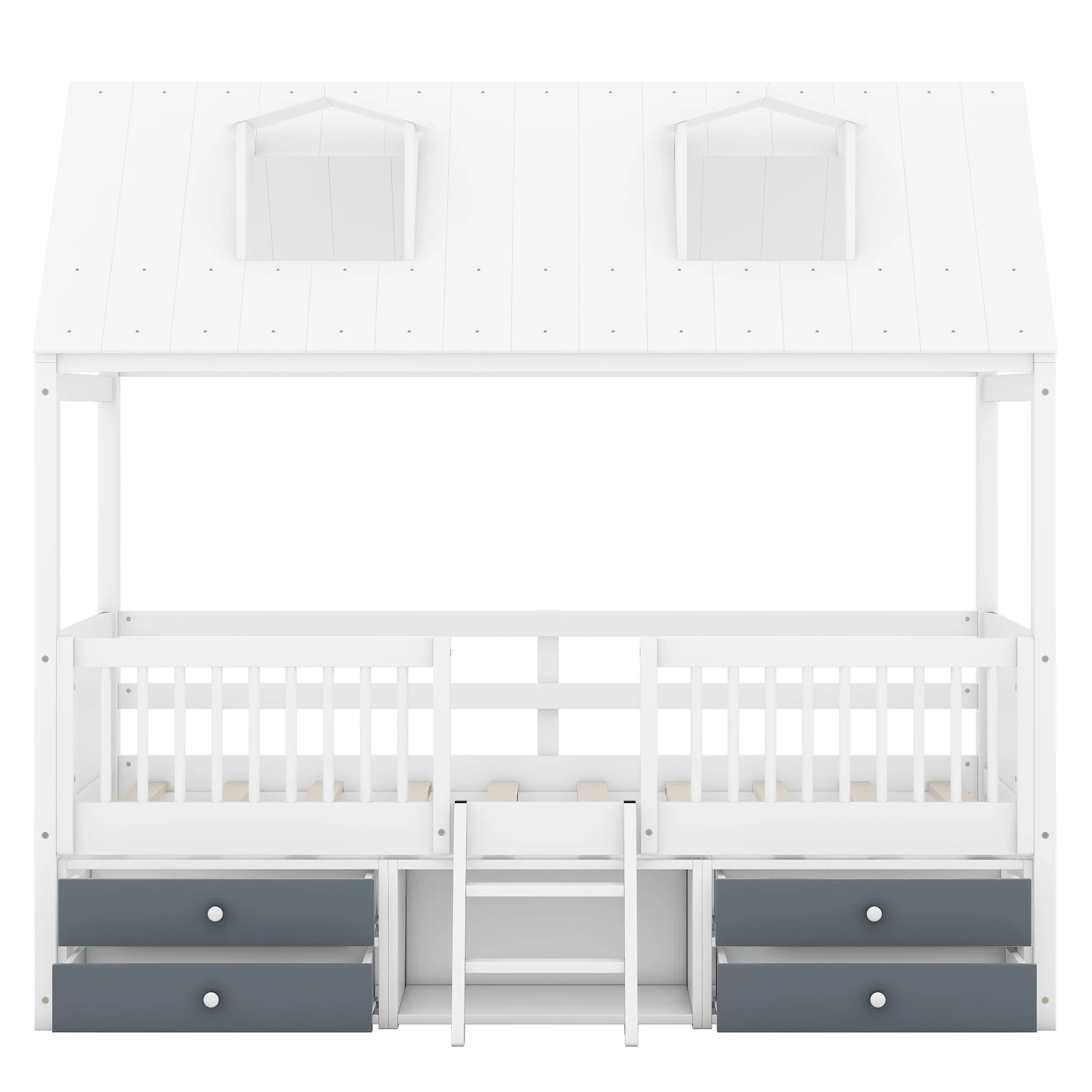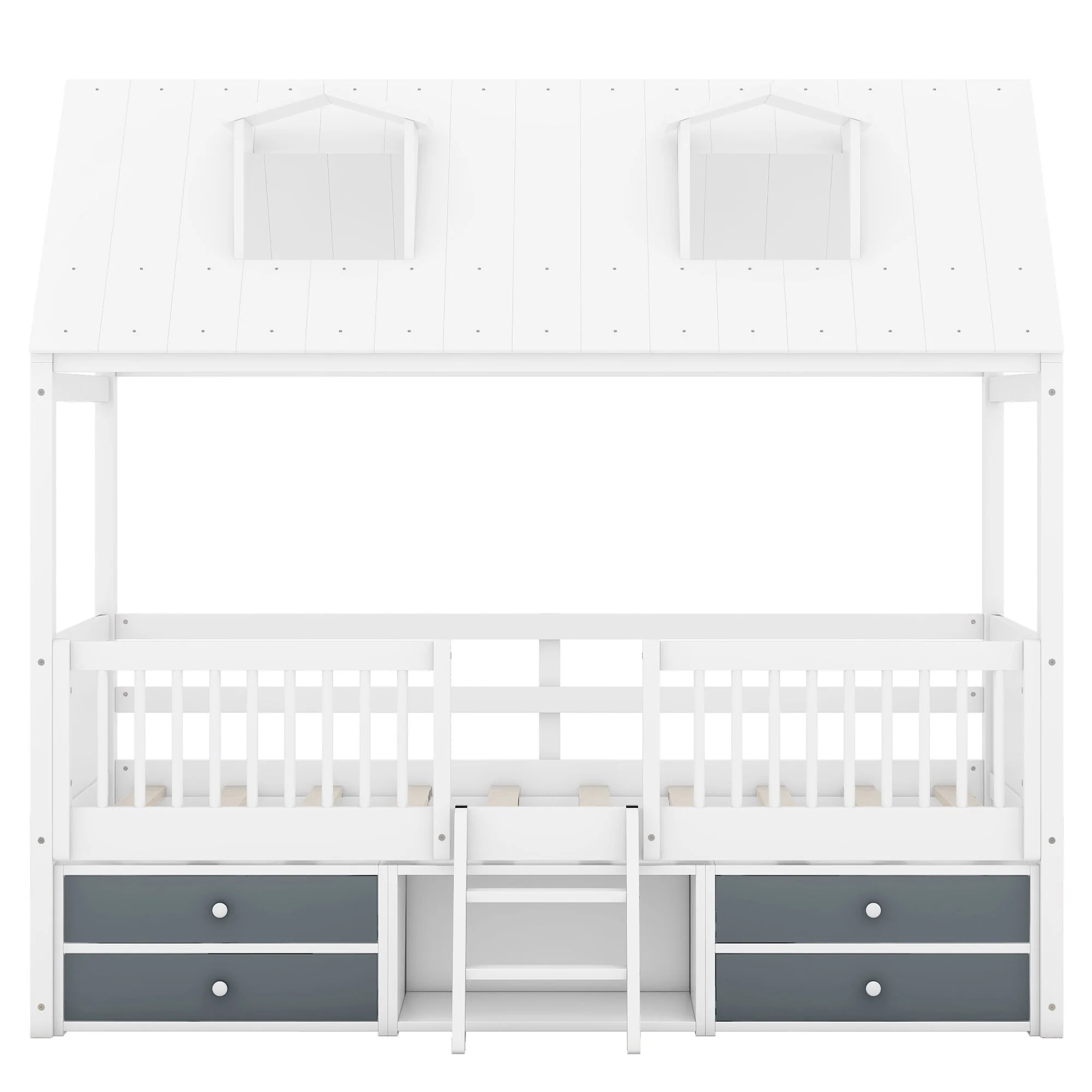 House-shaped Bed Frame Twin Over Twin Bunk Bed with Roof, Door, Windows, Guardrails and Ladder, No Slats on Lower Bed