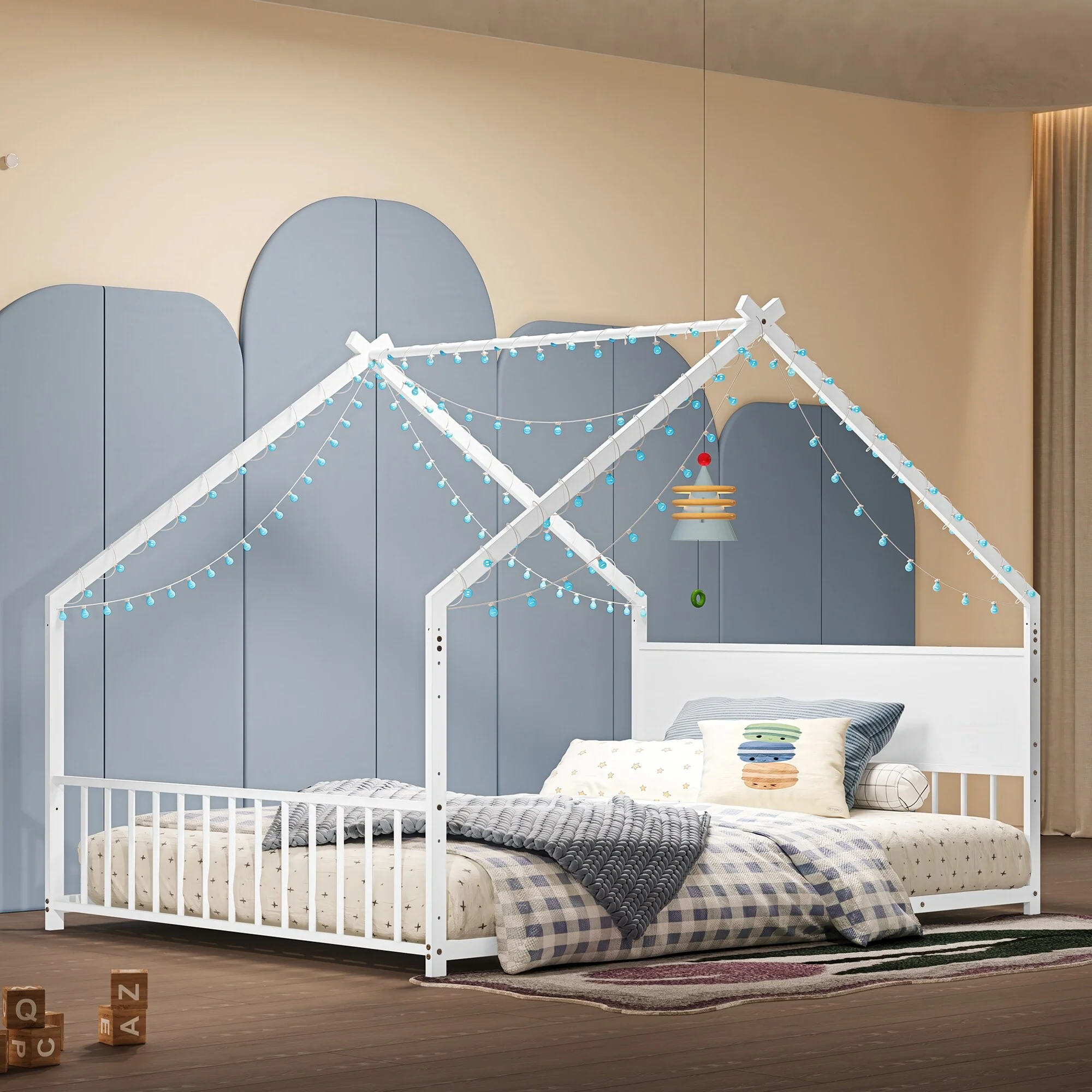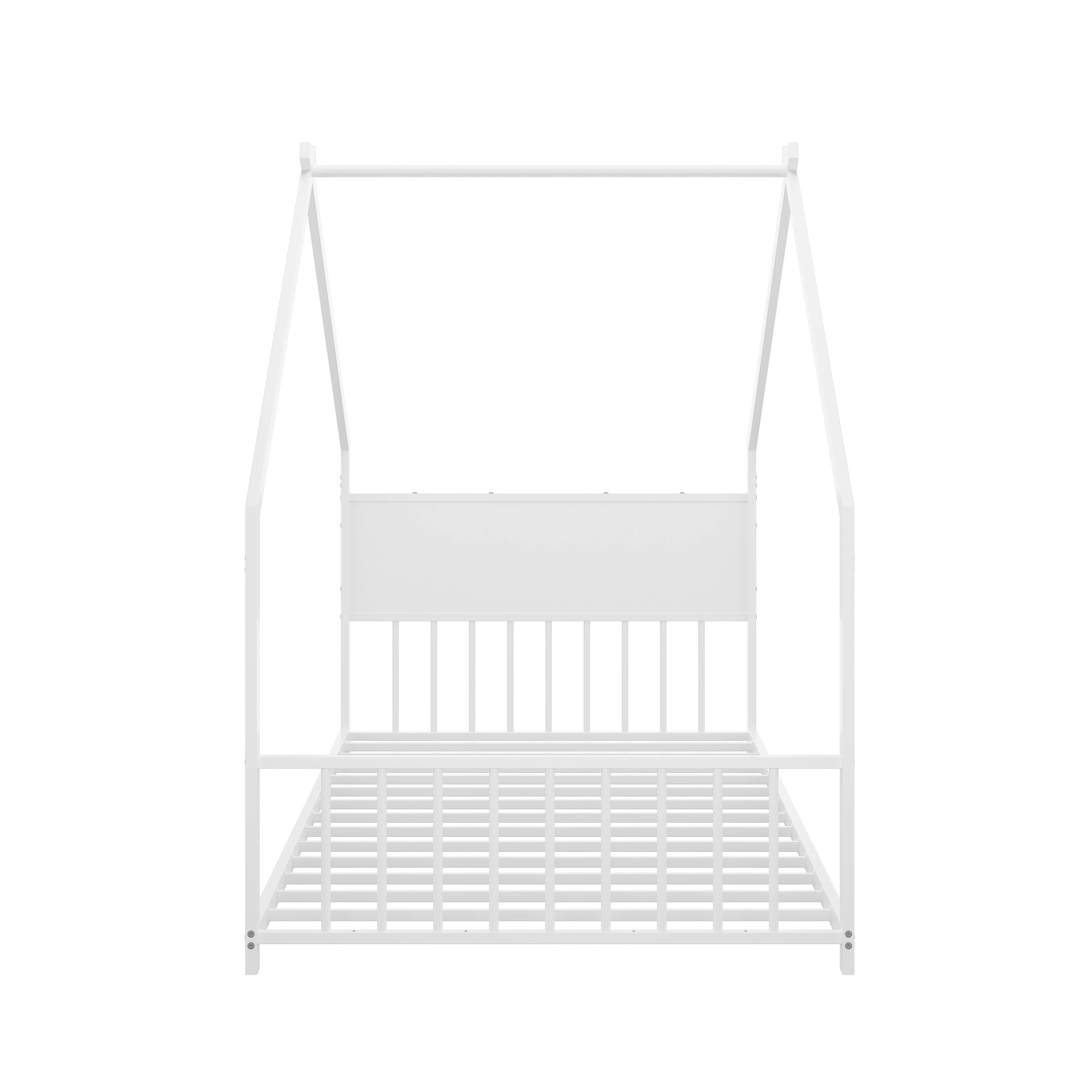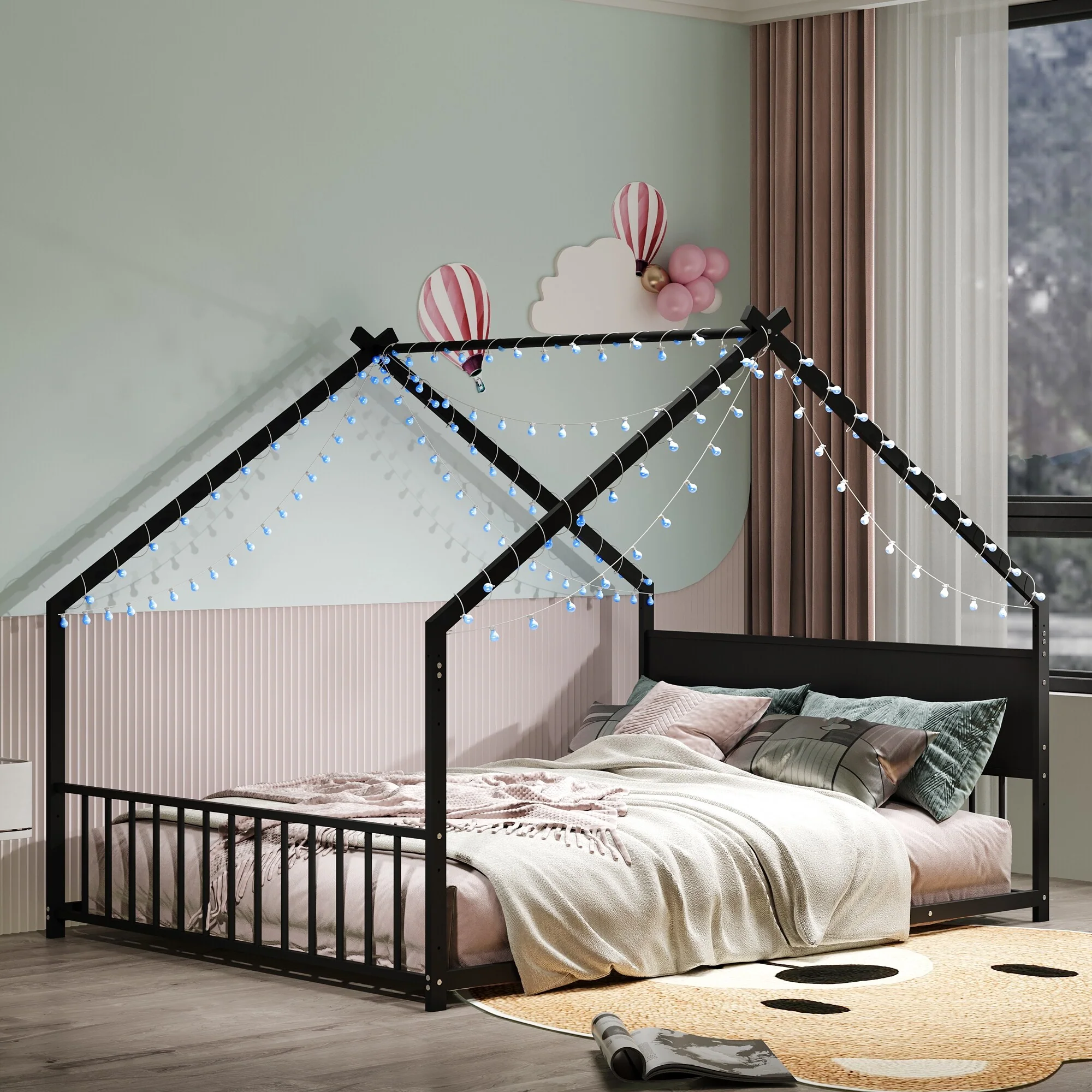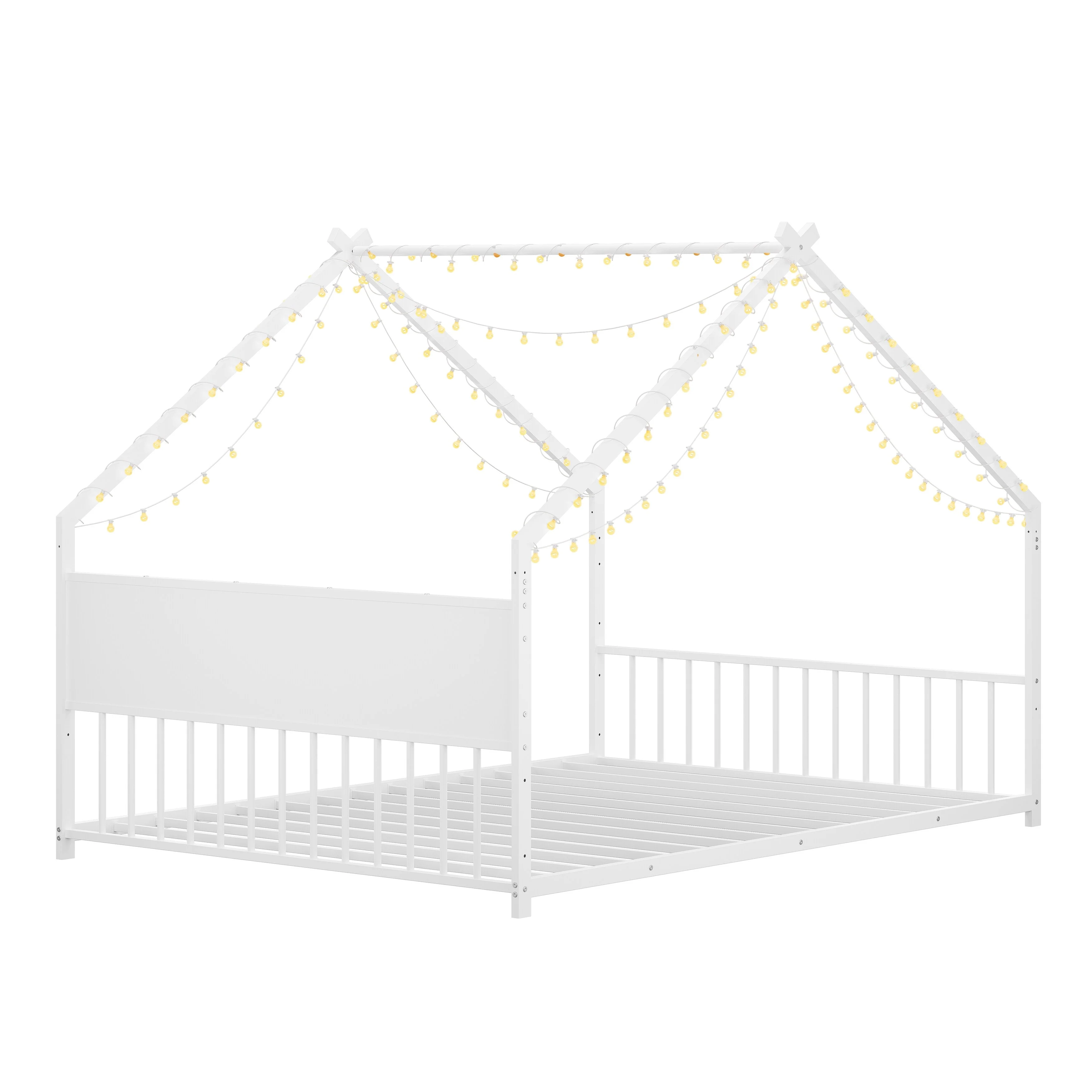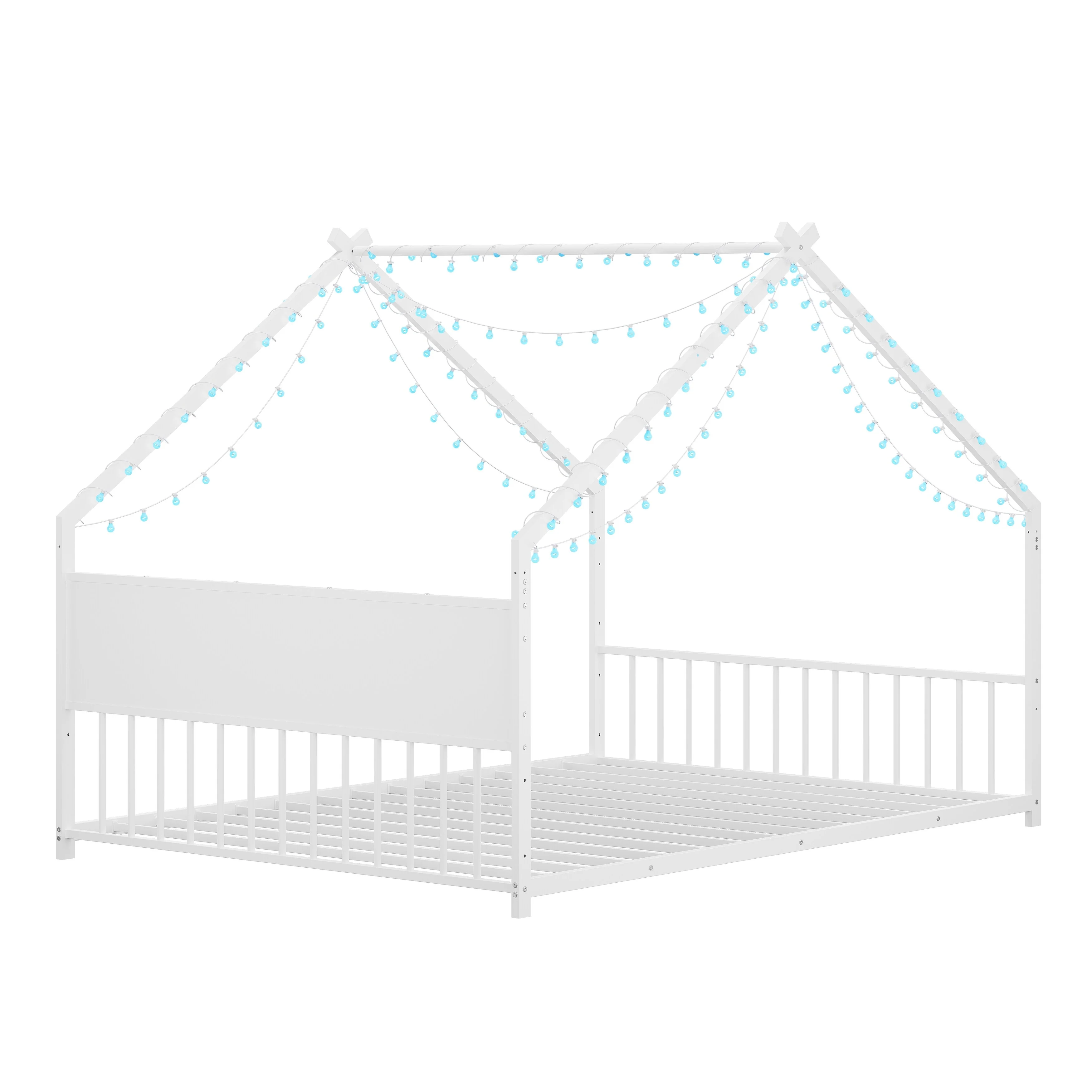 House Bed with Roof and Colorful Lights, House-shaped Frame Floor Bed with House Roof Frame, Metal Bed Frame with Slats and Legs