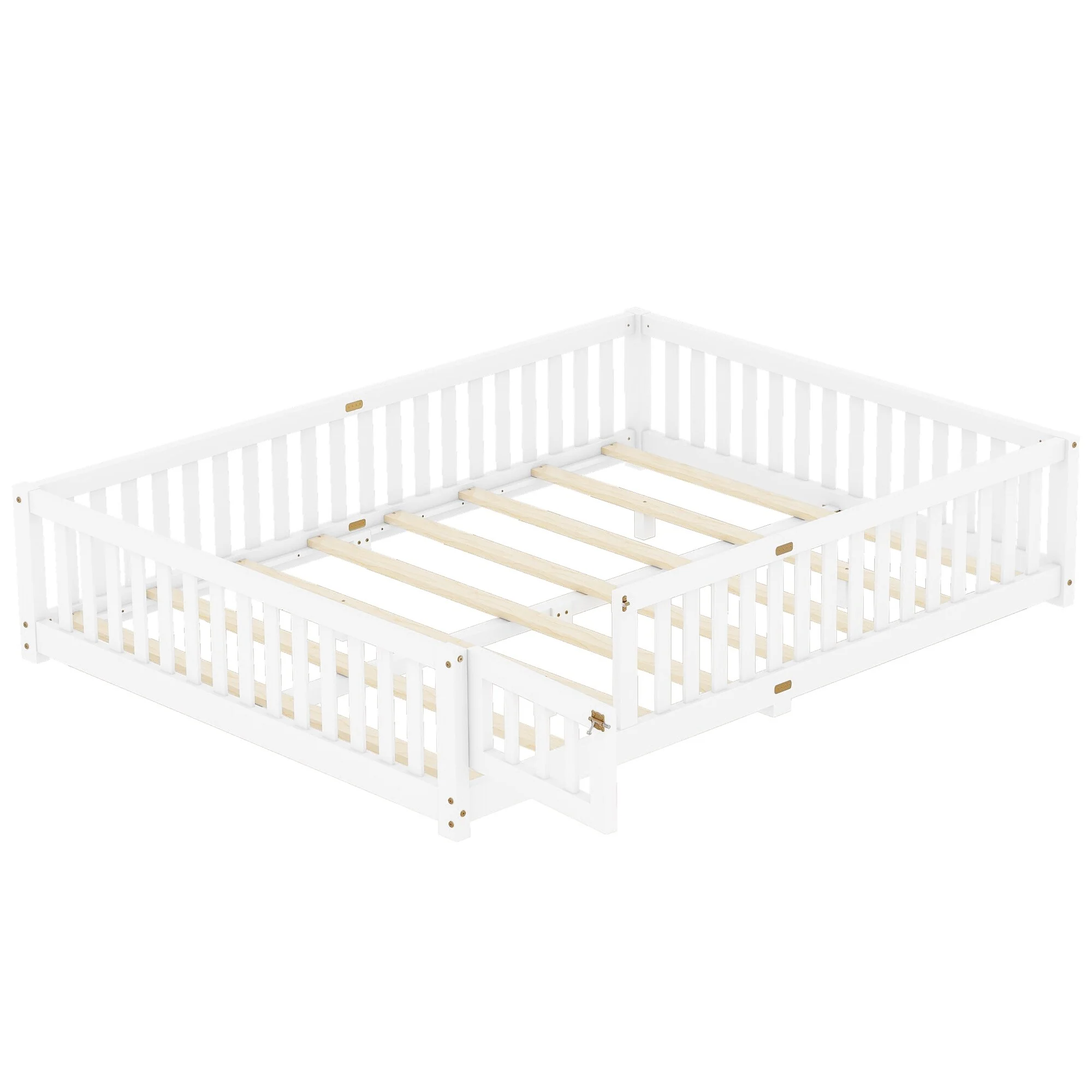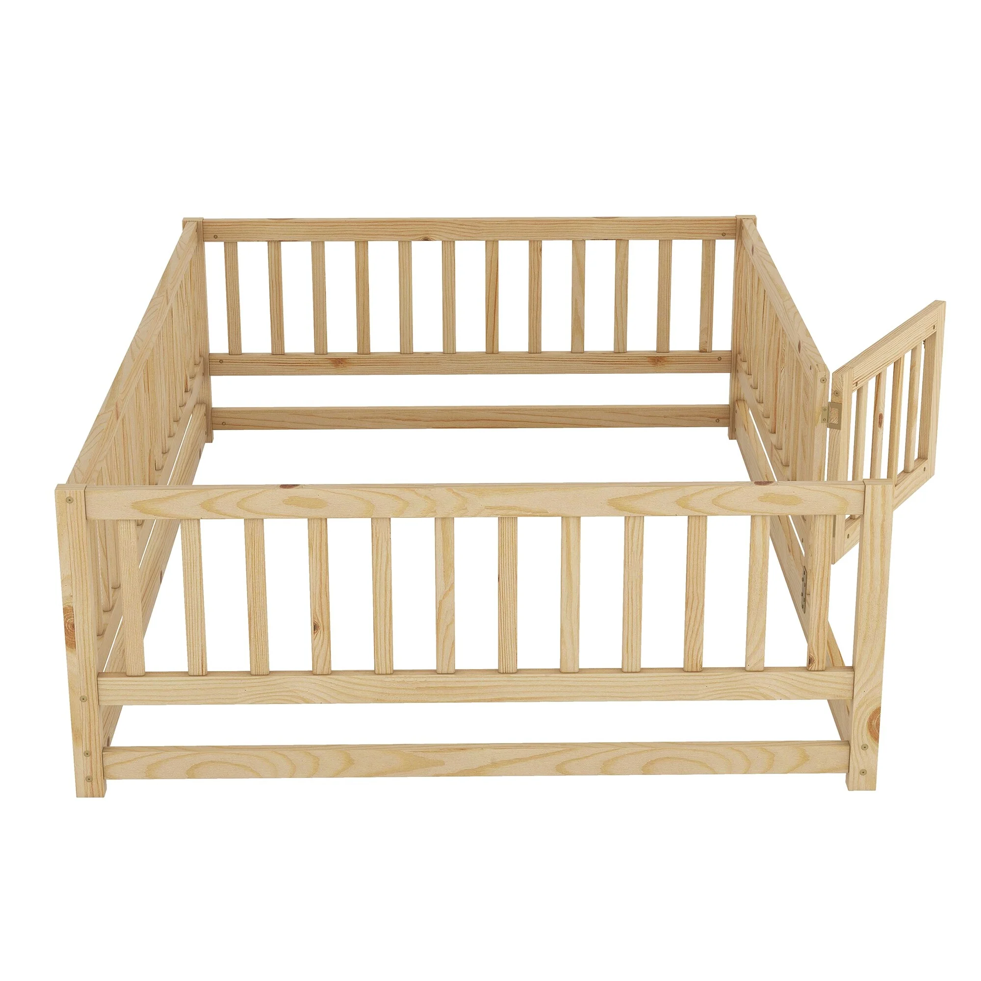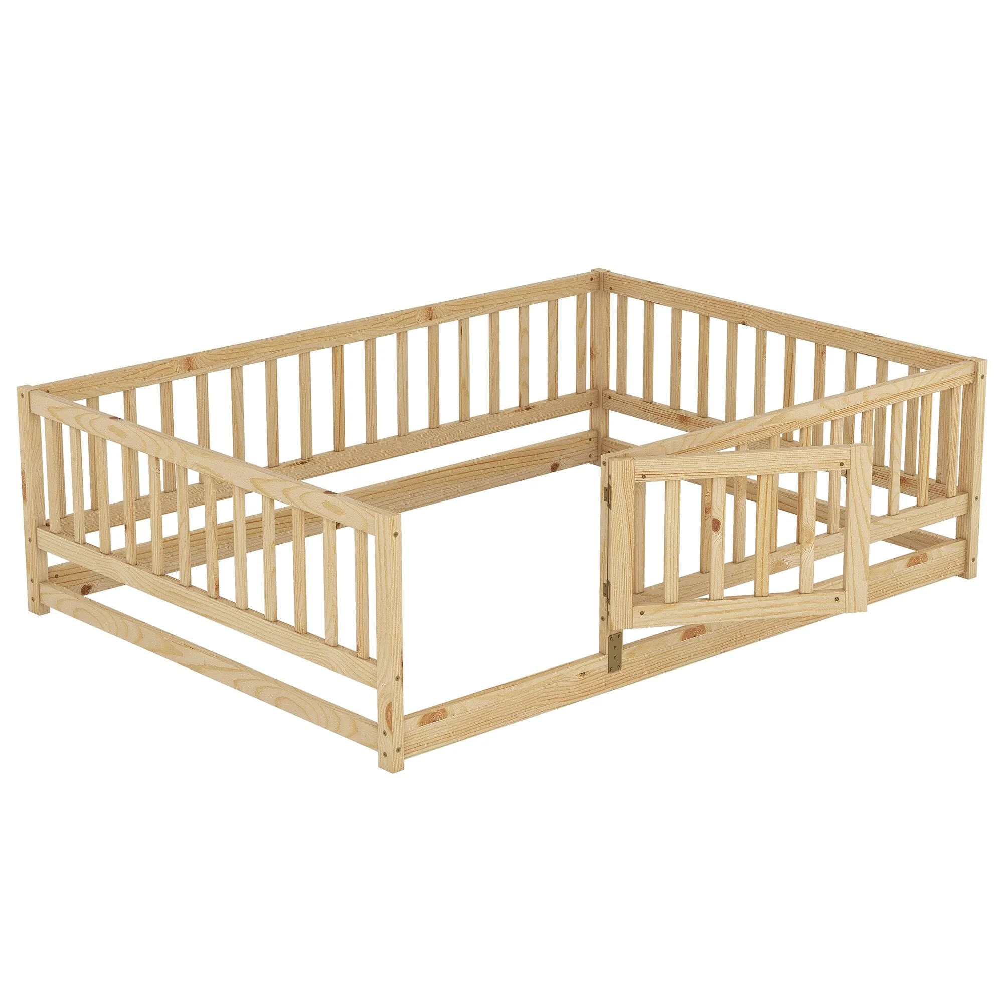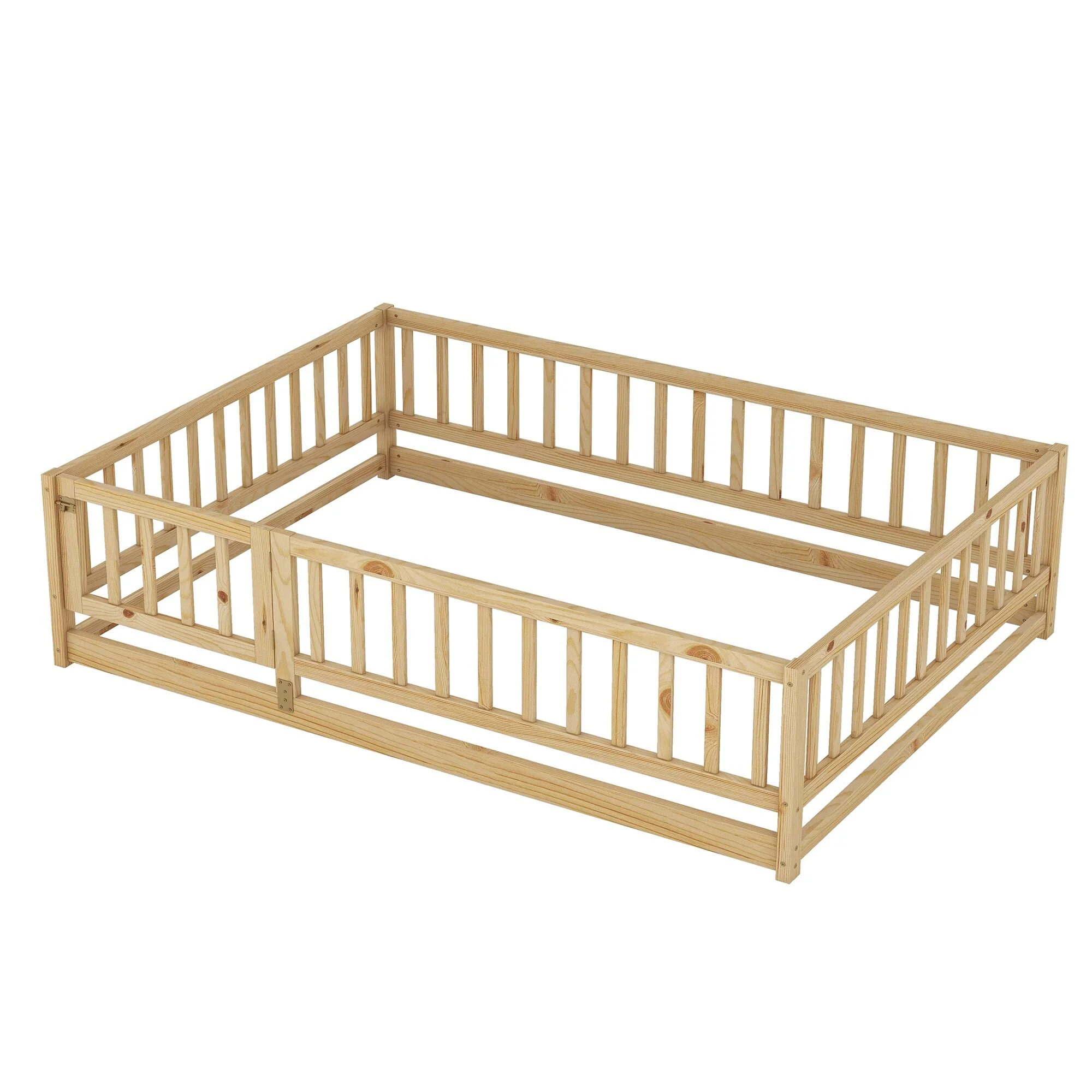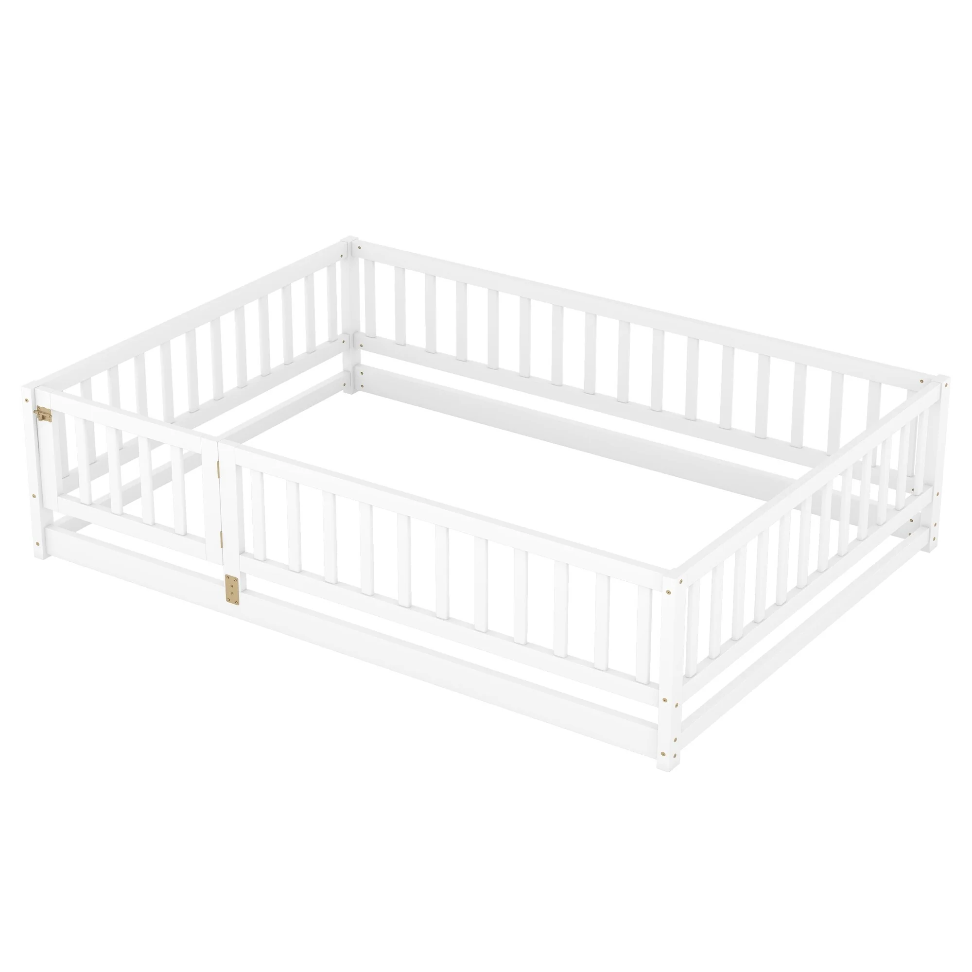 Queen Size Floor Bed Frame for Kids Bed with Fence Guardrails and Removable Door, Slats Playroom Montessori Platform Bed